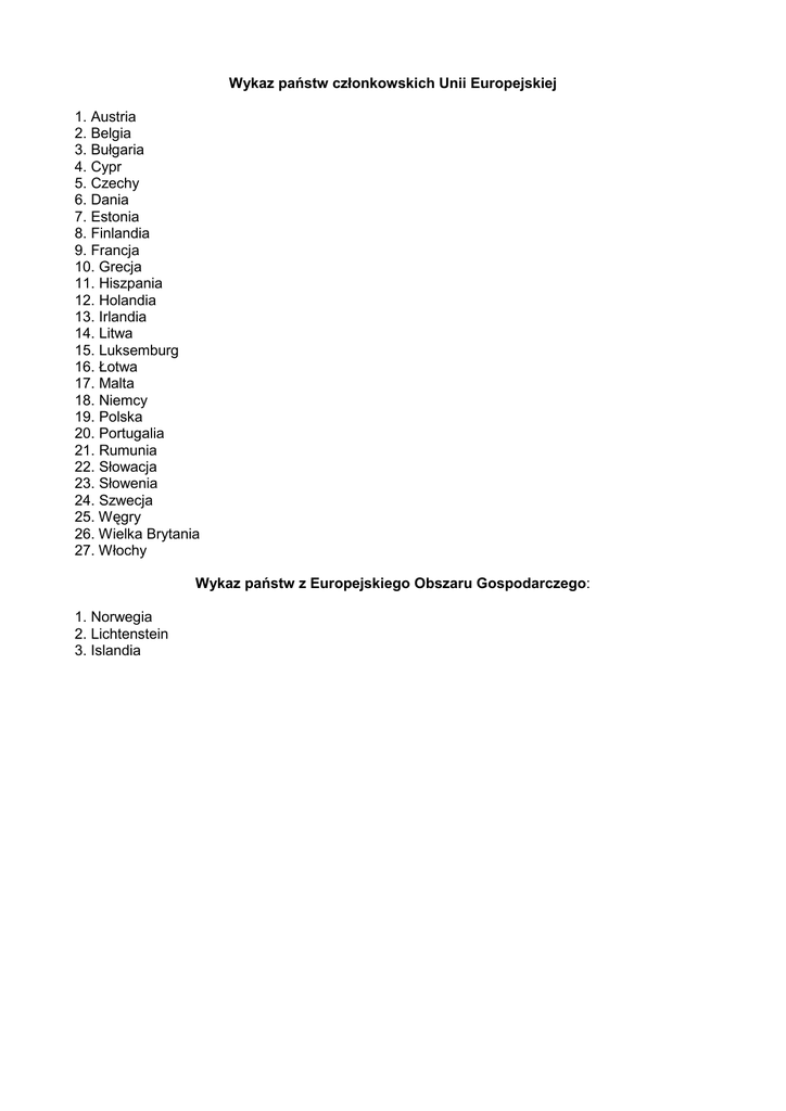 Wykaz państw członkowskich Unii Europejskiej 1. Austria 2. Belgia 3. Bułgaria 4. Cypr 5. Czechy 6. Dania 7. Estonia 8. Finlandia 9. Francja 10. Grecja 11. Hiszpania 12. Holandia 13. Irlandia 14. Litwa 15. Luksemburg 16. Łotwa 17. Malta 18. Niemcy 19. Polska 20. Portugalia 21. Rumunia 22. Słowacja 23. Słowenia 24. Szwecja 25. Węgry 26. Wielka Brytania 27. Włochy Wykaz państw z Europejskiego Obszaru Gospodarczego: 1. Norwegia 2. Lichtenstein 3. Islandia