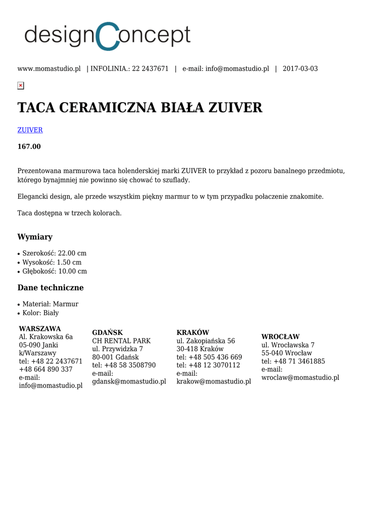 www.momastudio.pl | INFOLINIA.: 22 2437671 | e-mail: [email protected] | 2017-03-03 TACA CERAMICZNA BIAŁA ZUIVER ZUIVER 167.00 Prezentowana marmurowa taca holenderskiej marki ZUIVER to przykład z pozoru banalnego przedmiotu, którego bynajmniej nie powinno się chować to szuflady. Elegancki design, ale przede wszystkim piękny marmur to w tym przypadku połaczenie znakomite. Taca dostępna w trzech kolorach. Wymiary ● ● ● Szerokość: 22.00 cm Wysokość: 1.50 cm Głębokość: 10.00 cm Dane techniczne ● ● Materiał: Marmur Kolor: Biały WARSZAWA Al. Krakowska 6a 05-090 Janki k/Warszawy tel: +48 22 2437671 +48 664 890 337 e-mail: [email protected] GDAŃSK CH RENTAL PARK ul. Przywidzka 7 80-001 Gdańsk tel: +48 58 3508790 e-mail: [email protected] KRAKÓW ul. Zakopiańska 56 30-418 Kraków tel: +48 505 436 669 tel: +48 12 3070112 e-mail: [email protected] WROCŁAW ul. Wrocławska 7 55-040 Wrocław tel: +48 71 3461885 e-mail: [email protected]