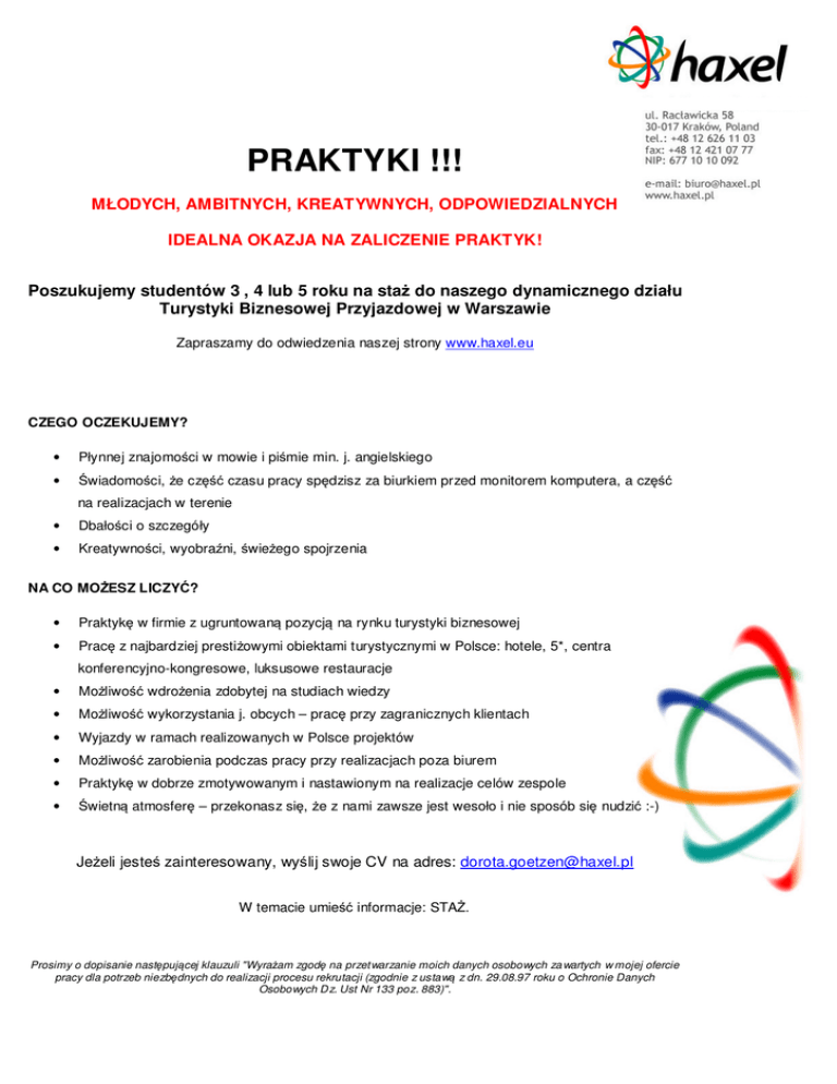 PRAKTYKI !!! MŁODYCH, AMBITNYCH, KREATYWNYCH, ODPOWIEDZIALNYCH IDEALNA OKAZJA NA ZALICZENIE PRAKTYK! Poszukujemy studentów 3 , 4 lub 5 roku na staż do naszego dynamicznego działu Turystyki Biznesowej Przyjazdowej w Warszawie Zapraszamy do odwiedzenia naszej strony www.haxel.eu CZEGO OCZEKUJEMY? • Płynnej znajomości w mowie i piśmie min. j. angielskiego • Świadomości, że część czasu pracy spędzisz za biurkiem przed monitorem komputera, a część na realizacjach w terenie • Dbałości o szczegóły • Kreatywności, wyobraźni, świeżego spojrzenia NA CO MOŻESZ LICZYĆ? • Praktykę w firmie z ugruntowaną pozycją na rynku turystyki biznesowej • Pracę z najbardziej prestiżowymi obiektami turystycznymi w Polsce: hotele, 5*, centra konferencyjno-kongresowe, luksusowe restauracje • Możliwość wdrożenia zdobytej na studiach wiedzy • Możliwość wykorzystania j. obcych – pracę przy zagranicznych klientach • Wyjazdy w ramach realizowanych w Polsce projektów • Możliwość zarobienia podczas pracy przy realizacjach poza biurem • Praktykę w dobrze zmotywowanym i nastawionym na realizacje celów zespole • Świetną atmosferę – przekonasz się, że z nami zawsze jest wesoło i nie sposób się nudzić :-) Jeżeli jesteś zainteresowany, wyślij swoje CV na adres: [email protected] W temacie umieść informacje: STAŻ. Prosimy o dopisanie następującej klauzuli "Wyrażam zgodę na przetwarzanie moich danych osobowych za wartych w mojej ofercie pracy dla potrzeb niezbędnych do realizacji procesu rekrutacji (zgodnie z ustawą z dn. 29.08.97 roku o Ochronie Danych Osobowych Dz. Ust Nr 133 poz. 883)".