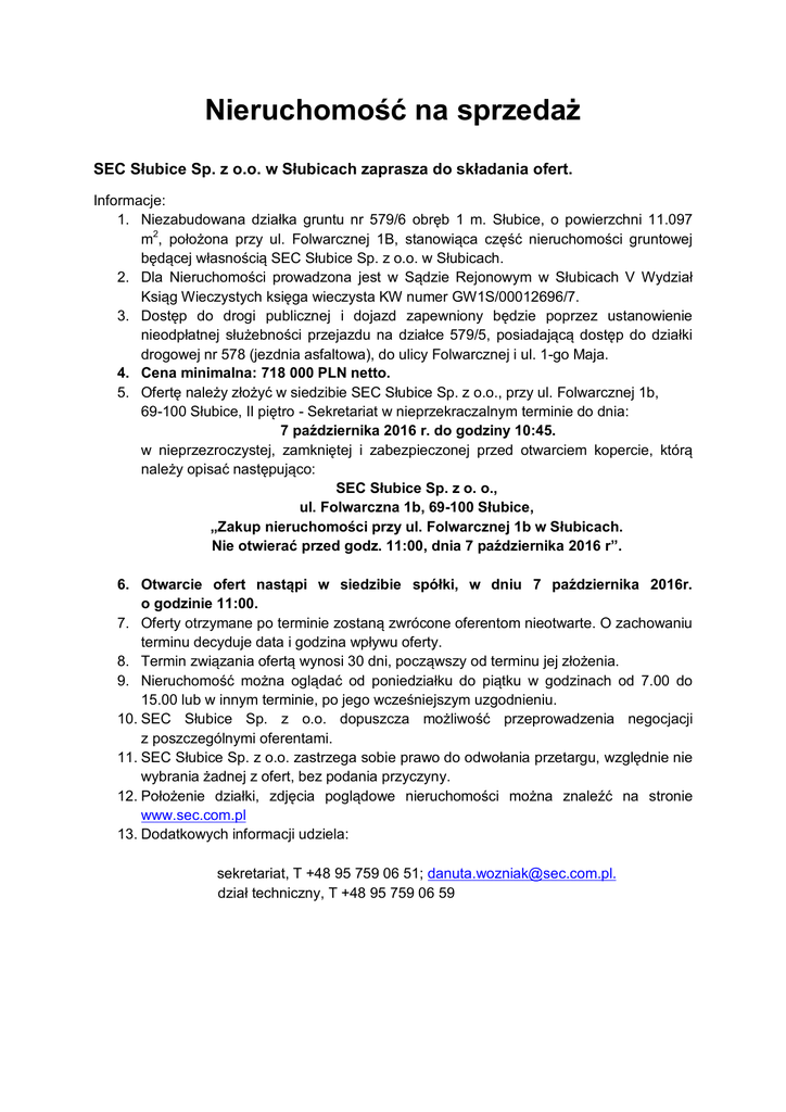 Nieruchomość na sprzedaż SEC Słubice Sp. z o.o. w Słubicach zaprasza do składania ofert. Informacje: 1. Niezabudowana działka gruntu nr 579/6 obręb 1 m. Słubice, o powierzchni 11.097 m2, położona przy ul. Folwarcznej 1B, stanowiąca część nieruchomości gruntowej będącej własnością SEC Słubice Sp. z o.o. w Słubicach. 2. Dla Nieruchomości prowadzona jest w Sądzie Rejonowym w Słubicach V Wydział Ksiąg Wieczystych księga wieczysta KW numer GW1S/00012696/7. 3. Dostęp do drogi publicznej i dojazd zapewniony będzie poprzez ustanowienie nieodpłatnej służebności przejazdu na działce 579/5, posiadającą dostęp do działki drogowej nr 578 (jezdnia asfaltowa), do ulicy Folwarcznej i ul. 1-go Maja. 4. Cena minimalna: 718 000 PLN netto. 5. Ofertę należy złożyć w siedzibie SEC Słubice Sp. z o.o., przy ul. Folwarcznej 1b, 69-100 Słubice, II piętro - Sekretariat w nieprzekraczalnym terminie do dnia: 7 października 2016 r. do godziny 10:45. w nieprzezroczystej, zamkniętej i zabezpieczonej przed otwarciem kopercie, którą należy opisać następująco: SEC Słubice Sp. z o. o., ul. Folwarczna 1b, 69-100 Słubice, „Zakup nieruchomości przy ul. Folwarcznej 1b w Słubicach. Nie otwierać przed godz. 11:00, dnia 7 października 2016 r”. 6. Otwarcie ofert nastąpi w siedzibie spółki, w dniu 7 października 2016r. o godzinie 11:00. 7. Oferty otrzymane po terminie zostaną zwrócone oferentom nieotwarte. O zachowaniu terminu decyduje data i godzina wpływu oferty. 8. Termin związania ofertą wynosi 30 dni, począwszy od terminu jej złożenia. 9. Nieruchomość można oglądać od poniedziałku do piątku w godzinach od 7.00 do 15.00 lub w innym terminie, po jego wcześniejszym uzgodnieniu. 10. SEC Słubice Sp. z o.o. dopuszcza możliwość przeprowadzenia negocjacji z poszczególnymi oferentami. 11. SEC Słubice Sp. z o.o. zastrzega sobie prawo do odwołania przetargu, względnie nie wybrania żadnej z ofert, bez podania przyczyny. 12. Położenie działki, zdjęcia poglądowe nieruchomości można znaleźć na stronie www.sec.com.pl 13. Dodatkowych informacji udziela: sekretariat, T +48 95 759 06 51; [email protected]. dział techniczny, T +48 95 759 06 59