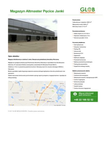 Magazyn Altmaster Pęcice Janki Powierzchnia: Całkowita pow. budynków: 9000 m2 Maksymalny moduł: 9000 m2 Minimalny moduł: 2112 m2 Parametry techniczne: • Siatka słupów (m): 22 x 9,6 m • Wysokość składowania: 10 m • Nośność posadzki: 5 t/m2 Parametry dodatkowe: Opis obiektu: Magazyn zlokalizowany w okolicach Janek, Raszyna przy południowej obwodnicy Warszawy Magazyn do wynajęcia położony przy Południowej Obwodnicy Warszawy w sąsiedztwie tras S8 (WarszawaKatowice), S7 (warszawa-Kraków) oraz łącznika z autostradą A2 (Warszawa-Poznań-Berlin) Oddalony o 15 km na południowy zachód od centrum Warszawy oraz 5 km od portu lotniczego CARGO w • Doki hydrauliczne • Duży plac manewrowy • Parking TIR • Ochrona 24h • Monitoring CCTV • Ogrzewanie • Możliwość adaptacji • Powierzchnia biurowa • Możliwa powierzchnia produkcyjna • Parking dla pracowników • Dojazd komunikacją miejską Warszawie. Bliskie sąsiedztwo węzła drogowego zapewnia sprawną obsługę logistyczną w kierunku południowym oraz Możliwe przeznaczenie obiektu zachodnim. • Składowanie towarów • Hurtownia farmaceutyczna • Składowanie towarów niebezpiecznych ADR • Centrum logistyczne • Sortownia przesyłek • Lekka produkcja • Handel hurtowy • Centrum biurowo-magazynowe Obiekt może zostać dostosowany pod konkretne wymogi najemcy związane z magazynowaniem, logistyką lub lekką produkcją. Więcej informacji pod numerem: +48 22 100 52 52 © 2017 GLOB NIERUCHOMOŚCI. Wszelkie prawa zastrzeżone.