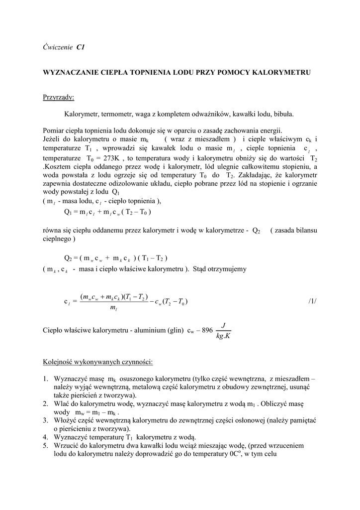 Ćwiczenie C1 WYZNACZANIE CIEPŁA TOPNIENIA LODU PRZY POMOCY KALORYMETRU Przyrządy: Kalorymetr, termometr, waga z kompletem odważników, kawałki lodu, bibuła. Pomiar ciepła topnienia lodu dokonuje się w oparciu o zasadę zachowania energii. Jeżeli do kalorymetru o masie mk ( wraz z mieszadłem ) i cieple właściwym ck i temperaturze T1 , wprowadzi się kawałek lodu o masie m l , cieple topnienia c l , temperaturze T0 = 273K , to temperatura wody i kalorymetru obniży się do wartości T2 .Kosztem ciepła oddanego przez wodę i kalorymetr, lód ulegnie całkowitemu stopieniu, a woda powstała z lodu ogrzeje się od temperatury T0 do T2. Zakładając, że kalorymetr zapewnia dostateczne odizolowanie układu, ciepło pobrane przez lód na stopienie i ogrzanie wody powstałej z lodu Q1 ( m l - masa lodu, c l - ciepło topnienia ), Q1 = m l c l + m l c w ( T2 – T0 ) równa się ciepłu oddanemu przez kalorymetr i wodę w kalorymetrze - Q2 cieplnego ) ( zasada bilansu Q2 = ( m w c w + m k c k ) ( T1 – T2 ) ( m k , c k - masa i ciepło właściwe kalorymetru ). Stąd otrzymujemy cl = (mw c w + mk c k )(T1 − T2 ) − c w (T2 − T0 ) ml Ciepło właściwe kalorymetru - aluminium (glin) cw – 896 /1/ J kg .K Kolejność wykonywanych czynności: 1. Wyznaczyć masę mk osuszonego kalorymetru (tylko część wewnętrzna, z mieszadłem – należy wyjąć wewnętrzną, metalową część kalorymetru z obudowy zewnętrznej, usunąć także pierścień z tworzywa). 2. Wlać do kalorymetru wodę, wyznaczyć masę kalorymetru z wodą m1 . Obliczyć masę wody mw = m1 – mk . 3. Włożyć część wewnętrzną kalorymetru do zewnętrznej części osłonowej (należy pamiętać o pierścieniu z tworzywa). 4. Wyznaczyć temperaturę T1 kalorymetru z wodą. 5. Wrzucić do kalorymetru dwa kawałki lodu wciąż mieszając wodę, (przed wrzuceniem lodu do kalorymetru należy doprowadzić go do temperatury 0Co, w tym celu umieszczamy go na bibułce i czekamy, aż lód zacznie się topić, gdy to nastąpi, osuszamy lód z powstałej wody – dopiero wtedy możemy wrzucić go do kalorymetru). 6. Obserwując przez cały czas mieszania wskazania termometru, odczytać najniższą temperaturę T2 wody. 7. Wyznaczyć masę kalorymetru z wodą i z lodem m2 . Obliczyć masę stopionego lodu m l = m2 - m1 . 8. Oszacować maksymalną niepewność jaką należy przypisać pomiarowi temperatur T1 i T2 . 9. Powtórzyć pomiary z punktów 2 – 6 dla dwu innych mas wody i lodu. 10. Wyniki pomiarów przedstawić w tabeli. mk [ kg ] ck mw J [ kg ] kg.K cw T0 T1 T2 J kg.K [K] [K] [ K] ∆T ml [K] [kg] 11. Obliczyć ciepło topnienia dla każdego pomiaru a następnie jego wartość średnią. 12. Przeprowadzić dyskusję niepewności pomiarowych. Wymagania: - pojęcie ciepła i temperatury z punktu widzenia kinetyczno- molekularnej teorii budowy substancji [ 2, 6 ] - definicje ciepła właściwego i ciepła topnienia oraz jednostki tych wielkości [ 2, 6 ] - pomiar ciepła topnienia za pomocą kalorymetru, wyprowadzenie wzoru [ 1 ] - zależność temperatury topnienia od ciśnienia [ 6 ]