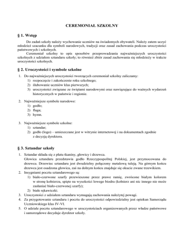 CEREMONIAŁ SZKOLNY § 1. Wstęp Do zadań szkoły należy wychowanie uczniów na świadomych obywateli. Należy zatem uczyć młodzież szacunku dla symboli narodowych, tradycji oraz zasad zachowania podczas uroczystości państwowych i szkolnych. Ceremoniał szkolny to opis sposobów przeprowadzania najważniejszych uroczystości szkolnych z udziałem sztandaru szkoły; to również zbiór zasad zachowania się młodzieży w trakcie uroczystości szkolnych. § 2. Uroczystości i symbole szkolne 1. Do najważniejszych uroczystości tworzących ceremoniał szkolny zaliczamy: 1) rozpoczęcie i zakończenie roku szkolnego; 2) ślubowanie uczniów klas pierwszych; 3) uroczystości związane ze świętami narodowymi oraz nawiązujące do ważnych wydarzeń historycznych w państwie i regionie. 2. Najważniejsze symbole narodowe: 1) godło; 2) flaga; 3) hymn. 3. Najważniejsze symbole szkolne: 1) sztandar; 2) godło (logo) – umieszczane jest w witrynie internetowej i na dokumentach zgodnie z decyzją dyrektora. § 3. Sztandar szkoły 1. Sztandar składa się z płatu tkaniny, głowicy i drzewca. Głowica sztandaru przedstawia godło Rzeczypospolitej Polskiej, jest przymocowana do drzewca. Drzewiec sztandaru jest dwudzielny połączony metalową tuleją. Na górnym końcu drzewca jest osadzona głowica, zaś na dolnym końcu znajduje się okucie zwane trzewikiem. 2. Insygniami pocztu sztandarowego są: 1) biało-czerwone szarfy przewieszone przez prawe ramię, zwrócone białym kolorem w stronę kołnierza, spięte na wysokości lewego biodra (kołnierz ani nic innego nie może zasłaniać biało-czerwonej szarfy); 2) białe rękawiczki. 3. Uroczystości z udziałem sztandaru wymagają zachowania należytej powagi. 4. Za przygotowanie sztandaru i pocztu do uroczystości odpowiedzialny jest opiekun Samorządu Uczniowskiego klas IV-VI. 5. O udziale pocztu sztandarowego w uroczystościach organizowanych przez władze państwowe i samorządowe decyduje dyrektor szkoły. 6. Poczet sztandarowy: 1) poczet sztandarowy stanowi chorąży i asysta; 2) w skład pocztu wchodzą uczniowie o nienagannej postawie, wzorowym zachowaniu i dobrych wynikach w nauce; 3) skład pocztu ustala opiekun Samorządu Uczniowskiego klas IV-VI w porozumieniu z wychowawcami klas piątych i dyrektorem szkoły; 4) kadencja pocztu trwa rok; 5) oprócz zasadniczego składu pocztu sztandarowego, wybiera się skład rezerwowy; 6) w skład rezerwowego pocztu mogą wchodzić nauczyciele, rodzice oraz w razie potrzeby uczniowie wskazani w inny sposób niż w p. 3; 7) decyzją rady pedagogicznej można odwołać członka pocztu sztandarowego; od tej decyzji przysługuje odwołanie do dyrektora szkoły; 8) chorążego i asystę obowiązuje odświętny ubiór (uczeń: biała koszula i czarne spodnie, uczennice: biała bluzka i czarne spódnice jednakowej długości. Uwaga. Gdy uroczystości odbywają się na zewnątrz budynku w trudnych warunkach pogodowych, dopuszczalny jest inny taktowny strój. 7. Chwyty sztandarem. 1) Po komendach: „Poczet stój!” (po marszu) lub „Baczność!” obowiązuje postawa „zasadnicza”. Sztandar postawiony na trzewiku drzewca przy prawej nodze na wysokości czubka buta. Drzewce podtrzymywane prawą ręką powyżej pasa, łokieć prawej ręki lekko przyciśnięty do ciała. Lewa ręka w postawie zasadniczej. 2) Po komendach: „Spocznij!”; „Po ślubowaniu!”, „Po hymnie!” obowiązuje postawa „spocznij” (następuje tu automatycznie wyrównanie linii i odległości). Sztandar trzymany przy prawej nodze, jak w postawie zasadniczej. Chorąży i asysta pozostają w postawie spocznij - ciężar ciała przenoszą na prawą nogę przy jednoczesnym wysunięciu pięty lewej stopy na wysokość środka prawej, przy jednoczesnym skręcie lewej o 45 stopni w lewą stronę. 3) Po komendzie: „Sztandar Szkoły Podstawowej nr 3 im. Obrońców Westerplatte w Gostyninie wprowadzić! (wyprowadzić)” obowiązuje postawa „na ramię sztandar”. Chorąży przesuwa prawą rękę po drzewcu na wysokość prawego barku, przy jednoczesnym położeniu lewej na drzewcu na wysokości pasa. Po przebrzmieniu zapowiedzi komendy: „sztandar” energicznym ruchem przenosi drzewce sztandaru na prawy bark, zatrzymując go w pochyleniu (około 45) stopni. Płachta sztandaru musi być oddalona od barku przynajmniej na szerokość dłoni. 4) Po komendzie: Do ślubowania! oraz podczas wykonywania hymnu obowiązuje postawa „salutowanie sztandarem”. I wersja. Chorąży wysuwa lewą nogę w przód na odległość jednej stopy i pochyla sztandar w przód do kąta 45 stopni. Ręka lewa pozostaje co najmniej w odległości dłoni od płachty sztandaru. II wersja. Chorąży przesuwa lewą nogę w tył. Trzewik sztandaru opiera na podłożu przy lewej stopie i pochyla sztandar w przód tak daleko, na ile pozwala długość 2 wyprostowanej prawej ręki trzymującej drzewiec sztandaru; uchwyt drzewca w odległości dłoni od płachty sztandaru. § 4. Przebieg uroczystości z udziałem sztandaru 1. Część oficjalna uroczystości rozpoczęcia i zakończenia roku szkolnego oraz akademii. Osoba prowadząca uroczystość podaje komendy: - Proszę powstać. Baczność! - Sztandar Szkoły Podstawowej nr 3 im. Obrońców Westerplatte w Gostyninie wprowadzić! Wszyscy zgromadzeni bez nakryć głowy, zachowują postawę zasadniczą. Poczet sztandarowy przyjmuje postawę „na ramię sztandar” i wchodzi na miejsce uroczystości. Jeśli droga przemarszu jest wąska, poczet może iść „gęsiego”, przy czym osoba trzymająca sztandar idzie w środku. W trakcie przemarszu wszyscy stoją. Poczet zajmuje miejsce po lewej lub prawej stronie sali, przodem do zgromadzonych i przyjmuje „postawę zasadniczą”. Po zajęciu miejsca przez poczet sztandarowy, prowadzący podaje komendę: Do hymnu! Uczniowie odśpiewują hymn państwowy „Mazurek Dąbrowskiego”. W trakcie hymnu sztandar jest w postawie „salutowanie sztandarem”. Po