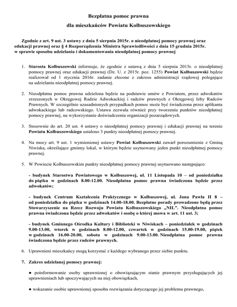 Bezpłatna pomoc prawna dla mieszkańców Powiatu Kolbuszowskiego Zgodnie z art. 9 ust. 3 ustawy z dnia 5 sierpnia 2015r. o nieodpłatnej pomocy prawnej oraz edukacji prawnej oraz § 4 Rozporządzenia Ministra Sprawiedliwości z dnia 15 grudnia 2015r. w sprawie sposobu udzielania i dokumentowania nieodpłatnej pomocy prawnej 1. Starosta Kolbuszowski informuje, że zgodnie z ustawą z dnia 5 sierpnia 2015r. o nieodpłatnej pomocy prawnej oraz edukacji prawnej (Dz. U. z 2015r. poz. 1255) Powiat Kolbuszowski będzie realizował od 1 stycznia 2016r. zadanie zlecone z zakresu administracji rządowej polegające na udzielaniu nieodpłatnej pomocy prawnej. 2. Nieodpłatna pomoc prawna udzielona będzie na podstawie umów z Powiatem, przez adwokatów zrzeszonych w Okręgowej Radzie Adwokackiej i radców prawnych z Okręgowej Izby Radców Prawnych. W szczególnie uzasadnionych przypadkach pomoc może być świadczona przez aplikanta adwokackiego lub radcowskiego. Ustawa zezwala również przy tworzeniu punktów nieodpłatnej pomocy prawnej, na wykorzystanie doświadczenia organizacji pozarządowych. 3. Stosownie do art. 20 ust. 4 ustawy o nieodpłatnej pomocy prawnej i edukacji prawnej na terenie Powiatu Kolbuszowskiego ustalono 3 punkty nieodpłatnej pomocy prawnej. 4. Na mocy art. 9 ust. 1 wymienionej ustawy Powiat Kolbuszowski zawarł porozumienie z Gminą Niwiska, określające gminny lokal, w którym będzie usytuowany jeden punkt nieodpłatnej pomocy prawnej. 5. W Powiecie Kolbuszowskim punkty nieodpłatnej pomocy prawnej usytuowano następująco: - budynek Starostwa Powiatowego w Kolbuszowej, ul. 11 Listopada 10 – od poniedziałku do piątku w godzinach 8.00-12.00. Nieodpłatna pomoc prawna świadczona będzie przez adwokatów; - budynek Centrum Kształcenia Praktycznego w Kolbuszowej, ul. Jana Pawła II 8 – od poniedziałku do piątku w godzinach 14.00-18.00. Bezpłatne porady prowadzone będą przez Stowarzyszenie na Rzecz Rozwoju Powiatu Kolbuszowskiego „NIL”. Nieodpłatna pomoc prawna świadczona będzie przez adwokatów i osobę o której mowa w art. 11 ust. 3; - budynek Gminnego Ośrodka Kultury i Biblioteki w Niwiskach – poniedziałek w godzinach 9.00-13.00, wtorek w godzinach 8.00-12.00, czwartek w godzinach 15.00-19.00, piątek w godzinach 16.00-20.00, sobota w godzinach 9.00-13.00. Nieodpłatna pomoc prawna świadczona będzie przez radców prawnych. 6. Uprawnieni mieszkańcy mogą korzystać z każdego wybranego przez siebie punktu. 7. Zakres udzielanej pomocy prawnej: ● poinformowanie osoby uprawnionej o obowiązującym stanie prawnym przysługujących jej uprawnieniach lub spoczywających na niej obowiązkach, ● wskazanie osobie uprawnionej sposobu rozwiązania dotyczącego jej problemu prawnego, ● pomoc w sporządzeniu wymagającego wiedzy prawniczej projektu pisma w zakresie niezbędnym do udzielania pomocy, z wyłączeniem pism procesowych w postępowaniach przygotowawczym lub sądowym i pism postępowaniu sądowo-administracyjnym, ● sporządzanie projektu pisma o zwolnienie od kosztów sądowych lub o ustanowienie pełnomocnika z urzędu. 8. Pomoc nie będzie obejmowała spraw z zakresu prawa celnego, dewizowego, handlowego i działalności gospodarczej, z wyjątkiem przygotowywania do jej rozpoczęcia. Zasady udzielania nieodpłatnej pomocy prawnej: Zgodnie z ustawą z dnia 5 sierpnia 2015 r. o nieodpłatnej pomocy prawnej oraz edukacji prawnej ( Dz. U. z 2015 r., poz. 1255) Osoby uprawnione Lp. Nieodpłatna pomoc prawna przysługuje osobie fizycznej, zwanej dalej „osoba uprawnioną”: Której w okresie 12 miesięcy poprzedzających zwrócenie się o udzielenie pomocy nieodpłatnej prawnej zostało przyznane świadczenie z pomocy społecznej na podstawie ustawy z dnia 12 marca 1. 2004 r. o pomocy społecznej (Dz.U z 2015 r., poz. 163 z późn. Zm.) i wobec której w tym okresie nie wydano decyzji o zwrocie nienależnie pobranego świadczenia Sposób wykazania uprawnienia do uzyskania nieodpłatnej pomocy prawnej Wykazuje przez przedłożenie oryginału albo odpisu decyzji o przyznaniu świadczenia z pomocy społecznej lub zaświadczenia, o którym mowa w art. 106 ust. 2 2 ustawy z dnia 12 marca 2004r. o pomocy społecznej. Osoba uprawniona, przed uzyskaniem nieodpłatnej pomocy prawnej składa pisemne oświadczenie, że nie wydano wobec niej decyzji o zwrocie nienależnie pobranego świadczenia Która posiada ważną Kartę Dużej Rodziny, Wykazuje przez przedłożenie ważnej karty Dużej 2. o której mowa w ustawie z dnia 5 grudnia 2014 r. Rodziny, o której mowa w ustawie z dnia 5 o Karcie Dużej Rodziny ( Dz. U. poz. 1863) grudnia 2014 r. o Karcie Dużej Rodziny Która uzyskała zaświadczenie, o którym mowa w ustawi z dnia 24 stycznia 1991 r. o kombatantach 3. oraz niektórych osobach będących ofiarami represji wojennych i okresu powojennego ( dz. U z 2014 r poz. 1206 oraz 2015 r. poz. 693) Wykazuje przez przedłożenie zaświadczenia, o którym mowa w ustawie z dnia 24 stycznia 1991 r. o kombatantach oraz niektórych osobach będących ofiarami represji wojennych i okresu powojennego Która posiada ważną legitymację weterana albo legitymację weterana poszkodowanego, o których 4. mowa w ustawie z dnia 19 sierpnia 2011 r. o weteranach działań poza granicami państwa ( Dz. U nr 205, poz. 1203 Wykazuje przez przełożenie ważnej legitymacji weterana albo legitymacji weterana poszkodowanego , których mowa ustawie z dnia 19 sierpnia 2011 r. o weteranach działań poza granicami państwa 5. Która nie ukończyła 26 lat Wykazuje przez przedłożenie dokumentu stwierdzającego tożsamość 6. Która ukończyła 65 lat Wykazuje przez przedłożenie dokumentu stwierdzającego tożsamość Która w wyniku wystąpienia klęski żywiołowej, katastrofy naturalnej lub awarii technicznej 7. znalazła się w sytuacji zagrożenia lub poniosła straty Wykazuje przez złożenie oświadczenia, że zachodzi co najmniej jedna z okoliczności wymienionych 