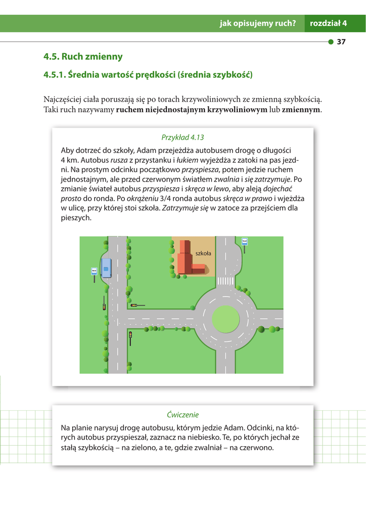 jak opisujemy ruch? rozdział 4 37 4.5. Ruch zmienny 4.5.1. Średnia wartość prędkości (średnia szybkość) Najczęściej ciała poruszają się po torach krzywoliniowych ze zmienną szybkością. Taki ruch nazywamy ruchem niejednostajnym krzywoliniowym lub zmiennym. Przykład 4.13 Aby dotrzeć do szkoły, Adam przejeżdża autobusem drogę o długości 4 km. Autobus rusza z przystanku i łukiem wyjeżdża z zatoki na pas jezdni. Na prostym odcinku początkowo przyspiesza, potem jedzie ruchem jednostajnym, ale przed czerwonym światłem zwalnia i się zatrzymuje. Po zmianie świateł autobus przyspiesza i skręca w lewo, aby aleją dojechać prosto do ronda. Po okrążeniu 3/4 ronda autobus skręca w prawo i wjeżdża w ulicę, przy której stoi szkoła. Zatrzymuje się w zatoce za przejściem dla pieszych. szkoła Ćwiczenie Na planie narysuj drogę autobusu, którym jedzie Adam. Odcinki, na których autobus przyspieszał, zaznacz na niebiesko. Te, po których jechał ze stałą szybkością – na zielono, a te, gdzie zwalniał – na czerwono. rozdział 4 jak opisujemy ruch? 38 Szybkość autobusu podczas jazdy się zmieniała. Jeśli trasę między przystankami o długości s = 4 km autobus przejechał w czasie t = 6 min = 1/10 h, to dzieląc całkowitą drogę przez czas trwania ruchu, obliczymy tak zwaną średnią szybkość: Xśr. 4 km 1 h 10 4 km 10 1 10 h 10 40 km 1h 40 km h Zapamiętaj Iloraz: całkowita droga czas ruchu s całk. t Xśr. to średnia wartość prędkości lub krócej – średnia szybkość. W czasie 6 minut autobus Adama przyspieszał, zwalniał, chwilami jechał ruchem jednostajnym, zatrzymywał się i w sumie przebył 4 kilometry. Gdyby przez całe 6 minut mógł jechać ruchem jednostajnym z szybkością Xśr. = 40 km/h, to przejechałby w tym czasie właśnie 4 km. Znajomość średniej szybkości dla różnych pojazdów na danej trasie pozwala planować podróż. Ćwiczenie Magda z rodzicami jedzie samochodem z Krakowa do Zakopanego. Jej brat Piotr jedzie do Zakopanego rowerem. Wszyscy wyruszyli o 9.30, a droga, którą mają przebyć, to 105 km. O której godzinie mogą spotkać się u celu podróży? jak opisujemy ruch? rozdział 4 39 Czas potrzebny na przebycie tej drogi obliczymy za pomocą wzoru (przykład 4.10, str. 30): t ɿ Średnia szybkość samochodu na trasie Kraków–Zakopane wynosi 50 km/h, więc: t sam. ɿ s Xśr. s Xśr. sam. 105 km km 50 h 2,1h 2 h 6 min Średnia szybkość rowerzysty to 15 km/h, więc: trow. = s υsr. row. = __________ Tak więc Magda z rodzicami będzie w Zakopanem około 11.36, natomiast Piotr o _______ i wtedy mogą się spotkać. ązkowe) doświadczenie 4.3 (obowią (obowiązkowe) Cel: Wyznaczamy średnią wartość prędkości (średnią szybkość) przez pomiar odległości i czasu. Konieczne przedmioty: taśma miernicza, stopery. Kolejne czynności: ɿ Organizujemy zawody: w bieganiu, chodzeniu „tip-topami” (stopa za stopą), toczeniu piłki lub w innej podobnej konkurencji. ɿ Na szkolnym korytarzu, w sali gimnastycznej lub na boisku odmierzamy prostoliniowy dystans do przebycia przez zawodników. Zapisujemy jego długość s w tabeli pomiarów. ɿ Uczniowie, którzy zgłosili się do zawodów, ustawiają się kolejno na linii startu. ɿ Czas przebycia dystansu przez wybranego zawodnika mierzą trzy osoby i wpisują do tabeli (stąd w tabeli czasy t1, t2, t3). rozdział 4 jak opisujemy ruch? 40 Tabela pomiarów dla zawodnika ________________________________________ s (m) t1 (s) t2 (s) t3 (s) Średnia wartość prędkości s m Xśr. tśr. s tśr. (s) ( ) ɿ Uczniowie obliczają wartość średnią czasu tśr. dla każdego zawodnika. Czas zapisujemy w sekundach z dokładnością do pierwszego miejsca po przecinku. ɿ Dla każdego zawodnika uczniowie obliczają wartość średnią jego prędkości i wpisują do tabeli pomiarów. ɿ Wpisujemy imiona zwycięzców i ich wyniki do tabeli wyników. Tabela wyników I Miejsce II Miejsce III Miejsce Xśr. III = Xśr. I = Xśr. II = Ćwiczenie Trzy uczennice brały udział w biegu na 60 m. Ich wyniki zostały przedstawione na wykresie. s (m) 60 Madzia Ania Kama 40 20 0 0 2 4 6 8 10 12 14 t (s) ɿ Z największą szybkością średnią biegła _______________. ɿ Z najmniejszą szybkością średnią biegła _______________. rozdział 5 siły w przyrodzie 98 5.7. Siły parcia 5.7.1. Siła parcia gazów i cieczy na ściany zbiornika. Ciśnienie hydrostatyczne Na poprzednich lekcjach zajmowaliśmy się przede wszystkim siłami działającymi pomiędzy ciałami stałymi. Teraz poznamy siły, jakie gazy i ciecze wywierają na ściany zbiorników. doświadczenie 5.9 Cel: Obserwujemy odkształcenia gumowego balonika. Konieczne przedmioty: gumowy, okrągły balonik, kawałek sznurka. Kolejne czynności: ɿ Ciągniemy palcami gumę balonika w kilku miejscach i próbujemy zwiększyć jego objętość. ɿ Wdmuchujemy trochę powietrza do balonika, zawiązujemy otwór i oglądamy kształt balonika. siły w przyrodzie rozdział 5 119 5.8. Druga zasada dynamiki Newtona W piątym rozdziale uczyliśmy się już o różnych rodzajach sił i skutkach ich działania. Przekonaliśmy się, że oddziaływania ciał są wzajemne, o czym mówi trzecia zasada dynamiki. Umiemy znajdować siłę wypadkową kilku sił działających w jednym kierunku oraz wiemy, że nie zawsze siły działające na ciało się równoważą. Z pierwszej zasady dynamiki wynika, że jeśli siły, które działają na ciało, równoważą się, to ciało spoczywa lub porusza się ruchem jednostajnym. Pojawia się zatem pytanie: Jak zachowują się ciała, gdy działające na nie siły się nie równoważą? Odpowiedź podsunie nam doświadczenie. doświadczenie 5.15 Cel: Badamy, jak zachowują się ciała, gdy działają na nie niezrównoważone siły. Konieczne przedmioty: dwa samochodziki zabawki o różnych masach, sprężysta linijka (można też użyć procy), taśma samoprzylepna, kawałki kolorowego papieru