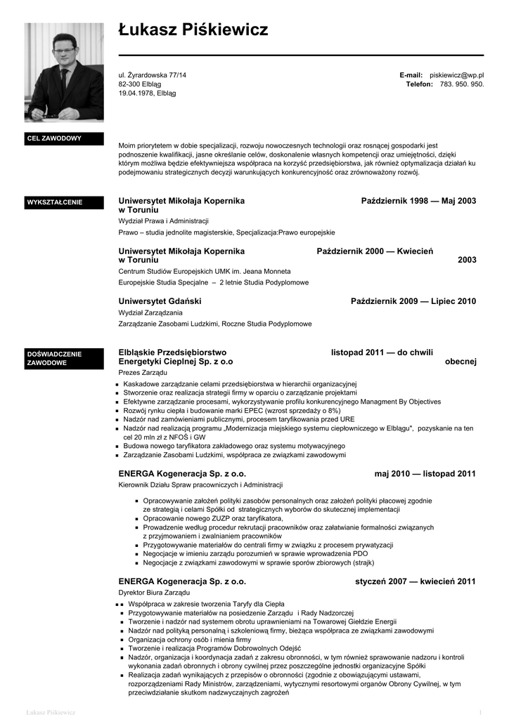 Łukasz Piśkiewicz ul. Żyrardowska 77/14 82-300 Elbląg 19.04.1978, Elbląg CEL ZAWODOWY WYKSZTAŁCENIE E-mail: [email protected] Telefon: 783. 950. 950. Moim priorytetem w dobie specjalizacji, rozwoju nowoczesnych technologii oraz rosnącej gospodarki jest podnoszenie kwalifikacji, jasne określanie celów, doskonalenie własnych kompetencji oraz umiejętności, dzięki którym możliwa będzie efektywniejsza współpraca na korzyść przedsiębiorstwa, jak również optymalizacja działań ku podejmowaniu strategicznych decyzji warunkujących konkurencyjność oraz zrównoważony rozwój. Uniwersytet Mikołaja Kopernika w Toruniu Październik 1998 — Maj 2003 Wydział Prawa i Administracji Prawo – studia jednolite magisterskie, Specjalizacja:Prawo europejskie Uniwersytet Mikołaja Kopernika w Toruniu Październik 2000 — Kwiecień 2003 Centrum Studiów Europejskich UMK im. Jeana Monneta Europejskie Studia Specjalne – 2 letnie Studia Podyplomowe Uniwersytet Gdański Październik 2009 — Lipiec 2010 Wydział Zarządzania Zarządzanie Zasobami Ludzkimi, Roczne Studia Podyplomowe DOŚWIADCZENIE ZAWODOWE Elbląskie Przedsiębiorstwo Energetyki Cieplnej Sp. z o.o listopad 2011 — do chwili obecnej Prezes Zarządu Kaskadowe zarządzanie celami przedsiębiorstwa w hierarchii organizacyjnej Stworzenie oraz realizacja strategii firmy w oparciu o zarządzanie projektami Efektywne zarządzanie procesami, wykorzystywanie profilu konkurencyjnego Managment By Objectives Rozwój rynku ciepła i budowanie marki EPEC (wzrost sprzedaży o 8%) Nadzór nad zamówieniami publicznymi, procesem taryfikowania przed URE Nadzór nad realizacją programu „Modernizacja miejskiego systemu ciepłowniczego w Elblągu", pozyskanie na ten cel 20 mln zł z NFOŚ i GW Budowa nowego taryfikatora zakładowego oraz systemu motywacyjnego Zarządzanie Zasobami Ludzkimi, współpraca ze związkami zawodowymi ENERGA Kogeneracja Sp. z o.o. maj 2010 — listopad 2011 Kierownik Działu Spraw pracowniczych i Administracji Opracowywanie założeń polityki zasobów personalnych oraz założeń polityki płacowej zgodnie ze strategią i celami Spółki od strategicznych wyborów do skutecznej implementacji Opracowanie nowego ZUZP oraz taryfikatora, Prowadzenie według procedur rekrutacji pracowników oraz załatwianie formalności związanych z przyjmowaniem i zwalnianiem pracowników Przygotowywanie materiałów do centrali firmy w związku z procesem prywatyzacji Negocjacje w imieniu zarządu porozumień w sprawie wprowadzenia PDO Negocjacje z związkami zawodowymi w sprawie sporów zbiorowych (strajk) ENERGA Kogeneracja Sp. z o.o. styczeń 2007 — kwiecień 2011 Dyrektor Biura Zarządu Współpraca w zakresie tworzenia Taryfy dla Ciepła Przygotowywanie materiałów na posiedzenie Zarządu i Rady Nadzorczej Tworzenie i nadzór nad systemem obrotu uprawnieniami na Towarowej Giełdzie Energii Nadzór nad polityką personalną i szkoleniową firmy, bieżąca współpraca ze związkami zawodowymi Organizacja ochrony osób i mienia firmy Tworzenie i realizacja Programów Dobrowolnych Odejść Nadzór, organizacja i koordynacja zadań z zakresu obronności, w tym również sprawowanie nadzoru i kontroli wykonania zadań obronnych i obrony cywilnej przez poszczególne jednostki organizacyjne Spółki Realizacja zadań wynikających z przepisów o obronności (zgodnie z obowiązującymi ustawami, rozporządzeniami Rady Ministrów, zarządzeniami, wytycznymi resortowymi organów Obrony Cywilnej, w tym przeciwdziałanie skutkom nadzwyczajnych zagrożeń Łukasz Piśkiewicz 1 Elbląska Uczelnia Humanistyczno-Ekonomiczna październik 2003 — wrzesień 2007 Asystent na Wydziale Administracji Prowadzenie zajęć i egzaminów z zakresu prawa i postępowania administracyjnego, konstytucyjnego, cywilnego Organizacja konferencji naukowych Czynności administracyjne w czasie egzaminów licencjackich Umowy zlecenie bądź o dzieło wrzesień 2004 — czerwiec 2007 Doradztwo Prawne / Szkoleniowiec Szkolenia z zakresu prawa i postępowania administracyjnego, prawa gospodarczego Kierowanie projektem szkoleniowym Porady prawne Sąd Okręgowy w Elblągu październik 2003 — maj 2006 Aplikacja sądowa Administrowanie działalności Sądu Okręgowego w Elblągu Wspieranie działalności i funkcjonowania w sprawach cywilnych, pracy i ubezpieczeń społecznych, rodzinnych, gospodarczych MZK Toruń czerwiec 2003 — październik 2003 Referent ds. prawnych Prowadzenie mediacji Praca administracyjno-biurowa Prowadzenie poradnictwa konsumenckiego Wykonywanie czynności związanych z obsługą prawną MZK Toruń, w tym: dokonywanie interpretacji przepisów, udzielanie wskazówek w odniesieniu do konkretnych stanów faktycznych, prowadzenie szkoleń, sporządzanie decyzji administracyjnych ZNAJOMOŚĆ JĘZYKÓW OBCYCH Język ojczysty Polski UMIEJĘTNOŚCI I KOMPETENCJE Kompetencje firmowe identyfikacja z firmą, otwartość na zmiany dobrze rozwinięte umiejętności językowe sprawność organizacyjna podparta doświadczeniem i wiedzą zawodową Kompetencje menadżerskie zarządzanie procesami zarządzanie projektami zarządzanie zasobami ludzkimi, odwaga kierownicza zarządzanie zmianą w oparciu o myślenie strategiczne Umiejętności i kompetencje organizacyjne orientacja na działanie, podejmowanie inicjatywy dążenie do rezultatów w oparciu o wyznaczanie priorytetów, decyzyjność, odpowiedzialność duże doświadczenie w zarządzaniu zespołami ludzkimi, budowanie efektywnych zespołów umiejętność logicznego myślenia kształcona podczas studiów i pracy zawodowej INNE UMIEJĘTNOŚCI Prawo jazdy kat. B Biegła obsługa komputera, znajomość pakietów MS Office SZKOLENIA CERTYFIKATY Łukasz Piśkiewicz Inne języki Angielski - poziom dobry w mowie i piśmie Rosyjski - poziom dobry w mowie i piśmie Francuski - poziom dobry w mowie i piśmie Ocena pracownicza 360 - Champion Consulting, Październik 2013 Polityka energetyczna UE - Parlam
