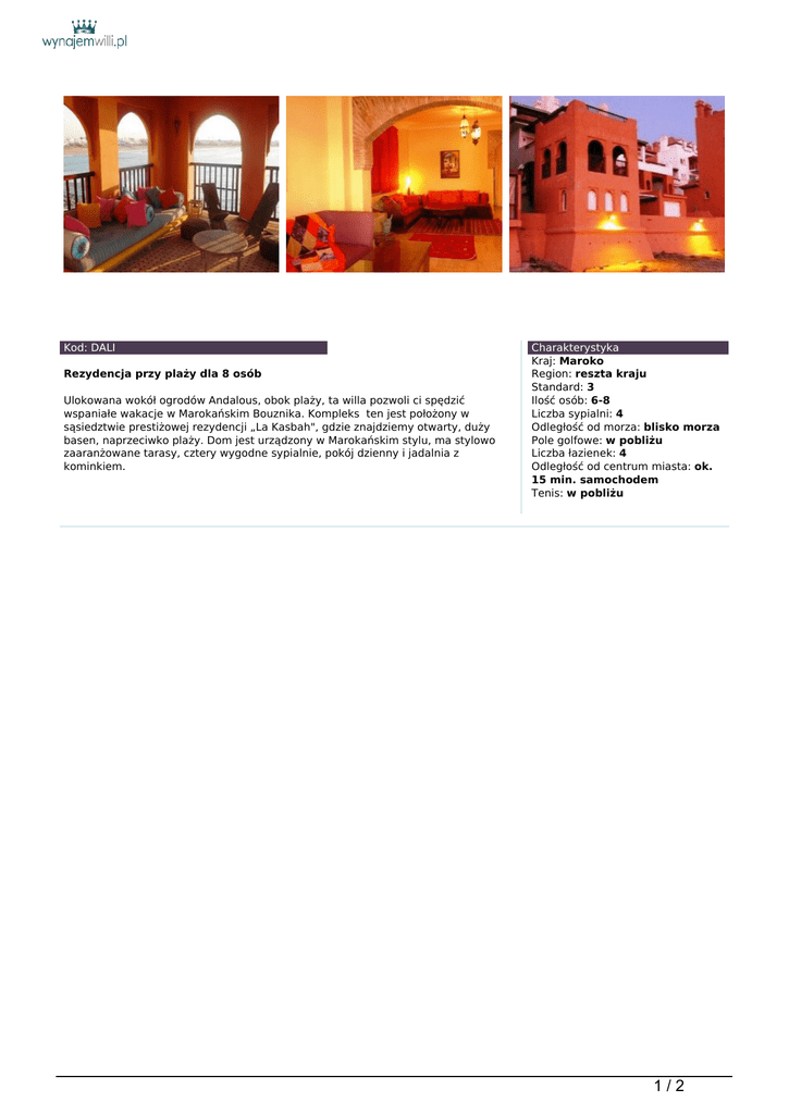 Kod: DALI Rezydencja przy plaży dla 8 osób Ulokowana wokół ogrodów Andalous, obok plaży, ta willa pozwoli ci spędzić wspaniałe wakacje w Marokańskim Bouznika. Kompleks ten jest położony w sąsiedztwie prestiżowej rezydencji „La Kasbah", gdzie znajdziemy otwarty, duży basen, naprzeciwko plaży. Dom jest urządzony w Marokańskim stylu, ma stylowo zaaranżowane tarasy, cztery wygodne sypialnie, pokój dzienny i jadalnia z kominkiem. Charakterystyka Kraj: Maroko Region: reszta kraju Standard: 3 Ilość osób: 6-8 Liczba sypialni: 4 Odległość od morza: blisko morza Pole golfowe: w pobliżu Liczba łazienek: 4 Odległość od centrum miasta: ok. 15 min. samochodem Tenis: w pobliżu 1/2 Ta posiadłość znajduje się 20 km od Mohammedia, pomiędzy Casablanca i Rabat, niedaleko plaży i centrum wioski. Atutami willi są znajdujące się w pobliżu Horse Riding Centre, tenis, cztery Golf Resorts of "Bouznika bay, Mohammedia, Benslimane et Rabat ", SPA-centrum, i centrum konferencyjne. Z rezydencji mamy bezpośredni dostep do plaży i ochronę 24h/dobę. Kompleks jest dwupiętrowy i ma powierzchnie 283 m². Willa ma cztery sypialnie dwuosobowe. Na parterze rozmieszczona Amerykańska kuchnia, 2 dwuosobowe sypialnie z podwójnymi łóżkami, i łazienka z hydromasażnym prysznicem. Na pierwszym piętrze znajdują się 2 salony, jeden z kominkiem i bezpośrednim wyjściem na taras z morskimi widokami, w pełni wyposażona kuchnia, dwie dwuosobowe sypialnie z podwójnymi łóżkami, trzy łazienki, i dwa duże tarasy z panoramicznym widokiem na morze. Niektóre pokoje mają bezpośredni widok na morze. Pokoje są przestronne i komfortowe. Dodatkowe informacje: parking, asysta pokojówki dwie godziny dziennie. Odległości: lotnisko Casablanca - 40 minut samochodem, miasto - 10 minut. Low Peak Ceny w zależności od sezonu €2420 €2640 Low: reszta roku. Peak: czerwiec, lipiec, sierpień. Cena zawiera: willę z personelem i śniadania. 2/2 Powered by TCPDF (www.tcpdf.org)