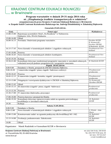 Program warsztatów w dniach 29-31 maja 2014 roku nt. „Eksploatacja środków transportowych w rolnictwie” zorganizowanych przez Krajowe Centrum Edukacji Rolniczej w Brwinowie w Zespole Szkół Centrum Kształcenia Rolniczego im. Jadwigi Dziubińskiej w Zduńskiej Dąbrowie Czwartek 29.05.2014r. Godz. Temat zajęć 13.00-15.00 Rejestracja uczestników Hotel „Na Rozdrożu” w Nieborowie. Nieborów 163c, 99-416 Nieborów 15.00-16.00 Obiad 16.00-16.15 Powitanie. Omówienie programu warsztatów. 16.15-17.45 Nowe kierunki w konstrukcjach silników i ciągników rolniczych. 17.45-18.00 Przerwa 18.00-18.45 Nowe kierunki w konstrukcjach silników kombajnów. 18.45-19.30 Kolacja 19.30-21.00 Konsultacje dotyczące modernizacji programów nauczania w zawodach rolniczych, wdrażania nowych podstaw programowych i programów nauczania. Piątek 30.05.2014r. 8.00-9.00 Śniadanie w Hotelu, przejazd do ZSCKR Zduńska Dąbrowa. 9.00-10.30 I stanowisko (ciągnik+ prasa; ciągnik +ładowacz czołowy) 10.30-10.45 Przerwa 10.45-12.15 II stanowisko (ciągnik+ kosiarka; ciągnik +przetrząsacz) 12.15-13.00 Osiągnięcia i rozwiązania dydaktyczne w ZSCKR w Zduńskiej Dąbrowie. 13.00-13.45 Obiad 13.45-15.15 III stanowisko (ciągnik+ prasa; ciągnik +ładowacz) 15.15-15.30 Przerwa 15.30-17.00 IV stanowisko (ładowarka, przyczepy) 17.00-18.00 Przerwa kawowa i przejazd do Hotelu 18.00-19.30 Konsultacje dotyczące opracowywania zadań na egzamin potwierdzający kwalifikacje w zawodach rolniczych. 19.30 Kolacja Sobota 31.05.2014r. 8.00-9.00 Śniadanie w Hotelu, 9.00-12.00 Nowe kierunki w konstrukcjach silników i ciągników rolniczych. 12.00-13.00 Konstruowanie zadań na egzamin praktyczny dla kwalifikacji M1 i M2. 13.15-14.00 Ewaluacja, podsumowanie. Zakończenie. 14.00 Obiad Organizator: Marek Rudziński n-l konsultant KCER w Brwinowie Wykładowca Dyrektor KCER St. Kosmowski – Dyrektor ZSCKR M.Rudziński KCER Przedstawiciel New Holland Przedstawiciel New Holland M. Rudziński KCER Przedstawiciel producenta Przedstawiciel producenta St. Kosmowski – Dyrektor ZSCKR Przedstawiciel producenta Przedstawiciel producenta M. Rudziński KCER S. Wolski - John Deere M. Rudziński KCER M. Rudziński KCER