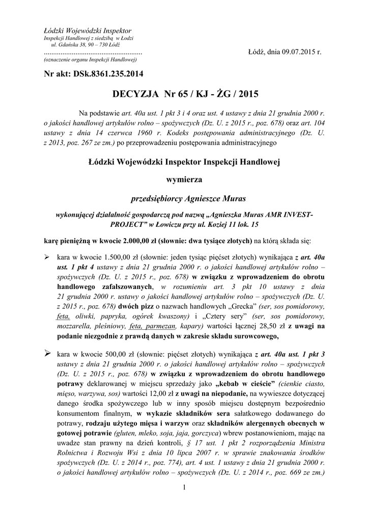 Łódzki Wojewódzki Inspektor Inspekcji Handlowej z siedzibą w Łodzi ul. Gdańska 38, 90 – 730 Łódź Łódź, dnia 09.07.2015 r. ..................................................... (oznaczenie organu Inspekcji Handlowej) Nr akt: DSk.8361.235.2014 DECYZJA Nr 65 / KJ - ŻG / 2015 Na podstawie art. 40a ust. 1 pkt 3 i 4 oraz ust. 4 ustawy z dnia 21 grudnia 2000 r. o jakości handlowej artykułów rolno – spożywczych (Dz. U. z 2015 r., poz. 678) oraz art. 104 ustawy z dnia 14 czerwca 1960 r. Kodeks postępowania administracyjnego (Dz. U. z 2013, poz. 267 ze zm.) po przeprowadzeniu postępowania administracyjnego Łódzki Wojewódzki Inspektor Inspekcji Handlowej wymierza przedsiębiorcy Agnieszce Muras wykonującej działalność gospodarczą pod nazwą „Agnieszka Muras AMR INVESTPROJECT” w Łowiczu przy ul. Koziej 11 lok. 15 karę pieniężną w kwocie 2.000,00 zł (słownie: dwa tysiące złotych) na którą składa się: kara w kwocie 1.500,00 zł (słownie: jeden tysiąc pięćset złotych) wynikająca z art. 40a ust. 1 pkt 4 ustawy z dnia 21 grudnia 2000 r. o jakości handlowej artykułów rolno – spożywczych (Dz. U. z 2015 r., poz. 678) w związku z wprowadzeniem do obrotu handlowego zafałszowanych, w rozumieniu art. 3 pkt 10 ustawy z dnia 21 grudnia 2000 r. ustawy o jakości handlowej artykułów rolno – spożywczych (Dz. U. z 2015 r., poz. 678) dwóch pizz o nazwach handlowych „Grecka” (ser, sos pomidorowy, feta, oliwki, papryka, ogórek kwaszony) i „Cztery sery” (ser, sos pomidorowy, mozzarella, pleśniowy, feta, parmezan, kapary) wartości łącznej 28,50 zł z uwagi na podanie niezgodnie z prawdą danych w zakresie składu surowcowego, kara w kwocie 500,00 zł (słownie: pięćset złotych) wynikająca z art. 40a ust. 1 pkt 3 ustawy z dnia 21 grudnia 2000 r. o jakości handlowej artykułów rolno – spożywczych (Dz. U. z 2015 r., poz. 678) w związku z wprowadzeniem do obrotu handlowego potrawy deklarowanej w miejscu sprzedaży jako „kebab w cieście” (cienkie ciasto, mięso, warzywa, sos) wartości 12,00 zł z uwagi na niepodanie, na wywieszce dotyczącej danego środka spożywczego lub w inny sposób miejscu dostępnym bezpośrednio konsumentom finalnym, w wykazie składników sera sałatkowego dodawanego do potrawy, rodzaju użytego mięsa i warzyw oraz składników alergennych obecnych w gotowej potrawie (gluten, mleko, soja, jaja, gorczyca) wbrew postanowieniom, mając na uwadze stan prawny na dzień kontroli, § 17 ust. 1 pkt 2 rozporządzenia Ministra Rolnictwa i Rozwoju Wsi z dnia 10 lipca 2007 r. w sprawie znakowania środków spożywczych (Dz. U. z 2014 r., poz. 774), art. 4 ust. 1 ustawy z dnia 21 grudnia 2000 r. o jakości handlowej artykułów rolno – spożywczych (Dz. U. z 2014 r., poz. 669 ze zm.) 1 w związku z art. 14 Parlamentu Europejskiego i Rady z dnia 28 stycznia 2002 r. ustanawiającego ogólne zasady i wymagania prawa żywnościowego, powołującego Europejski Urząd ds. Bezpieczeństwa Żywności oraz ustanawiającego procedury w zakresie bezpieczeństwa żywności (Dz. U. L 31 z 01.02.2002 r. s. 1 ze zm.) [od 09 stycznia 2015 r. wbrew postanowieniom § 19 ust. 1 pkt 3 rozporządzenia Ministra Rolnictwa i Rozwoju Wsi z dnia 23 grudnia 2014 r. w sprawie znakowania poszczególnych rodzajów środków spożywczych (Dz. U. z 2015 r. poz. 29) w związku z art. 44 ust. 1 lit. a rozporządzenia Parlamentu Europejskiego i Rady (UE) nr 1169/2011 z dnia 25 października 2011 r. w sprawie przekazywania konsumentom informacji na temat żywności, zmiany rozporządzeń Parlamentu Europejskiego i Rady (WE) nr 1924/2006 i (WE) nr 1925/2006 oraz uchylenia dyrektywy Komisji 87/250/EWG, dyrektywy Rady 90/496/EWG, dyrektywy Komisji 1999/10/WE, dyrektywy 2000/13/WE Parlamentu Europejskiego i Rady, dyrektyw Komisji 2002/67/WE i 2008/5/WE oraz rozporządzenia Komisji (WE) nr 608/2004 (Dz. U. UE. L 304 z 22.11.2011 ze zm.)]. Uzasadnienie W dniach od 14 do 27 listopada 2014 r. na podstawie upoważnienia Łódzkiego Wojewódzkiego Inspektora Inspekcji Handlowej numer DSk.8361.235.2014 z dnia 14 listopada 2014 r. inspektorzy Wojewódzkiego Inspektoratu Inspekcji Handlowej w Łodzi, Delegatury w Skierniewicach przeprowadzili kontrolę w barze „Mac Jack” zlokalizowanym w Łowiczu przy ul. Koziej 11 lok. 15, należącym do Agnieszki Muras, wykonującej działalność gospodarczą pod nazwą „Agnieszka Muras AMR INVESTPROJECT”. Kontrolę przeprowadzono na podstawie art. 3 ust. 1 - 3 rozporządzenia Parlamentu Europejskiego i Rady (WE) Nr 882/2004 z dnia 29 kwietnia 2004 r. w sprawie kontroli urzędowych przeprowadzanych w celu sprawdzenia zgodności z prawem paszowym i żywnościowym oraz regułami dotyczącymi zdrowia zwierząt i dobrostanu zwierząt (Dz. U. L 165 z 30.4.2004 r. ze zm.), art. 17 ust. 3 ustawy z dnia 21 grudnia 2000 r. o jakości handlowej artykułów rolno-spożywczych (Dz. U. z 2014 r., poz. 669 ze zm.), art. 24 ust. 1 rozporządzenia Parlamentu Europejskiego i Rady (WE) nr 1935/2004 z dnia 27 października 2004 r. w sprawie materiałów i wyrobów przeznaczonych do kontaktu z żywnością oraz uchylającego dyrektywy 80/590/EWG (Dz. U. z 27.10.2004 s. 4 ze zm.) w związku z art. 3 ust. 1 pkt 6 oraz art. 3 ust. 1 pkt 1, 2 ustawy z dnia 15 grudnia 2000 r. o Inspekcji Handlowej (Dz. U. z 2014, poz. 148 ze zm.) w obecności osoby czynnej (…) oraz przedsiębiorcy Agnieszki Muras. Celem sprawdzenia prawidłowości oznakowania potraw oraz rzetelności przekazywanych informacji o danych produktach, inspektorzy występując w charakterze nabywców zakupili dwie pizze, deklarowane w miejscu sprzedaży (cennik) jako „Grecka (ser, sos pomidorowy, feta, oliwki, papryka, ogórek kwaszony) w cenie 12,00 zł” zwaną dalej „grecką” oraz „Cztery sery (ser, sos pomidorowy, mozzarella, pleśniowy, feta, parmezan, kapary) w cenie 16,50 zł” zwaną dalej „cztery sery”. Przedmiotowe potrawy zostały przygotowane na zamówieni