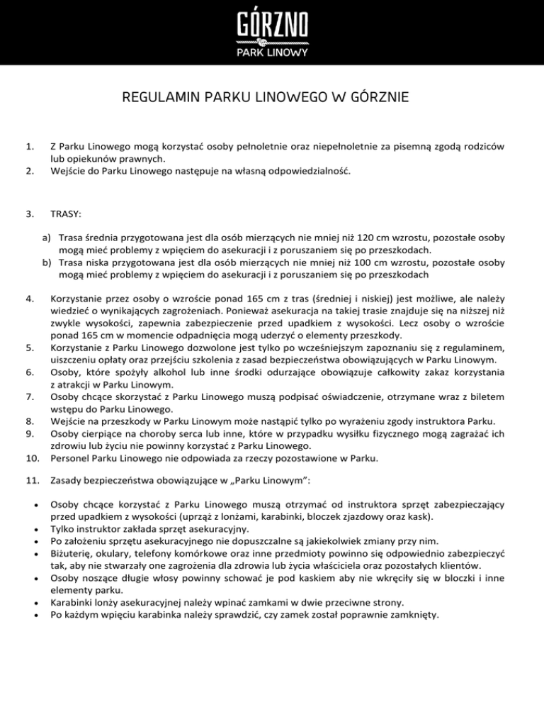 Regulamin Parku Linowego Górzno