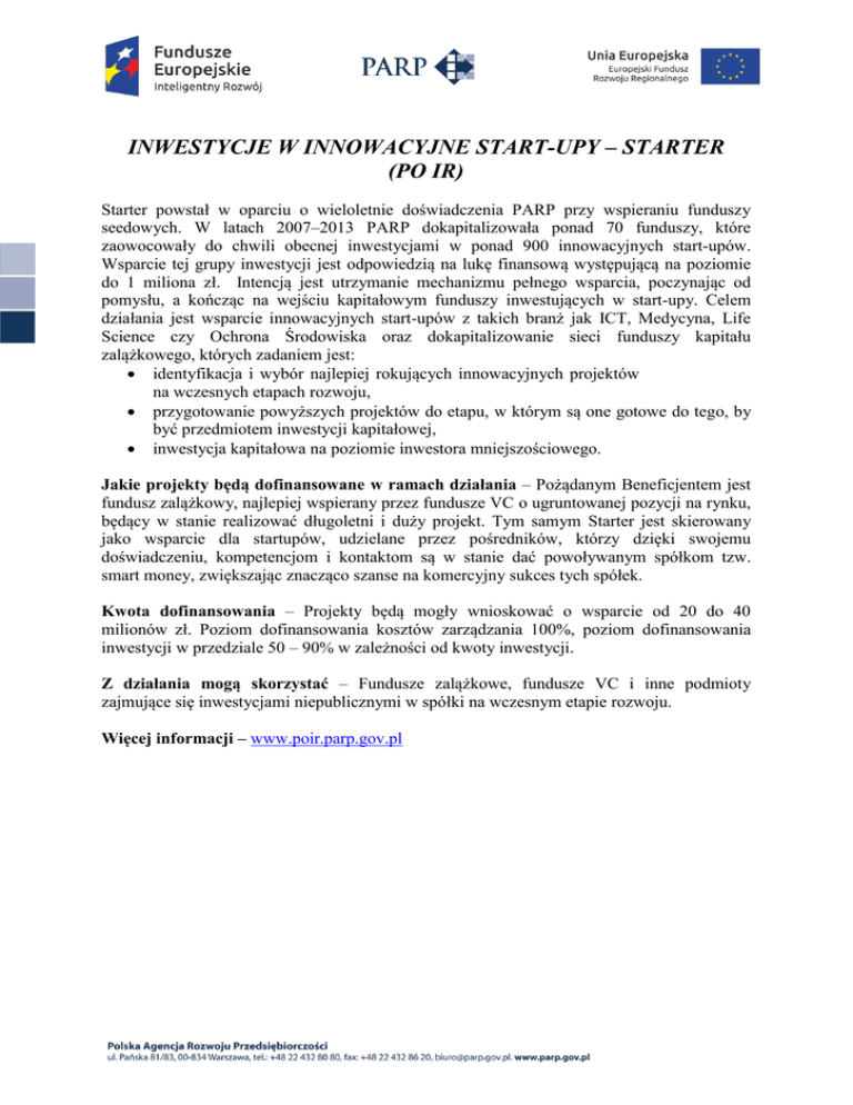 INWESTYCJE W INNOWACYJNE START-UPY – STARTER (PO IR) Starter powstał w oparciu o wieloletnie doświadczenia PARP przy wspieraniu funduszy seedowych. W latach 2007–2013 PARP dokapitalizowała ponad 70 funduszy, które zaowocowały do chwili obecnej inwestycjami w ponad 900 innowacyjnych start-upów. Wsparcie tej grupy inwestycji jest odpowiedzią na lukę finansową występującą na poziomie do 1 miliona zł. Intencją jest utrzymanie mechanizmu pełnego wsparcia, poczynając od pomysłu, a kończąc na wejściu kapitałowym funduszy inwestujących w start-upy. Celem działania jest wsparcie innowacyjnych start-upów z takich branż jak ICT, Medycyna, Life Science czy Ochrona Środowiska oraz dokapitalizowanie sieci funduszy kapitału zalążkowego, których zadaniem jest: identyfikacja i wybór najlepiej rokujących innowacyjnych projektów na wczesnych etapach rozwoju, przygotowanie powyższych projektów do etapu, w którym są one gotowe do tego, by być przedmiotem inwestycji kapitałowej, inwestycja kapitałowa na poziomie inwestora mniejszościowego. Jakie projekty będą dofinansowane w ramach działania – Pożądanym Beneficjentem jest fundusz zalążkowy, najlepiej wspierany przez fundusze VC o ugruntowanej pozycji na rynku, będący w stanie realizować długoletni i duży projekt. Tym samym Starter jest skierowany jako wsparcie dla startupów, udzielane przez pośredników, którzy dzięki swojemu doświadczeniu, kompetencjom i kontaktom są w stanie dać powoływanym spółkom tzw. smart money, zwiększając znacząco szanse na komercyjny sukces tych spółek. Kwota dofinansowania – Projekty będą mogły wnioskować o wsparcie od 20 do 40 milionów zł. Poziom dofinansowania kosztów zarządzania 100%, poziom dofinansowania inwestycji w przedziale 50 – 90% w zależności od kwoty inwestycji. Z działania mogą skorzystać – Fundusze zalążkowe, fundusze VC i inne podmioty zajmujące się inwestycjami niepublicznymi w spółki na wczesnym etapie rozwoju. Więcej informacji – www.poir.parp.gov.pl