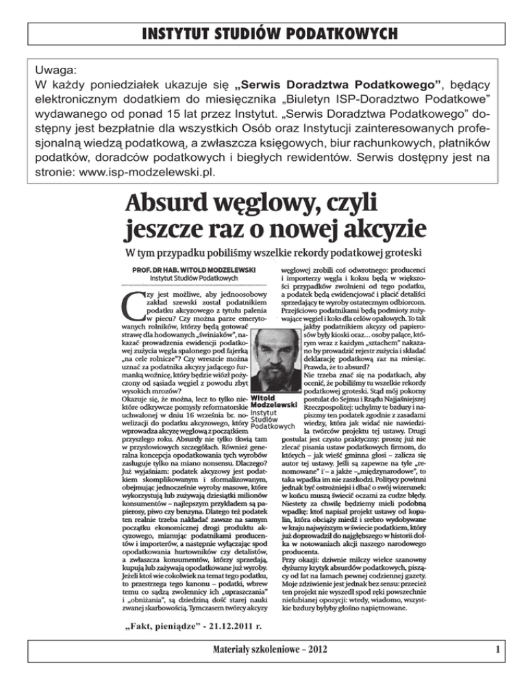 instytut studiów podatkowych Uwaga: W każdy poniedziałek ukazuje się „Serwis Doradztwa Podatkowego”, będący elektronicznym dodatkiem do miesięcznika „Biuletyn ISP-Doradztwo Podatkowe” wydawanego od ponad 15 lat przez Instytut. „Serwis Doradztwa Podatkowego” dostępny jest bezpłatnie dla wszystkich Osób oraz Instytucji zainteresowanych profesjonalną wiedzą podatkową, a zwłaszcza księgowych, biur rachunkowych, płatników podatków, doradców podatkowych i biegłych rewidentów. Serwis dostępny jest na stronie: www.isp-modzelewski.pl. Absurd węglowy, czyli jeszcze raz o nowej akcyzie „Fakt, pieniądze” - 21.12.2011 r. Materia³y szkoleniowe – 2012