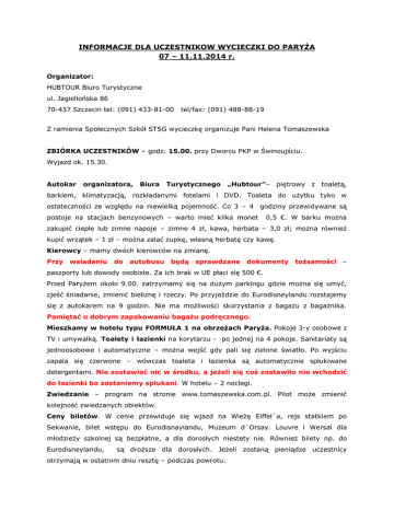 INFORMACJE DLA UCZESTNIKOW WYCIECZKI DO PARYŻA 07 – 11.11.2014 r. Organizator: HUBTOUR Biuro Turystyczne ul. Jagiellońska 86 70-437 Szczecin tel: (091) 433-81-00 tel/fax: (091) 488-88-19 Z ramienia Społecznych Szkół STSG wycieczkę organizuje Pani Helena Tomaszewska ZBIÓRKA UCZESTNIKÓW – godz. 15.00. przy Dworcu PKP w Świnoujściu. Wyjazd ok. 15.30. Autokar organizatora, Biura Turystycznego „Hubtour”– piętrowy z toaletą, barkiem, klimatyzacją, rozkładanymi fotelami i DVD. Toaleta do użytku tyko w ostateczności ze względu na niewielką pojemność. Co 3 – 4 godziny przewidywane są postoje na stacjach benzynowych – warto mieć kilka monet 0,5 €. W barku można zakupić ciepłe lub zimne napoje – zimne 4 zł, kawa, herbata – 3,0 zł; można również kupić wrzątek – 1 zł – można zalać zupkę, własną herbatę czy kawę. Kierowcy – mamy dwóch kierowców na zmianę. Przy wsiadaniu do autobusu będą sprawdzane dokumenty tożsamości – paszporty lub dowody osobiste. Za ich brak w UE płaci się 500 €. Przed Paryżem około 9.00. zatrzymamy się na dużym parkingu gdzie można się umyć, zjeść śniadanie, zmienić bieliznę i rzeczy. Po przyjeździe do Eurodisneylandu rozstajemy się z autokarem na 9 godzin. Nie ma możliwości skorzystania z bagażu z bagażnika. Pamiętać o dobrym zapakowaniu bagażu podręcznego. Mieszkamy w hotelu typu FORMUŁA 1 na obrzeżach Paryża. Pokoje 3-y osobowe z TV i umywalką. Toalety i łazienki na korytarzu - po jednej na 4 pokoje. Sanitariaty są jednoosobowe i automatyczne – można wejść gdy pali się zielone światło. Po wyjściu zapala się czerwone – wówczas toaleta i łazienka są automatycznie spłukiwane detergentami. Nie zostawiać nic w środku, a jeżeli się coś zostawiło nie wchodzić do łazienki bo zostaniemy spłukani. W hotelu – 2 noclegi. Zwiedzanie – program na stronie www.tomaszewska.com.pl. Pilot może zmienić kolejność zwiedzanych obiektów. Ceny biletów. W cenie przewiduje się wjazd na Wieżę Eiffel`a, rejs statkiem po Sekwanie, bilet wstępu do Eurodisnaylandu, Muzeum d`Orsay. Louvre i Wersal dla młodzieży szkolnej są bezpłatne, a dla dorosłych niestety nie. Również bilety np. do Eurodisneylandu, są droższe dla dorosłych. Jeżeli zostaną pieniądze uczestnicy otrzymają w ostatnim dniu resztę – podczas powrotu. Młodzież do 18 roku życia – powinna się zmieścić w 65 €. Dorośli w 100 - 105 €. (Różnica w stosunku do pierwotnej oferty wynika z drobnej zmiany programu. Pani Tomaszewska zamówiła dodatkowo zwiedzanie Muzeum d`Orsay, które nie jest bezpłatne i kosztuje ok. 10 €. Potrzebne są również pieniądze na metro). Eurodisneyland – po Eurodisneylandzie młodzież porusza się samodzielnie. Przewodnik wpuszcza nas do wesołego miasteczka i zostawia nas cały dzień. Przy wejściu warto się zaopatrzyć w darmowy plan i zaplanować sobie co chcemy robić (jest w języku angielskim, francuskim, niemieckim; polskiego nie ma). Pamiętać o zachowaniu ważnego biletu – jest to nasza przepustka do FastPass. Jeżeli wyjdziemy z Eurodisneylandu już tam nie wrócimy. Bezpłatny serwis Fastpass w Eurodisneyland (zaczerpnięto ze strony Eurodisneyland): Serwis Fastpass pozwoli Państwu zaoszczędzić czas i ominąć ewentualne kolejki przy następujących atrakcjach: W Parku Disneyland: • Indiana Jones & the Temple of Peril… • Space Mountain • Buzz Lightyear Laser Blast • Big Thunder Mountain • Peter Pan’s Flight • Star Tours W Parku Walt Disney Studios: • The Twiglight Zone Tower of Terror • Rock ‘n’ Roller Coaster starring Aerosmith • Flying Carpets Over Agrabah Korzystanie z serwisu Fastpass – należy wsunąć bilet wstępu do Parku do automatu biletowego przy danej atrakcji – otrzymają Państwo bilet Fastpass z wydrukowanym czasem, po jakim należy się zgłosić do wejścia na daną atrakcję. Jednorazowo można pobrać tylko jeden Fastpass. Kolejny można pobrać po wykorzystaniu pierwszego. Na terenie Parku znajdują się sklepy, kawiarnie, restauracje, bary szybkiej obsługi. UWAGA - Ceny są bardzo wysokie. Porcja frytek 5 €, 0,5 l. coli – 5 €, pluszak – 10 € Bardzo interesujące są parady postaci z bajek Disneya. W Muzeum Louvre, Wersal d`Orsay grupa otrzymuje plan muzeum i zwiedza sama. Przewodnik przed wejściem przedstawi co można zwiedzić, a każdy będzie mógł zaznaczyć sobie gdzie znajdują się największe atrakcje. Nasz przewodnik nie może oprowadzać po muzeum. Jeżeli chcemy skorzystać z przewodnika muzealnego za 1 godzinę musimy zapłacić 80 €, dlatego zwiedzamy sami. Louvre - nie da się zwiedzić całego muzeum, trzeba dobrze zaplanować co chcemy zobaczyć. Największe atrakcje to: Wenus z Milo, Nike z Samotraki, obrazy Leonarda da Vinci z Moną Lisą na czele, rzeźby Michała Anioła Buonarottiego, apartamenty Napoleona III, klejnoty koronne itp. Pani Tomaszewska w autokarze powie co warto zobaczyć by się nie miotać w muzeum (Każdy uczeń otrzyma karty zadań do uzupełnienia.) Muzeum d`Orsay to muzeum sztuki XIX/XX wieku – impresjoniści, postimpresjoniści itp. Wersal – wielki kompleks pałacowy Ludwika XIV. Oprócz tego w programie wiele innych atrakcji – zwiedzamy codziennie 910 godzin. Trzeba mieć wygodne buty. Wyjazd z Paryża 10.11. po godzinie 19.00. Przyjazd do Świnoujścia we wtorek 11.11.2014 r. koło 16.00. Młodzież będzie dzwoniła do rodzicow po przekroczeniu granicy. WYŻYWIENIE Cena 490 zł nie uwzględnia wyżywienia. Należy wziąć ze sobą wyżywienie na podróż i część pobytu. Proponujemy zabrać: kanapki na drogę różnego rodzaju zalewajki np. zupki Amino, makarony z sosami itp. W autokarze zawsze można kupić wrzątek, a w hotelu rano czy wieczorem zalać zupkę czy danie. W tym celu 3 osoby będące ze sobą w pokoju mogą się umówić, która z nich weźmie ze sobą mały czajnik elektryczny; nawet 1 na dwa p