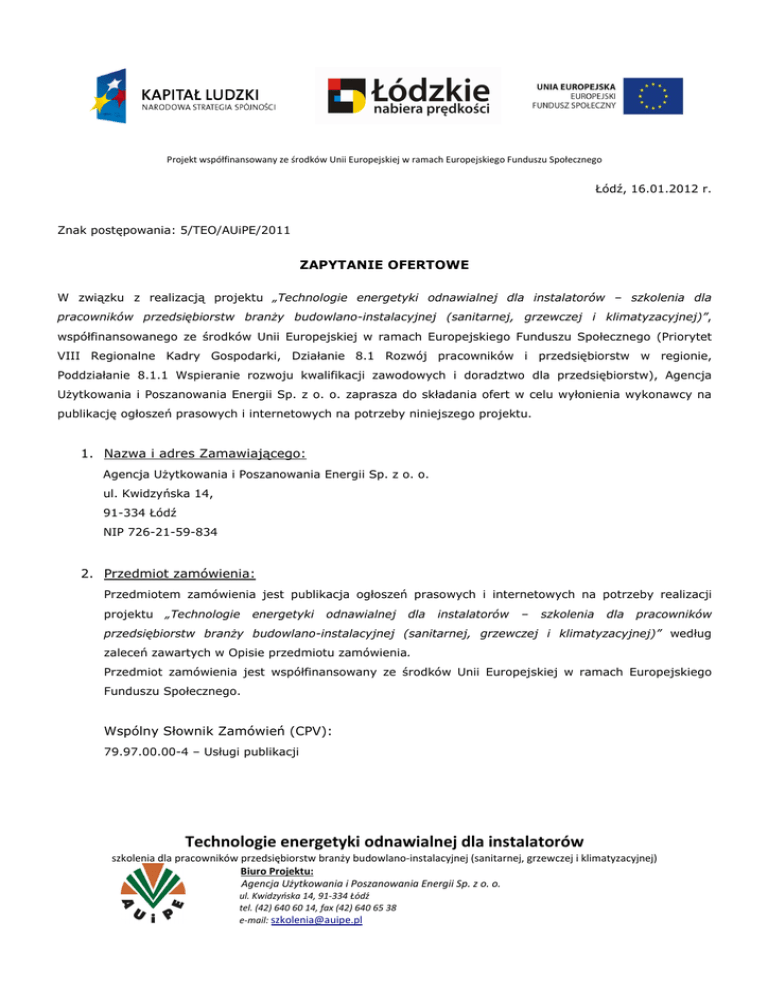 Projekt współfinansowany ze środków Unii Europejskiej w ramach Europejskiego Funduszu Społecznego Łódź, 16.01.2012 r. Znak postępowania: 5/TEO/AUiPE/2011 ZAPYTANIE OFERTOWE W związku z realizacją projektu „Technologie energetyki odnawialnej dla instalatorów – szkolenia dla pracowników przedsiębiorstw branży budowlano-instalacyjnej (sanitarnej, grzewczej i klimatyzacyjnej)”, współfinansowanego ze środków Unii Europejskiej w ramach Europejskiego Funduszu Społecznego (Priorytet VIII Regionalne Kadry Gospodarki, Działanie 8.1 Rozwój pracowników i przedsiębiorstw w regionie, Poddziałanie 8.1.1 Wspieranie rozwoju kwalifikacji zawodowych i doradztwo dla przedsiębiorstw), Agencja Użytkowania i Poszanowania Energii Sp. z o. o. zaprasza do składania ofert w celu wyłonienia wykonawcy na publikację ogłoszeń prasowych i internetowych na potrzeby niniejszego projektu. 1. Nazwa i adres Zamawiającego: Agencja Użytkowania i Poszanowania Energii Sp. z o. o. ul. Kwidzyńska 14, 91-334 Łódź NIP 726-21-59-834 2. Przedmiot zamówienia: Przedmiotem zamówienia jest publikacja ogłoszeń prasowych i internetowych na potrzeby realizacji projektu „Technologie energetyki odnawialnej dla instalatorów – szkolenia dla pracowników przedsiębiorstw branży budowlano-instalacyjnej (sanitarnej, grzewczej i klimatyzacyjnej)” według zaleceń zawartych w Opisie przedmiotu zamówienia. Przedmiot zamówienia jest współfinansowany ze środków Unii Europejskiej w ramach Europejskiego Funduszu Społecznego. Wspólny Słownik Zamówień (CPV): 79.97.00.00-4 – Usługi publikacji Technologie energetyki odnawialnej dla instalatorów szkolenia dla pracowników przedsiębiorstw branży budowlano-instalacyjnej (sanitarnej, grzewczej i klimatyzacyjnej) Biuro Projektu: Agencja Użytkowania i Poszanowania Energii Sp. z o. o. ul. Kwidzyńska 14, 91-334 Łódź tel. (42) 640 60 14, fax (42) 640 65 38 e-mail: [email protected] Projekt współfinansowany ze środków Unii Europejskiej w ramach Europejskiego Funduszu Społecznego 3. Tryb postępowania: Zamówienie poniżej 14 tyś euro będzie udzielone zgodnie z zasadą konkurencyjności i nie podlega przepisom ustawy Prawo Zamówień Publicznych. Zapytanie wysłane jest do potencjalnych Oferentów oraz zostaje umieszczone na stronie Zamawiającego www.auipe.pl i siedzibie Zamawiającego w celu wybrania najkorzystniejszej oferty. 4. Opis przedmiotu zamówienia: Część I: ogłoszenie o charakterze informacyjno-promocyjnym w codziennej prasie tradycyjnej o zasięgu: 1. regionalnym obejmującym teren całego województwa łódzkiego lub 2. krajowym z dodatkiem regionalnym obejmującym teren całego województwa łódzkiego; UWAGI do Części I: - ogłoszenie publikowane będzie zgodnie z zamówieniem złożonym przez Zamawiającego, według cen jednostkowych określonych w ofercie Wykonawcy w terminie do 7 dni roboczych od dnia przyjęcia zamówienia; - format ogłoszenia prasowego: 100,00 x 120,00 mm. Dopuszcza się zmiany wielkości ogłoszenia w zakresie +/- 10% w celu dopasowania do stosowanych modułów; - ogłoszenie kolorowe; - treść ogłoszenia dostarcza Zamawiający; - Wykonawca do faktury VAT wystawionej na świadczenie usług: „Publikacja ogłoszenia prasowego i internetowego dotyczącego projektu Technologie energetyki odnawialnej dla instalatorów – szkolenia dla pracowników przedsiębiorstw branży budowlano-instalacyjnej (sanitarnej, grzewczej i klimatyzacyjnej)” zobowiązuje się dołączyć 2 (dwa) egzemplarze gazety, w której pojawiło się w/w ogłoszenie prasowe oraz zrzut strony internetowej serwisu, w którym zostało zamieszczone ogłoszenie internetowe; - wzór treści ogłoszenia prasowego dla Części I stanowi załącznik nr 2 do niniejszego zapytania ofertowego. Część II: ogłoszenie o charakterze informacyjno-promocyjnym w miesięczniku branżowym (oraz w jego serwisie internetowym) o tematyce instalatorskiej, skierowanym do specjalistów branży sanitarnej, grzewczej i/lub klimatyzacyjnej o zasięgu: Technologie energetyki odnawialnej dla instalatorów szkolenia dla pracowników przedsiębiorstw branży budowlano-instalacyjnej (sanitarnej, grzewczej i klimatyzacyjnej) Biuro Projektu: Agencja Użytkowania i Poszanowania Energii Sp. z o. o. ul. Kwidzyńska 14, 91-334 Łódź tel. (42) 640 60 14, fax (42) 640 65 38 e-mail: [email protected] Projekt współfinansowany ze środków Unii Europejskiej w ramach Europejskiego Funduszu Społecznego 1. regionalnym obejmującym teren całego województwa łódzkiego lub 2. krajowym; UWAGI do Części II: - ogłoszenia publikowane będzie zgodnie z zamówieniem złożonym przez Zamawiającego, według cen jednostkowych określonych w ofercie Wykonawcy w terminie do 7 dni roboczych od dnia przyjęcia zamówienia; - format ogłoszenia prasowego: 140,0 x 180,0 mm. Dopuszcza się zmiany wielkości ogłoszenia w zakresie +/- 10% w celu dopasowania do stosowanych modułów; - format ogłoszenia internetowego: baner 468 x 60 pikseli; - ogłoszenie kolorowe; - treść ogłoszenia dostarcza Zamawiający; - Wykonawca do faktury VAT wystawionej na świadczenie usług: „Publikacja ogłoszenia prasowego i internetowego dotyczącego projektu Technologie energetyki odnawialnej dla instalatorów – szkolenia dla pracowników przedsiębiorstw branży budowlano-instalacyjnej (sanitarnej, grzewczej i klimatyzacyjnej)” zobowiązuje się dołączyć 2 (dwa) egzemplarze gazety, w której pojawiło się w/w ogłoszenie prasowe oraz zrzut strony internetowej serwisu, w którym zostało zamieszczone ogłoszenie internetowe; - wzór treści ogłoszenia prasowego dla Części II stanowi załącznik nr 2 do niniejszego zapytania ofertowego. 5. Termin i sposób składania ofert: 1. O udzielenie zamówienia mogą ubiegać się Wykonawcy, którzy posiadają niezbędną wiedzę i doświadczenie oraz potencjał techniczny, a także dysponują zasobami zdolnymi do wykonania zamówienia.