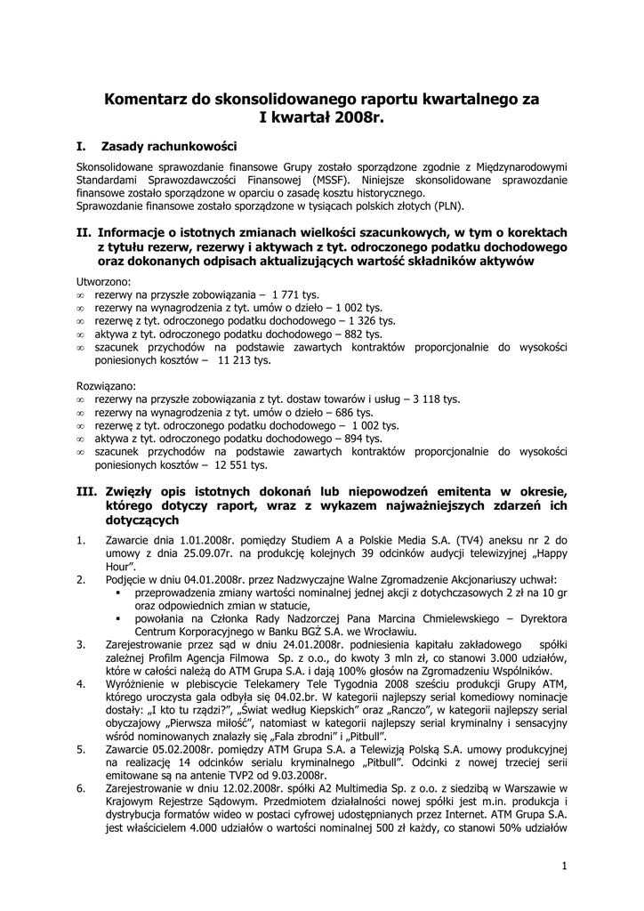 Komentarz do skonsolidowanego raportu kwartalnego za I kwartał 2008r. I. Zasady rachunkowości Skonsolidowane sprawozdanie finansowe Grupy zostało sporządzone zgodnie z Międzynarodowymi Standardami Sprawozdawczości Finansowej (MSSF). Niniejsze skonsolidowane sprawozdanie finansowe zostało sporządzone w oparciu o zasadę kosztu historycznego. Sprawozdanie finansowe zostało sporządzone w tysiącach polskich złotych (PLN). II. Informacje o istotnych zmianach wielkości szacunkowych, w tym o korektach z tytułu rezerw, rezerwy i aktywach z tyt. odroczonego podatku dochodowego oraz dokonanych odpisach aktualizujących wartość składników aktywów Utworzono: • rezerwy na przyszłe zobowiązania – 1 771 tys. • rezerwy na wynagrodzenia z tyt. umów o dzieło – 1 002 tys. • rezerwę z tyt. odroczonego podatku dochodowego – 1 326 tys. • aktywa z tyt. odroczonego podatku dochodowego – 882 tys. • szacunek przychodów na podstawie zawartych kontraktów proporcjonalnie do wysokości poniesionych kosztów – 11 213 tys. Rozwiązano: • rezerwy na przyszłe zobowiązania z tyt. dostaw towarów i usług – 3 118 tys. • rezerwy na wynagrodzenia z tyt. umów o dzieło – 686 tys. • rezerwę z tyt. odroczonego podatku dochodowego – 1 002 tys. • aktywa z tyt. odroczonego podatku dochodowego – 894 tys. • szacunek przychodów na podstawie zawartych kontraktów proporcjonalnie do wysokości poniesionych kosztów – 12 551 tys. III. Zwięzły opis istotnych dokonań lub niepowodzeń emitenta w okresie, którego dotyczy raport, wraz z wykazem najważniejszych zdarzeń ich dotyczących 1. 2. 3. 4. 5. 6. Zawarcie dnia 1.01.2008r. pomiędzy Studiem A a Polskie Media S.A. (TV4) aneksu nr 2 do umowy z dnia 25.09.07r. na produkcję kolejnych 39 odcinków audycji telewizyjnej „Happy Hour”. Podjęcie w dniu 04.01.2008r. przez Nadzwyczajne Walne Zgromadzenie Akcjonariuszy uchwał: przeprowadzenia zmiany wartości nominalnej jednej akcji z dotychczasowych 2 zł na 10 gr oraz odpowiednich zmian w statucie, powołania na Członka Rady Nadzorczej Pana Marcina Chmielewskiego – Dyrektora Centrum Korporacyjnego w Banku BGŻ S.A. we Wrocławiu. Zarejestrowanie przez sąd w dniu 24.01.2008r. podniesienia kapitału zakładowego spółki zależnej Profilm Agencja Filmowa Sp. z o.o., do kwoty 3 mln zł, co stanowi 3.000 udziałów, które w całości należą do ATM Grupa S.A. i dają 100% głosów na Zgromadzeniu Wspólników. Wyróżnienie w plebiscycie Telekamery Tele Tygodnia 2008 sześciu produkcji Grupy ATM, którego uroczysta gala odbyła się 04.02.br. W kategorii najlepszy serial komediowy nominacje dostały: „I kto tu rządzi?”, „Świat według Kiepskich” oraz „Ranczo”, w kategorii najlepszy serial obyczajowy „Pierwsza miłość”, natomiast w kategorii najlepszy serial kryminalny i sensacyjny wśród nominowanych znalazły się „Fala zbrodni” i „Pitbull”. Zawarcie 05.02.2008r. pomiędzy ATM Grupa S.A. a Telewizją Polską S.A. umowy produkcyjnej na realizację 14 odcinków serialu kryminalnego „Pitbull”. Odcinki z nowej trzeciej serii emitowane są na antenie TVP2 od 9.03.2008r. Zarejestrowanie w dniu 12.02.2008r. spółki A2 Multimedia Sp. z o.o. z siedzibą w Warszawie w Krajowym Rejestrze Sądowym. Przedmiotem działalności nowej spółki jest m.in. produkcja i dystrybucja formatów wideo w postaci cyfrowej udostępnianych przez Internet. ATM Grupa S.A. jest właścicielem 4.000 udziałów o wartości nominalnej 500 zł każdy, co stanowi 50% udziałów 1 7. 8. 9. 10. 11. 12. 13. w kapitale zakładowym Spółki. Pozostałe 4.000 udziałów o wartości nominalnej 500 zł kazdy objęła Agora S.A. z siedzibą w Warszawie. Zawarcie 12.02.2008r. pomiędzy ATM Grupa S.A. oraz Telewizją Polsat S.A. aneksu do umowy z dn. 01.03.2007r. na realizację kolejnych 26 odcinków sitcomu „ I kto tu rządzi”. Podjęcie 29.02.2008r. na posiedzeniu Rady Nadzorczej ATM Grupy S.A. uchwały o zmianie funkcji Macieja Grzywaczewskiego z członka zarządu na wiceprezesa zarządu spółki. Nominacja w lutym br. sitcomu „Halo Hans” produkowanego przez Studio A Sp. z o.o. do prestiżowej nagrody „Złotej Róży” w międzynarodowym festiwalu Rose d’Or. Jest to druga już nominacja dla Grupy Kapitałowej ATM po serialu „Pierwsza Miłość”. Emisja od 9 marca 2008r. na antenie Telewizji Polsat programu muzycznego produkowanego przez Profilm AF Sp. z o.o. „Przebojowe dzieci”. Realizacja nowego show z udziałem dzieci jest konsekwencją przyjętej strategii spółki Profilm zwiększenia oferty programowej skierowanej do najmłodszych widzów. Dokonanie w dniu 14.03.2008r. splitu akcji spółki ATM Grupa S.A. Zmiana wartości nominalnej jednej akcji z dotychczasowych 2 zł na 10 gr spowodowała 20-krotne zwiększenie liczby akcji z 4.300.000 do 86.000.000, z czego akcji serii B, C i D będących w obrocie giełdowym z 3.150.000 do 63.000.000 akcji. Kapitał zakładowy ATM Grupy nie uległ zmianie i wynosi 8.600.000 zł. Zawarcie 28.03.2008r. pomiędzy ATM Grupa S.A. a Telewizją Polsat S.A. umowy produkcyjnej na realizację 15 odcinków nowego teleturnieju „Strzał w 10”. Uruchomienie w marcu 2008r. nowego serwisu internetowego Grupy ATM. Witryna adresowana jest do potencjalnych inwestorów, a także do fanów produkcji realizowanych przez spółki ATM oraz dziennikarzy. Prezentuje bieżące informacje korporacyjne o ATM Grupie oraz aktualności z życia spółki. IV. Opis czynników i zdarzeń, w szczególności o nietypowym charakterze, mających znaczący wpływ na osiągnięte wyniki finansowe Podstawowe wielkości służące ocenie rentowności Grupy przedstawiają tabele. Tabela 1. Wybrane dane finansowe za I kwartał 2008 i 2007. OPIS Przychody netto ze sprzedaży Zmiana Zysk ze sprzedaży Zmiana Marża Zysk z działalności operacyjnej Zmiana Marża EBITDA Zmiana Marża Zysk netto Zmiana Marża I kwartał 2008 od 01.01.2008 do 31.03.2008 