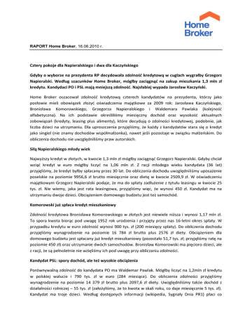 RAPORT Home Broker, 16.06.2010 r. Cztery pokoje dla Napieralskiego i dwa dla Kaczyoskiego Gdyby o wyborze na prezydenta RP decydowała zdolnośd kredytową w cuglach wygrałby Grzegorz Napieralski. Według szacunków Home Broker, mógłby zaciągnąd na zakup mieszkania 1,3 mln zł kredytu. Kandydaci PO i PSL mają mniejszą zdolnośd. Najsłabiej wypada Jarosław Kaczyoski. Home Broker oszacował zdolnośd kredytową czterech kandydatów na prezydenta, którzy jako posłowie mieli obowiązek złożyd oświadczenia majątkowe za 2009 rok: Jarosława Kaczyoskiego, Bronisława Komorowskiego, Grzegorza Napieralskiego i Waldemara Pawlaka (kolejnośd alfabetyczna). Na ich podstawie określiliśmy miesięczny dochód oraz wysokośd aktualnych zobowiązao (kredyty, leasing plus alimenty), które decydują o zdolności kredytowej, podobnie, jak liczba dzieci na utrzymaniu. Dla uproszczenia przyjęliśmy, że każdy z kandydatów stara się o kredyt jako singiel (nie znamy dochodów współmałżonka), nawet jeśli pozostaje w związku małżeoskim. Do obliczenia dochodu nie uwzględniliśmy praw autorskich. Siłą Napieralskiego młody wiek Najwyższy kredyt w złotych, w kwocie 1,3 mln zł mógłby zaciągnąd Grzegorz Napieralski. Gdyby chciał wziąd kredyt w euro mógłby liczyd na 1,06 mln zł. Z racji młodego wieku kandydata (36 lat) przyjęliśmy, że kredyt byłby spłacany przez 30 lat. Do obliczenia dochodu uwzględniliśmy uposażenie poselskie na poziomie 9956,6 zł brutto miesięcznie oraz dietę w kwocie 2509,9 zł. W oświadczeniu majątkowym Grzegorz Napieralski podaje, że ma do spłaty zadłużenie z tytułu leasingu w kwocie 25 tys. zł. Nie wiemy, jaka jest rata leasingowa, przyjęliśmy więc, że wynosi 450 zł. Kandydat ma na utrzymaniu dwoje dzieci. Obciążeniem domowego budżetu jest też samochód. Komorowski już spłaca kredyt mieszkaniowy Zdolnośd kredytowa Bronisława Komorowskiego w złotych jest niewiele niższa i wynosi 1,17 mln zł. To spora kwota biorąc pod uwagę 1952 rok urodzenia i przyjęty przez nas 16-letni okres spłaty. W przypadku kredytu w euro zdolnośd wynosi 900 tys. zł (200 miesięcy spłaty). Do obliczenia dochodu przyjęliśmy wynagrodzenie na poziomie 16 784 zł brutto plus 2576 zł diety. Obciążeniem dla domowego budżetu jest spłacany już kredyt mieszkaniowy (pozostało 51,7 tys. zł; przyjęliśmy ratę na poziomie 450 zł) oraz utrzymanie dwóch samochodów. Bronisław Komorowski ma pięcioro dzieci, ale z racji, że są pełnoletnie nie wzięliśmy ich pod uwagę przy obliczaniu zdolności. Kandydat PSL: spory dochód, ale też wysokie obciążenia Porównywalną zdolnośd do kandydata PO ma Waldemar Pawlak. Mógłby liczyd na 1,2mln zł kredytu w polskiej walucie i 790 tys. zł w euro (284 miesiące). Do obliczenia zdolności przyjęliśmy wynagrodzenie na poziomie 14 379 zł brutto plus 2097,6 zł diety. Uwzględniliśmy także dochód z działalności rolniczej – 55 tys. zł (założyliśmy, że to kwota w skali roku, co daje miesięcznie 5 tys. zł). Kandydat ma troje dzieci. Według dostępnych informacji (wikipedia, Sygnały Dnia PR1) płaci co miesiąc 6400 zł alimentów. Waldemar Pawlak ma jeden samochód i do spłacenia 12 tys. zł zadłużenia z tytułu leasingu (przyjęliśmy miesięczną ratę na poziomie 350 zł). Kaczyoski tylko na pensji sejmowej Na ostatnim miejscu pod względem zdolności znalazł się Jarosław Kaczyoski. Z naszych szacunków wynika, że mógłby liczyd na 740 tys. zł kredytu w polskiej walucie oraz 525 tys. zł w euro. Okres kredytowania to 170 miesięcy z uwagi na wiek (61 lat). Zdolnośd obliczyliśmy na podstawie dochodu z tytułu uposażenia poselskiego w kwocie 9786 zł brutto oraz diety 2447 zł. Jarosław Kaczyoski nie zadeklarował posiadania samochodu, jego budżet obciąża natomiast kredyt w kwocie 15 tys. zł. Przyjęliśmy, że miesięczna rata z tytułu tego zadłużenia wynosi 250 zł. Od 57 do 140 m kw. W kolejnym kroku sprawdziliśmy, jakie mieszkanie mogliby kupid kandydaci w Warszawie wykorzystując w pełni swoją zdolnośd kredytową. Przyjmując średnią cenę ofertową na poziomie 9284 zł, Grzegorz Napieralski mógłby kupid 140 m kw. (co najmniej cztery pokoje). Niewiele mniej Waldemar Pawlak (129 m kw.) i Bronisław Komorowski (126 m kw.). Jarosław Kaczyoskim mógłby sobie pozwolid na prawie 80 m kw. (trzy pokoje). Dla kredytów w euro dostępny metraż byłby mniejszy. W przypadku Jarosława Kaczyoskiego skurczyłby się do 57 m kw., czyli dwóch pokoi. Imię i nazwisko kandydata Waldemar Pawlak Grzegorz Napieralski Bronisław Komorowski Jarosław Kaczyński Średnia cena ofertowa mieszkań w Warszawie 9 284,25 zł Metraż możliwy do nabycia za kredyt w Warszawie w PLN w EUR 129,3 140,0 126,0 79,7 85,1 114,6 96,9 56,5 Sprawdziliśmy też, jakie nieruchomości mogliby kupid kandydaci. Dla kandydatów PiS i PO mamy oferty w Warszawie, dla kandydata SLD w Szczecinie (miejsce urodzenia), a dla kandydata PSL w Żyrardowie (miejsce zamieszkania). Dom z ogrodem dla kandydata SLD Grzegorz Napieralski za 1,25 mln zł mógłby zostad właścicielem nowego domu o powierzchni 200 m kw. na północy Szczecina. Dom wzniesiony z betonu komórkowego z poddaszem użytkowym został pokryty dachówką cementową. Dom jest wykooczony w dobrym standardzie z takimi udogodnieniami, jak: ogrzewanie podłogowe, parapety z marmuru, centralny odkurzacz i drewniana stolarka okienna. Działka, na której stoi dom ma powierzchnię blisko 1000 m kw. Apartament z widokiem dla Komorowskiego Bronisław Komorowski za cenę 1,15 mln zł może sobie pozwolid na zakup jednopokojowego apartamentu o powierzchni 99,1 m kw. na ostatnim, dziesiątym piętrze nowopowstającego kompleksu mieszkalno – usługowego „Kaskada” na Woli. W przyszłości planowana jest w okolicy budowa stacji drugiej linii metra. Dużym atutem apartamentu jest taras o powierzchni przeszło 50 m kw. Okazała posesja dla kand