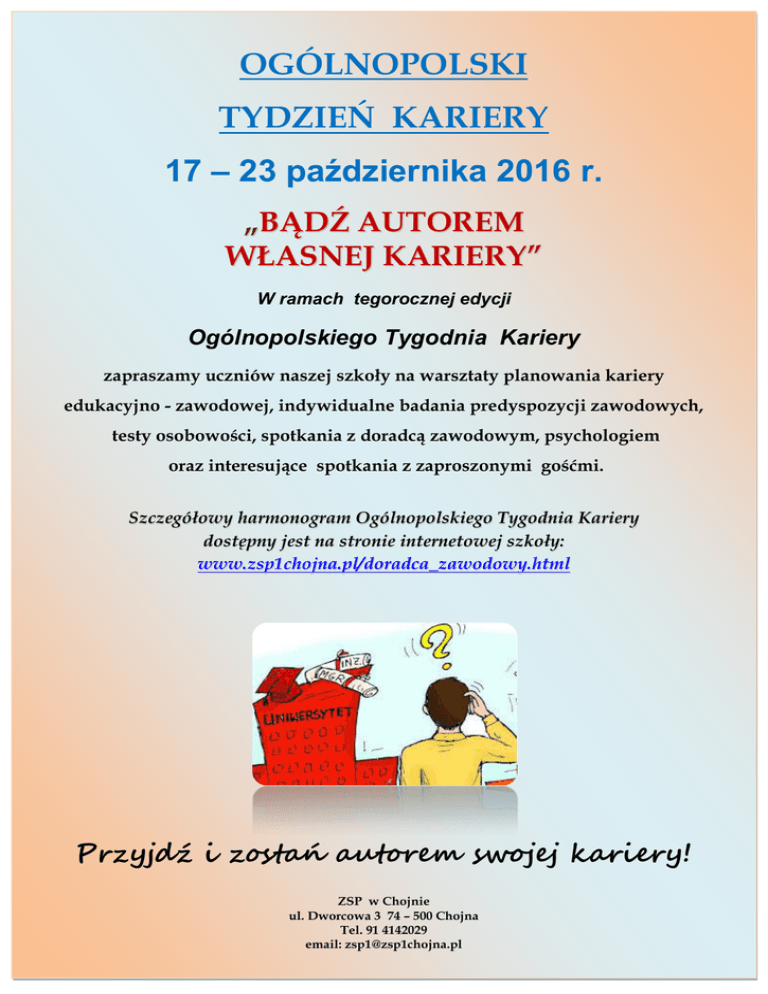 OGÓLNOPOLSKI TYDZIEŃ KARIERY 17 – 23 października 2016 r. „BĄDŹ AUTOREM WŁASNEJ KARIERY” W ramach tegorocznej edycji Ogólnopolskiego Tygodnia Kariery zapraszamy uczniów naszej szkoły na warsztaty planowania kariery edukacyjno - zawodowej, indywidualne badania predyspozycji zawodowych, testy osobowości, spotkania z doradcą zawodowym, psychologiem oraz interesujące spotkania z zaproszonymi gośćmi. Szczegółowy harmonogram Ogólnopolskiego Tygodnia Kariery dostępny jest na stronie internetowej szkoły: www.zsp1chojna.pl/doradca_zawodowy.html Przyjdź i zostań autorem swojej kariery! ZSP w Chojnie ul. Dworcowa 3 74 – 500 Chojna Tel. 91 4142029 email: [email protected]