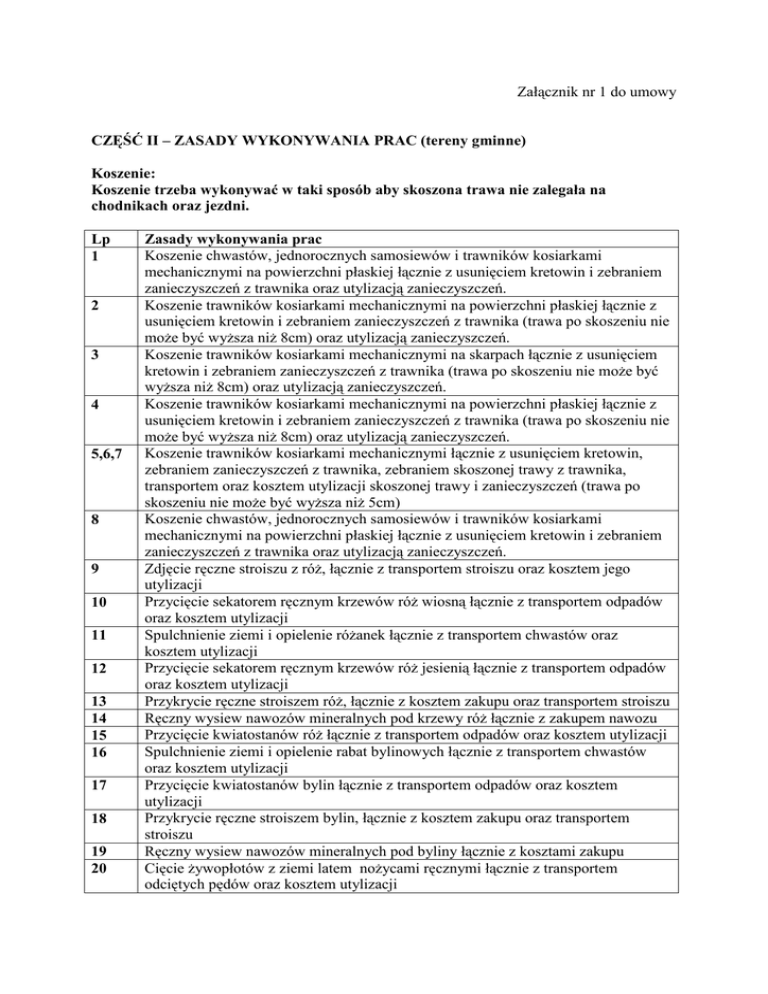 Załącznik nr 1 do umowy CZĘŚĆ II – ZASADY WYKONYWANIA PRAC (tereny gminne) Koszenie: Koszenie trzeba wykonywać w taki sposób aby skoszona trawa nie zalegała na chodnikach oraz jezdni. Lp 1 2 3 4 5,6,7 8 9 10 11 12 13 14 15 16 17 18 19 20 Zasady wykonywania prac Koszenie chwastów, jednorocznych samosiewów i trawników kosiarkami mechanicznymi na powierzchni płaskiej łącznie z usunięciem kretowin i zebraniem zanieczyszczeń z trawnika oraz utylizacją zanieczyszczeń. Koszenie trawników kosiarkami mechanicznymi na powierzchni płaskiej łącznie z usunięciem kretowin i zebraniem zanieczyszczeń z trawnika (trawa po skoszeniu nie może być wyższa niż 8cm) oraz utylizacją zanieczyszczeń. Koszenie trawników kosiarkami mechanicznymi na skarpach łącznie z usunięciem kretowin i zebraniem zanieczyszczeń z trawnika (trawa po skoszeniu nie może być wyższa niż 8cm) oraz utylizacją zanieczyszczeń. Koszenie trawników kosiarkami mechanicznymi na powierzchni płaskiej łącznie z usunięciem kretowin i zebraniem zanieczyszczeń z trawnika (trawa po skoszeniu nie może być wyższa niż 8cm) oraz utylizacją zanieczyszczeń. Koszenie trawników kosiarkami mechanicznymi łącznie z usunięciem kretowin, zebraniem zanieczyszczeń z trawnika, zebraniem skoszonej trawy z trawnika, transportem oraz kosztem utylizacji skoszonej trawy i zanieczyszczeń (trawa po skoszeniu nie może być wyższa niż 5cm) Koszenie chwastów, jednorocznych samosiewów i trawników kosiarkami mechanicznymi na powierzchni płaskiej łącznie z usunięciem kretowin i zebraniem zanieczyszczeń z trawnika oraz utylizacją zanieczyszczeń. Zdjęcie ręczne stroiszu z róż, łącznie z transportem stroiszu oraz kosztem jego utylizacji Przycięcie sekatorem ręcznym krzewów róż wiosną łącznie z transportem odpadów oraz kosztem utylizacji Spulchnienie ziemi i opielenie różanek łącznie z transportem chwastów oraz kosztem utylizacji Przycięcie sekatorem ręcznym krzewów róż jesienią łącznie z transportem odpadów oraz kosztem utylizacji Przykrycie ręczne stroiszem róż, łącznie z kosztem zakupu oraz transportem stroiszu Ręczny wysiew nawozów mineralnych pod krzewy róż łącznie z zakupem nawozu Przycięcie kwiatostanów róż łącznie z transportem odpadów oraz kosztem utylizacji Spulchnienie ziemi i opielenie rabat bylinowych łącznie z transportem chwastów oraz kosztem utylizacji Przycięcie kwiatostanów bylin łącznie z transportem odpadów oraz kosztem utylizacji Przykrycie ręczne stroiszem bylin, łącznie z kosztem zakupu oraz transportem stroiszu Ręczny wysiew nawozów mineralnych pod byliny łącznie z kosztami zakupu Cięcie żywopłotów z ziemi latem nożycami ręcznymi łącznie z transportem odciętych pędów oraz kosztem utylizacji 21 22 23-26 27 28 29 30 31 32 33 34 35 36 37 38 39 40 41 42 43 44 45 46 47 48 49-53 Cięcie żywopłotów z ziemi zimą nożycami ręcznymi łącznie z transportem odciętych pędów oraz kosztem utylizacji Spulchnienie ziemi i opielenie żywopłotów łącznie z transportem chwastów oraz kosztem utylizacji Przekopanie i pielenie skupin bez kolców łącznie z transportem oraz kosztem utylizacji Wygrabienie liści ze skupin wiosną łącznie z transportem oraz kosztem utylizacji Wygrabienie liści ze skupin jesienią łącznie z transportem oraz kosztem utylizacji Wygrabienie liści z trawników jesienią łącznie z transportem oraz kosztem utylizacji Obcinanie brzegów trawnika przy różankach Obcinanie brzegów trawnika przy skupinach Przycięcie krzewów w pierwszym roku po posadzeniu łącznie z transportem gałęzi oraz kosztem utylizacji Redukcja krzewów bez kolców o wysokości korony do 1m (1 szt. krzewu = 1m2) redukcja krzewów od 50-75% objętości korony Redukcja krzewów bez kolców o wysokości korony pow. 1m (1 szt. krzewu = 1m2) redukcja krzewów od 50-75% objętości korony Darniowanie pełne terenu płaskiego łącznie z transportem darni ze SWŚ GWDA (bez kosztów zakupu darni) Nieprzewidziane prace pielęgnacyjne wykonywane w trakcie sezonu wegetacyjnego na wyraźne polecenie Zamawiającego (zakres ustalany przed rozpoczęciem prac) Wertykulacja trawników łącznie z usunięciem wybranej trawy z trawnika, transportem oraz kosztem jej utylizacji. Odmładzanie żywopłotów bez kolców – drewno miękkie łącznie z transportem pędów oraz kosztem utylizacji Karczowanie krzewów o śr. Korony do 1m łącznie z transportem krzewów i korzeni oraz kosztem utylizacji Karczowanie krzewów o śr. Korony ponad 1m łącznie z transportem krzewów i korzeni oraz kosztem utylizacji Ręczny wysiew nawozów mineralnych (trawniki) łącznie z kosztami zakupu Wykonanie trawników dywanowych siewem: ręczne wyrównanie powierzchni, ręczne przekopanie gleby, rozrzucenie nawozów mineralnych i zagrabianie, wysianie nasion, zahakowanie grabiami oraz ubicie powierzchni. Rozścielenie ziemi urodzajnej (warstwa do 10cm) łącznie z transportem ziemi ze SWŚ GWDA (bez kosztów zakupu ziemi) zgodnie z opisem do KNR 2-21 0111-01 zgodnie z opisem do KNR 2-21 0111-02 zgodnie z opisem do KNR 2-21 0111-03 zgodnie z opisem do KNR 2-21 0111-04 zgodnie z opisem do KNR 2-21 0111-05 wybór konarów i gałęzi do usunięcia - odcięcie piłą mechaniczną gałęzi, konarów i oraz opuszczenie ich linach - ułożenie gałęzi i konarów w stosy z ewentualnym przemieszczeniem na odległość do 10 metrów. 54-58 59 określenie gałęzi w złym stanie zdrowotnym, - odcięcie piłą mechaniczną gałęzi, konarów i oraz opuszczenie ich linach - ułożenie gałęzi i konarów w stosy z ewentualnym przemieszczeniem na odległość do 10 metrów. zgodnie z opisem do KNR 2-21 0111-06 60 61 62 63 64 65 66 zgodnie z opisem do KNR 2-21 0111-07 zgodnie z opisem do KNR 2-21 0111-08 zgodnie z opisem do KNR 2-21 0111-09 zgodnie z opisem do KNR 2-21 0111-10 zgodnie z opisem do KNP 01 1350-02.01 zgodnie z opisem do KNP 01 1346-03.01 Wybór odpowiednich