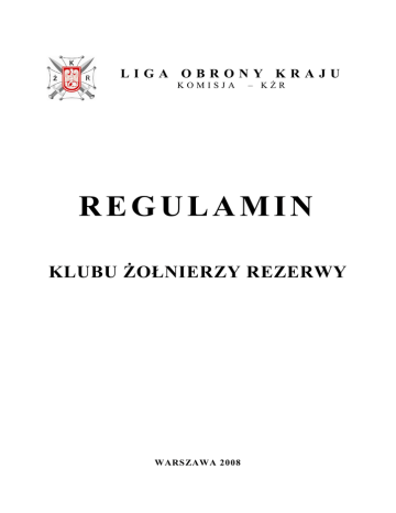 LIGA OBRONY KRAJU KOMISJA – KŻR REGULAMIN KLUBU ŻOŁNIERZY REZERWY WARSZAWA 2008 2 ROZDZIAŁ I POSTANOWIENIA OGÓLNE §1 Klub żołnierzy rezerwy, w myśl postanowień Statutu Ligi Obrony Kraju (§ 10 ust. 2) jest podstawową jednostką organizacyjną LOK, urzeczywistniającą program Stowarzyszenia oraz zapewniającą realizację celów statutowych. §2 1. Kluby Żołnierzy Rezerwy są podporządkowane właściwym zarządom rejonowym (powiatowym) albo miejskim, gminnym – równorzędnym. W uzasadnionych przypadkach mogą być podporządkowane bezpośrednio zarządom wojewódzkim LOK. 2. Stanowią one główne źródło społecznej kadry instruktorskiej Ligi Obrony Kraju oraz spełniają rolę inspiratorsko-organizatorską w realizacji zadań statutowych i programowych LOK. 3. W celu realizacji postanowień Statutu LOK dotyczących zapewnienia warunków sprzyjających wielokierunkowej działalności klubów, zarządy miejskie, gminne oraz rejonowe (powiatowe) i wojewódzkie LOK zobowiązane są do udzielania im wszechstronnej pomocy w wykonywaniu zaplanowanych przedsięwzięć. §3 Kluby Żołnierzy Rezerwy zrzeszają oficerów, podchorążych, podoficerów i szeregowych Wojska Polskiego pozostających w rezerwie, lub w stanie spoczynku, którzy pragną aktywnie uczestniczyć w realizacji zadań statutowych Ligi Obrony Kraju oraz sympatyków wojskowości i strzelectwa (kobiety i osoby bez stopnia wojskowego przeniesieni do rezerwy). §4 Zasadniczym celem działalności klubów żołnierzy rezerwy jest: 1) przygotowanie członków KŻR do wykonywania zadań w systemie obrony militarnej i obrony cywilnej RP poprzez podtrzymywanie i rozwijanie wiedzy i praktycznych umiejętności fachowo-wojskowych swoich członków; 2) mobilizowanie członków KŻR do aktywnego udziału w procesie patriotycznego wychowania i przysposobienia obronnego społeczeństwa, a zwłaszcza młodzieży szkolnej i harcerzy. §5 Kluby dążą do osiągania statutowych celów LOK poprzez: 1) umacnianie więzi koleżeńskiej wśród członków klubu oraz między członkami klubu a kadrą zawodową Wojska Polskiego; 2) kształtowanie i umacnianie więzi społeczeństwa z Wojskiem Polskim oraz szacunku dla symboli narodowych i wojskowych; 3 3) uczestnictwo członków klubu w wychowaniu patriotycznym oraz w szkoleniu obronnym społeczeństwa, a zwłaszcza młodzieży; 4) udzielanie, w miarę posiadanych możliwości, wszelkiej pomocy członkom klubu; 5) wykonywanie innych zadań, zwłaszcza uchwalonych przez walne zebranie członków klubu, zebrania delegatów organizacji gminnych, miejskich, rejonowych (powiatowych) i wojewódzkich LOK; 6) wykonywanie teoretycznych i praktycznych szkoleń z zakresu obrony militarnej i cywilnej RP. §6 W celu właściwego wykonania zadań statutowych i programowych LOK, kluby żołnierzy rezerwy współpracują z polskimi jednostkami wojskowymi, WSzW i WKU oraz innymi organami wojskowymi, realizując postanowienia „POROZUMIENIA O WSPÓŁPRACY LIGI OBRONY KRAJU Z JEDNOSTKAMI ORGANIZACYJNYMI RESORTU OBRONY NARODOWEJ” zawarte w dniu 26 lipca 1995 r. §7 Kluby żołnierzy rezerwy powinny także współdziałać z innymi organizacjami i stowarzyszeniami społecznymi, zwłaszcza paramilitarnymi, kombatanckimi, w realizacji celów i zadań statutowych Ligi. §8 1. Kluby żołnierzy rezerwy mogą przyjmować nazwy historyczne lub regionalne. 2. Mają one prawo używać stempla podłużnego z napisem: LIGA OBRONY KRAJU KLUB ŻOŁNIERZY REZERWY …………………………………………………………….. (nazwa klubu) w ………………………………………………………….. (miejscowość) 3. Klub może posiadać swój sztandar. Wzór sztandaru powinien być zgodny z wytycznymi Zarządu Głównego LOK w tej sprawie. §9 Kluby żołnierzy rezerwy LOK mogą współpracować z organizacjami innych państw o podobnym charakterze i zbliżonych założeniach programowych za zgodą Zarządu Wojewódzkiego LOK. 4 ROZDZIAŁ II CZŁONKOWIE KLUBU, ICH PRAWA I OBOWIĄZKI § 10 Członkostwo w klubie żołnierzy rezerwy jest dobrowolne. Nabywa się je na podstawie pisemnej deklaracji (wzór załącznik Nr 1) z dniem podjęcia uchwały w tej sprawie przez zarząd klubu. § 11 Członkowie klubu dzielą się na: 1) członków zwyczajnych, 2) członków honorowych, 3) członków wspierających. § 12 1. Członkami zwyczajnymi klubu mogą być żołnierze rezerwy posiadający stopnie wojskowe określone w § 3 niniejszego regulaminu, podporządkowujący się postanowieniem Statutu LOK. 2. Członkostwo w klubie jest równoznaczne z przynależnością do Ligi Obrony Kraju. § 13 1. Członkiem honorowym Klubu może być osoba fizyczna szczególnie zasłużona w realizacji zadań programowych klubów żołnierzy rezerwy. 2. Godność Honorowego Członka KŻR LOK może nadawać walne zebranie członków na wniosek zarządu klubu (Statut LOK - § 25 ust. 4). § 14 Członkom zwyczajnym i honorowym wręczane są legitymacje. Wzory legitymacji – załączniki nr 2 i nr 3. § 15 Członkowie zwyczajni i honorowi mają prawo: 1) wybierać i być wybierani do zarządu klubu oraz innych władz stowarzyszenia, m.in. do zarządu gminnego, miejskiego, rejonowego; 2) uczestniczyć w zebraniach i szkoleniu członków klubu oraz imprezach patriotycznowychowawczych, zawodach sportowych i innych przedsięwzięciach organizowanych przez Ligię Obrony Kraju; 5 3) zgłaszać wnioski i propozycje do władz Ligi Obrony Kraju dotyczące doskonalenia działalności LOK, KŻR i w innych sprawach; 4) odwoływać się do władz LOK wyższego stopnia – zarządu rejonowego (powiatowego) wojewódzkiego od decyzji podjętych przez zarząd klubu dotyczących jego osoby, w terminie do 14 dni; 5) reprezentować macierzysty klub żołnierzy rezerwy na zawodach sportowych LOK, imprezach patriotyczno-wychowawczych i innych; 6) korzystać ze sprzętu, urządzeń broni sportowej stanowiącej własność Ligi Obrony Kraju na z