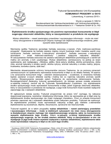 Trybunał Sprawiedliwości Unii Europejskiej KOMUNIKAT PRASOWY nr 64/15 Luksemburg, 4 czerwca 2015 r. Kontakty z Mediami i Informacja Wyrok w sprawie C-195/14 Bundesverband der Verbraucherzentralen und Verbraucherverbände – Verbraucherzentrale Bundesverband e.V. / Teekanne GmbH & Co. KG Etykietowanie środka spożywczego nie powinno wprowadzać konsumenta w błąd sugerując obecność składnika, który w rzeczywistości w produkcie nie występuje Wykaz składników – nawet zawierający prawdziwe i wyczerpujące informacje – może nie mieć mocy skorygowania w dostatecznym stopniu mylnego lub niejednoznacznego wrażenia, jakie wywarło takie etykietowanie Niemiecka spółka Teekanne sprzedaje herbatę owocową o nazwie „Felix malinowo-waniliowa przygoda”. Opakowanie tej herbaty zawiera między innymi ilustracje malin i kwiatów wanilii oraz oznaczenia „herbata owocowa z naturalnymi aromatami”, „herbata owocowa z naturalnymi aromatami – smak malinowo-waniliowy” i „zawiera wyłącznie naturalne składniki”. W rzeczywistości herbata owocowa nie zawiera naturalnych składników pochodzących z wanilii lub maliny ani aromatu z nich uzyskanego. Wykaz składników, zamieszczony na jednej ze ścian opakowania, jest następujący: „Hibiskus, jabłko, liście jeżyny słodkiej, skórka pomarańczy, dzika róża, aromat naturalny o smaku wanilii, skórka cytryny, aromat naturalny o smaku maliny, jeżyna, truskawka, borówka czarna, dziki bez”. Niemieckie stowarzyszenie ochrony konsumentów zarzuca Teekanne, że za pomocą oznaczeń zamieszczonych na opakowaniu wprowadza konsumenta w błąd co do składu herbaty. W oparciu o te oznaczenia konsument mógł – zdaniem stowarzyszenia – oczekiwać, iż omawiana herbata będzie zawierać w swym składzie wanilię i malinę lub co najmniej naturalne aromaty wanilii i maliny. Stowarzyszenie wezwało zatem Teekanne do zaniechania reklamowania herbaty. Bundesgerichtshof (federalny trybunał sprawiedliwości), do którego sprawa została wniesiona w ostatniej instancji, zwrócił się do Trybunału Sprawiedliwości z pytaniem, czy etykietowanie środka spożywczego może wprowadzić konsumenta w błąd, jeżeli sugeruje obecność składnika, który w rzeczywistości w produkcie nie występuje, a jego brak konsument może wywieść wyłącznie zapoznając się z wykazem składników. W ogłoszonym dzisiaj wyroku Trybunał przypomniał, że prawo Unii1 wymaga, by nabywca dysponował poprawną, neutralną i obiektywną informacją, która nie wprowadza go w błąd oraz by etykietowanie środka spożywczego nie miało mylącego charakteru. Choć co prawda konsument powinien zapoznać się z wykazem składników przed nabyciem produktu, Trybunał nie wykluczył, że etykietowanie produktu może wprowadzać nabywcę w błąd, gdy niektóre z elementów etykietowania są oszukańcze, błędne, dwuznaczne, sprzeczne lub niezrozumiałe. Trybunał wyjaśnił, że w takim przypadku wykaz składników – nawet zawierający prawdziwe i wyczerpujące informacje – może w niektórych sytuacjach nie mieć mocy skorygowania w dostatecznym stopniu mylnego lub niejednoznacznego wrażenia, jakie na konsumencie wywarło etykietowanie tego środka. Zatem w sytuacji, w której etykietowanie środka spożywczego sugeruje, że ów środek zawiera składnik, który w rzeczywistości w nim nie występuje (a jego brak można wywieść wyłącznie z wykazu składników), etykietowanie takie może wprowadzać nabywcę w błąd co do cech tego środka. 1 Dyrektywa 2000/13/WE Parlamentu Europejskiego i Rady z dnia 20 marca 2000 r. w sprawie zbliżenia ustawodawstw państw członkowskich w zakresie etykietowania, prezentacji i reklamy środków spożywczych (Dz.U. L 109, s. 29), zmieniona rozporządzeniem Parlamentu Europejskiego i Rady (WE) nr 596/2009 z dnia 18 czerwca 2009 r. (Dz.U. L 188, s. 14). www.curia.europa.eu Sąd krajowy powinien tym samym dokonać analizy poszczególnych elementów składających się na etykietowanie herbaty owocowej w celu ustalenia, czy przeciętny, odpowiednio poinformowany oraz dostatecznie uważny i rozsądny konsument może zostać wprowadzony w błąd co do obecności w składzie tej herbaty maliny i kwiatów wanilii lub aromatów uzyskanych z tych składników. W ramach wspomnianej analizy sąd krajowy powinien w szczególności wziąć pod uwagę użyte wyrażenia i obrazy oraz rozmieszczenie, wielkość, kolor, czcionkę, język, składnię i interpunkcję poszczególnych elementów umieszczonych na opakowaniu herbaty owocowej. UWAGA: Odesłanie prejudycjalne pozwala sądom państw członkowskich, w ramach rozpatrywanego przez nie sporu, zwrócić się do Trybunału z pytaniem o wykładnię prawa Unii lub o ocenę ważności aktu Unii. Trybunał nie rozpoznaje sporu krajowego. Do sądu krajowego należy rozstrzygnięcie sprawy zgodnie z orzeczeniem Trybunału. Orzeczenie to wiąże w ten sam sposób inne sądy krajowe, które spotkają się z podobnym problemem. Dokument nieoficjalny, sporządzony na użytek mediów, który nie wiąże Trybunału Sprawiedliwości. Pełny tekst wyroku znajduje się na stronie internetowej CURIA w dniu ogłoszenia Osoba odpowiedzialna za kontakty z mediami: Ireneusz Kolowca (+352) 4303 2793 www.curia.europa.eu
