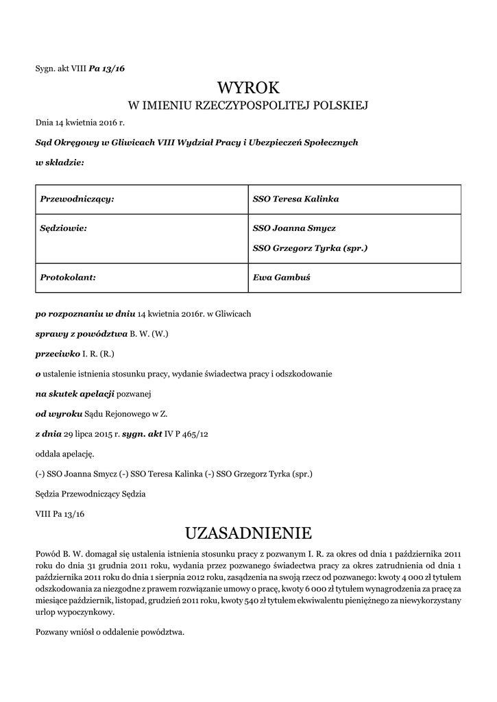 Sygn. akt VIII Pa 13/16 WYROK W IMIENIU RZECZYPOSPOLITEJ POLSKIEJ Dnia 14 kwietnia 2016 r. Sąd Okręgowy w Gliwicach VIII Wydział Pracy i Ubezpieczeń Społecznych w składzie: Przewodniczący: SSO Teresa Kalinka Sędziowie: SSO Joanna Smycz SSO Grzegorz Tyrka (spr.) Protokolant: Ewa Gambuś po rozpoznaniu w dniu 14 kwietnia 2016r. w Gliwicach sprawy z powództwa B. W. (W.) przeciwko I. R. (R.) o ustalenie istnienia stosunku pracy, wydanie świadectwa pracy i odszkodowanie na skutek apelacji pozwanej od wyroku Sądu Rejonowego w Z. z dnia 29 lipca 2015 r. sygn. akt IV P 465/12 oddala apelację. (-) SSO Joanna Smycz (-) SSO Teresa Kalinka (-) SSO Grzegorz Tyrka (spr.) Sędzia Przewodniczący Sędzia VIII Pa 13/16 UZASADNIENIE Powód B. W. domagał się ustalenia istnienia stosunku pracy z pozwanym I. R. za okres od dnia 1 października 2011 roku do dnia 31 grudnia 2011 roku, wydania przez pozwanego świadectwa pracy za okres zatrudnienia od dnia 1 października 2011 roku do dnia 1 sierpnia 2012 roku, zasądzenia na swoją rzecz od pozwanego: kwoty 4 000 zł tytułem odszkodowania za niezgodne z prawem rozwiązanie umowy o pracę, kwoty 6 000 zł tytułem wynagrodzenia za pracę za miesiące październik, listopad, grudzień 2011 roku, kwoty 540 zł tytułem ekwiwalentu pieniężnego za niewykorzystany urlop wypoczynkowy. Pozwany wniósł o oddalenie powództwa. Na uzasadnienie podano, że pozwany spełnił na rzecz powoda wszelkie należności wynikające ze stosunku pracy. Wyrokiem z dnia 29 lipca 2015 roku Sąd Rejonowy w Z. ustalił, że strony łączył stosunek pracy oparty na umowie o pracę w okresie od dnia 1 października 2011 roku do dnia 31 grudnia 2011 roku, nakazał pozwanemu wydać powodowi świadectwo pracy za okres od dnia 1 października 2011 roku do dnia 31 grudnia 2011 roku, zasądził od pozwanego na rzecz powoda kwotę 3 000 zł tytułem odszkodowania za niezgodne z prawem rozwiązanie umowy o pracę, oddalił powództwo w pozostałym zakresie i orzekł o kosztach sądowych. W pisemnym uzasadnieniu Sąd I instancji ustalił, że w dniu 1 października 2011 roku powód rozpoczął pracę u pozwanego na stanowisku instalatora. Wcześniej strony ustaliły ustnie warunki pracowniczego zatrudnienia. Powód świadczył pracę na rzecz pozwanego codziennie, osobiście, w godzinach od 07:00 do 15:00. Do obowiązków pracowniczych powoda należało: demontowanie starych instalacji grzewczych i montowanie nowych. Pracę powoda kontrolował brygadzista M. T. lub pozwany. Wynagrodzenie za pracę miało charakter prowizyjny i stanowiło udział w wartości danego zlecenia. Sąd I instancji ustalił, że w okresie od dnia 1 października 2011 roku do 31 grudnia 2011 roku powód świadczył pracę na terenie firmy (...) – Przedsiębiorstwa (...) w R., na terenie Centrum (...) w R., u prywatnej osoby w G. przy ul. (...), w prywatnym domu w N., na terenie budynku Straży Granicznej w R., na terenie firmy (...) w Z.. Sąd I instancji ustalił, że w dniu 2 stycznia 2012 roku powód i pozwany podpisali umowę o pracę na czas określony, tj. od dnia 2 stycznia 2012 roku do dnia 31 marca 2012 roku. Powodowi powierzono stanowisko instalatora wod.–kan. i c.o. w pełnym wymiarze czasu pracy, z miesięcznym wynagrodzeniem w wysokości 1 500 zł. W dniu 1 kwietnia 2012 roku strony zawarły kolejną umowę o pracę na czas określony, do dnia 30 września 2012 roku, której warunki były powtórzeniem warunków umowy z dnia 2 stycznia 2012 roku. Żadna z umów nie zawierała klauzuli dopuszczającej możliwość jej wcześniejszego rozwiązania przez którąkolwiek ze stron stosunku pracy. Sąd I instancji ustalił, że za cały okres zatrudnienia powód otrzymał wynagrodzenie za pracę. Przełożony M. T. prowadził zeszyt, w którym odnotowywał, czy pracownicy wykonują zlecone im prace, spisywał roboty, które zostały wykonane przez poszczególnych pracowników i zakres tych robót. Następnie M. T. przekazywał zeszyt pozwanemu, który w oparciu o tą ewidencję pracy ustalał i wypłacał wynagrodzenie za pracę. Pozwany wypłacał pracownikom wynagrodzenie za pracę w kopertach, a pracownicy nie kwitowali odbioru świadczenia. Sąd I instancji ustalił, że z prowadzonej przez pozwanego ewidencji wypłacanego wynagrodzenia za pracę wynika, że powód w spornym okresie otrzymał następujące kwoty: w październiku 2011 roku 1 980 zł wynagrodzenia + 120 zł ekwiwalentu za urlop, w listopadzie 2011 roku 1 530 zł wynagrodzenia + 60 zł ekwiwalentu za urlop, w grudniu 2011 roku powód otrzymał 2 010 zł wynagrodzenia + 120 zł ekwiwalentu za urlop. Z prowadzonych przez pozwanego list obecności wynika, że w październiku 2011 roku powód przepracował 21 dni, zaś w listopadzie 2011 roku 15 dni. W czerwcu 2012 roku powód otrzymał kwotę 357,20 zł tytułem ekwiwalentu za 5 dni urlopu wypoczynkowego. Sąd I instancji ustalił, że począwszy od maja 2012 roku powód zaczął korzystać ze zwolnienia lekarskiego, które kontynuował w miesiącu czerwcu i lipcu 2012 roku. W dniu 24 lipca 2012 roku powód odebrał sporządzone przez pozwanego pisemne oświadczenie woli o rozwiązaniu umowy o pracę datowane na dzień 12 lipca 2012 roku, w którym wskazano, że pozwany rozwiązał z powodem umowę o pracę zawartą dnia 1 stycznia 2012 roku z powodu redukcji etatu. Natomiast w dniu 1 sierpnia 2012 roku powód pokwitował osobisty odbiór świadectwa pracy za okres od dnia 2 stycznia 2012 roku do dnia 31 marca 2012 roku oraz świadectwa pracy za okres od dnia 1 kwietnia 2012 roku do dnia 31 lipca 2012 roku. Na podstawie ustalonego stanu faktycznego Sąd I instancji uznał, że roszczenia powoda zasługują na częściowe uwzględnienie. Sąd I instancji, odwołując się do orzecznictwa Sądu Najwyższego, uznał że powód miał interes prawny w domaganiu się ustalenia istnienia pomiędzy nim a pozwanym stosunku pracy – wyrok z dnia 19 kwietnia 2001 roku, w sprawie I PKN 368/0