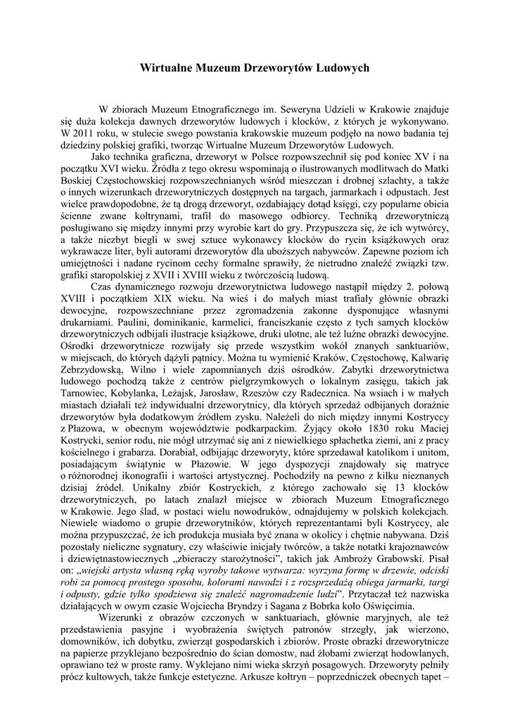 Wirtualne Muzeum Drzeworytów Ludowych W zbiorach Muzeum Etnograficznego im. Seweryna Udzieli w Krakowie znajduje się duża kolekcja dawnych drzeworytów ludowych i klocków, z których je wykonywano. W 2011 roku, w stulecie swego powstania krakowskie muzeum podjęło na nowo badania tej dziedziny polskiej grafiki, tworząc Wirtualne Muzeum Drzeworytów Ludowych. Jako technika graficzna, drzeworyt w Polsce rozpowszechnił się pod koniec XV i na początku XVI wieku. Źródła z tego okresu wspominają o ilustrowanych modlitwach do Matki Boskiej Częstochowskiej rozpowszechnianych wśród mieszczan i drobnej szlachty, a także o innych wizerunkach drzeworytniczych dostępnych na targach, jarmarkach i odpustach. Jest wielce prawdopodobne, że tą drogą drzeworyt, ozdabiający dotąd księgi, czy popularne obicia ścienne zwane kołtrynami, trafił do masowego odbiorcy. Techniką drzeworytniczą posługiwano się między innymi przy wyrobie kart do gry. Przypuszcza się, że ich wytwórcy, a także niezbyt biegli w swej sztuce wykonawcy klocków do rycin książkowych oraz wykrawacze liter, byli autorami drzeworytów dla uboższych nabywców. Zapewne poziom ich umiejętności i nadane rycinom cechy formalne sprawiły, że nietrudno znaleźć związki tzw. grafiki staropolskiej z XVII i XVIII wieku z twórczością ludową. Czas dynamicznego rozwoju drzeworytnictwa ludowego nastąpił między 2. połową XVIII i początkiem XIX wieku. Na wieś i do małych miast trafiały głównie obrazki dewocyjne, rozpowszechniane przez zgromadzenia zakonne dysponujące własnymi drukarniami. Paulini, dominikanie, karmelici, franciszkanie często z tych samych klocków drzeworytniczych odbijali ilustracje książkowe, druki ulotne, ale też luźne obrazki dewocyjne. Ośrodki drzeworytnicze rozwijały się przede wszystkim wokół znanych sanktuariów, w miejscach, do których dążyli pątnicy. Można tu wymienić Kraków, Częstochowę, Kalwarię Zebrzydowską, Wilno i wiele zapomnianych dziś ośrodków. Zabytki drzeworytnictwa ludowego pochodzą także z centrów pielgrzymkowych o lokalnym zasięgu, takich jak Tarnowiec, Kobylanka, Leżajsk, Jarosław, Rzeszów czy Radecznica. Na wsiach i w małych miastach działali też indywidualni drzeworytnicy, dla których sprzedaż odbijanych doraźnie drzeworytów była dodatkowym źródłem zysku. Należeli do nich między innymi Kostryccy z Płazowa, w obecnym województwie podkarpackim. Żyjący około 1830 roku Maciej Kostrycki, senior rodu, nie mógł utrzymać się ani z niewielkiego spłachetka ziemi, ani z pracy kościelnego i grabarza. Dorabiał, odbijając drzeworyty, które sprzedawał katolikom i unitom, posiadającym świątynie w Płazowie. W jego dyspozycji znajdowały się matryce o różnorodnej ikonografii i wartości artystycznej. Pochodziły na pewno z kilku nieznanych dzisiaj źródeł. Unikalny zbiór Kostryckich, z którego zachowało się 13 klocków drzeworytniczych, po latach znalazł miejsce w zbiorach Muzeum Etnograficznego w Krakowie. Jego ślad, w postaci wielu nowodruków, odnajdujemy w polskich kolekcjach. Niewiele wiadomo o grupie drzeworytników, których reprezentantami byli Kostryccy, ale można przypuszczać, że ich produkcja musiała być znana w okolicy i chętnie nabywana. Dziś pozostały nieliczne sygnatury, czy właściwie inicjały twórców, a także notatki krajoznawców i dziewiętnastowiecznych „zbieraczy starożytności”, takich jak Ambroży Grabowski. Pisał on: „wiejski artysta własną ręką wyroby takowe wytwarza: wyrzyna formę w drzewie, odciski robi za pomocą prostego sposobu, kolorami nawodzi i z rozsprzedażą obiega jarmarki, targi i odpusty, gdzie tylko spodziewa się znaleźć nagromadzenie ludzi”. Przytaczał też nazwiska działających w owym czasie Wojciecha Bryndzy i Sagana z Bobrka koło Oświęcimia. Wizerunki z obrazów czczonych w sanktuariach, głównie maryjnych, ale też przedstawienia pasyjne i wyobrażenia świętych patronów strzegły, jak wierzono, domowników, ich dobytku, zwierząt gospodarskich i zbiorów. Proste obrazki drzeworytnicze na papierze przyklejano bezpośrednio do ścian domostw, nad żłobami zwierząt hodowlanych, oprawiano też w proste ramy. Wyklejano nimi wieka skrzyń posagowych. Drzeworyty pełniły prócz kultowych, także funkcje estetyczne. Arkusze kołtryn – poprzedniczek obecnych tapet – dekorowały ornamenty roślinne i geometryczne z ozdobników książkowych czy z dawnych tkanin obiciowych. Stosunkowo rzadko polskie drzeworyty ludowe przedstawiały postacie świeckie: zbójników, huzarów albo niedźwiedników. Drzeworytnicze wizerunki świętych postaci funkcjonowały nie tylko w obrębie domu i gospodarstwa, ale także w obiektach sakralnych, na feretronach czy obrazach. Trzeba wspomnieć, że dawni twórcy często korzystali z wizerunków, kompozycji lub motywów ukazywanych na miedziorytach lub wcześniej wykonanych drzeworytach. Ich prace służyły także jako wzorniki dla ludowych malarzy i rzeźbiarzy. W połowie XIX wieku drzeworyty zaczęły zanikać, wypierane przez modne wówczas obrazy na szkle oraz masowo drukowane reprodukcje wykonywane innymi technikami graficznymi. Na przełomie XIX i XX w. nieliczne zachowane ludowe drzeworyty zaczęły wzbudzać coraz większe zainteresowanie w środowiskach kolekcjonerów i znawców sztuki ludowej, wśród nich Mariana Sokołowskiego. Zbiory drzeworytów ludowych posiadali między innymi Józef Ignacy Kraszewski i Józef Gwalbert Pawlikowski. W okresie międzywojennym pojawiły się nie tylko wzmianki, ale też opracowania naukowe, m.in. Jana Stanisława Bystronia i Ksawerego Piwockiego. Grafiką ludową zainteresowali się także artyści. Dla Władysława Skoczylasa – odnowiciela współczesnego drzeworytu polskiego – oraz dla jego uczniów ze stowarzyszenia „Ryt”, jak również dla artystów z kręgu formistów, czy bardziej współcześnie – Jerzego Panka, drzeworyt ludo