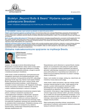 2013 28 czerwca 2016 r. Biuletyn „Beyond Bulls & Bears” Wydanie specjalne poświęcone Brexitowi PUNKT WIDZENIA ZARZĄDZAJĄCYCH PORTFELAMI Z FRANKLIN TEMPLETON INVESTMENTS W TYM NUMERZE: Artykuły w tym numerze są aktualne na dzień 28 czerwca 2016 r. Globalne makroekonomiczne spojrzenie na implikacje Brexitu. Choć odruchowa reakcja rynku na decyzję Wielkiej Brytanii o opuszczeniu Unii Europejskiej (UE) w końcu osłabnie, niektóre długofalowe konsekwencje tego wydarzenia mogą wciąż być przyczyną niepewności rynkowej. Dr Michael Hasenstab, CIO w zespole Templeton Global Macro, przedstawia swój punkt widzenia na implikacje referendalnej decyzji Brytyjczyków o wyjściu z UE oraz potencjalne znaczenie tego wydarzenia dla inwestorów. Brexit: jak szybko osłabnie efekt zaskoczenia? Podczas gdy rynki usiłują przetrawić wstrząsającą decyzję Brytyjczyków o opuszczeniu Unii Europejskiej (UE), Dylan Ball z zespołu Templeton Global Equity Group uważa, że inwestorzy powinni skoncentrować się na fundamentach akcji spółek w swoich portfelach, jednocześnie wypatrując możliwości, jakie mogą pojawiać się w warunkach wzmożonej zmienności. W tym artykule autor tłumaczy także, dlaczego zamierza uważnie monitorować negocjacje pomiędzy Wielką Brytanią a UE w sprawie Brexitu. Irracjonalne zachowanie rynków po decyzji o Brexicie. Niewiele rynków wyceniało perspektywę poparcia dla Brexitu w referendum w sprawie dalszego członkostwa Wielkiej Brytanii w Unii Europejskiej, zatem natychmiastowa reakcja na tę decyzję Brytyjczyków była dość jednorodna. Robert Mazzuoli, zarządzający portfelami inwestycyjnymi w zespole Franklin Local Asset Management ds. akcji europejskich, uważa, że w takich sytuacjach kurz dość szybko opada, a w najbardziej poszkodowanych sektorach mogą pojawić się okazje cenowe. Globalne makroekonomiczne spojrzenie na implikacje Brexitu Dr Michael Hasenstab Wiceprezes wykonawczy, zarządzający portfelami inwestycyjnymi CIO Templeton Global Macro Uważam, że dyskusję na temat referendalnej decyzji Brytyjczyków w sprawie Brexitu należy rozbić na dwie części: pierwsza z nich to trwały wpływ tego wydarzenia na Wielką Brytanię, Europę i gospodarkę światową, a druga to czynniki o bardziej tymczasowym charakterze. Jeżeli chodzi o trwałe konsekwencje, wynik głosowania jest niewątpliwie niekorzystny dla brytyjskiej gospodarki, której wymiana handlowa z Europą stanowi ponad 50% całkowitego globalnego handlu tego kraju. Bardzo trudno będzie Wielkiej Brytanii negocjować warunki umów o wolnym handlu, które zastąpiłyby porozumienia handlowe, z jakich Brytyjczycy korzystali w ramach członkostwa w UE. Negatywne skutki będą również odczuwalne w obszarze mobilności siły roboczej, a także w sektorze finansowym z centrum w Londynie. Prawdopodobnie poważniejsze konsekwencje związane będą jednak z możliwym narastaniem populistycznych i nacjonalistycznych nastrojów w całej Europie i sprzeciwu wobec UE i projektu europejskiej unii walutowej. W 2011 r. byliśmy przekonani, że strefa euro zachowa integralność pomimo potężnych zaburzeń ekonomicznej równowagi, braku unii politycznej, budżetowej i bankowej oraz niezdolności Włoch do wdrożenia reform strukturalnych. Widzieliśmy wówczas, że te problemy były możliwe do rozwiązania przy założeniu bezwarunkowej i przekonująco okazywanej politycznej woli dalszego współtworzenia unii. Niespodziewany wynik referendum w sprawie Brexitu niestety pokazał, że ta powszechna wola polityczna szybko słabnie. Sądzę, że w przyszłości możemy spodziewać się kolejnych głosowań i głośniejszego nawoływania do wychodzenia z UE przez partie polityczne o nacjonalistycznym zabarwieniu, co będzie przyczyną potężnej zmienności na rynkach i trudnego okresu w strefie euro. Żaden z tych skutków nie nastąpi, według nas, natychmiast, ale inwestorzy muszą wziąć je pod uwagę. Jeżeli chodzi o wpływ tymczasowy, tego typu wstrząs zwykle wywołuje masową awersję do ryzyka, czego sygnały już się pojawiły w postaci odbicia papierów skarbowych USA i japońskiego jena oraz wyprzedaży aktywów z rynków wschodzących po referendum. Te konsekwencje uważamy za tymczasowe; mniej więcej w ciągu kolejnego miesiąca trendy rynkowe mogą zacząć odwracać wektor, gdy ludzie zorientują się, że strefa euro stoi przed długofalowym wyzwaniem. Co do wpływu tej sytuacji na takie rynki wschodzące, jak Meksyk czy Indonezja, nasze prognozy inwestycyjne dla tych rynków nie ulegają znacznej zmianie. Stale monitorujemy dynamikę rynkową i poszukujemy potencjalnych możliwości wykorzystania niektórych przesunięć będących pokłosiem referendum. Globalne makroekonomiczne spojrzenie na implikacje Brexitu (ciąg dalszy) Na pewnym etapie wzmożonej zmienności po referendum dotarliśmy do punktu, który, według naszych szacunków, może być poziomem odbicia rynków wschodzących: waluty kilku krajów zaliczanych do rynków wschodzących początkowo straciły na wartości od 5% do 7%, ale później zaczęły odrabiać straty, gdy sytuacja zaczęła wracać do normy w czasie obrotów na rynku 24 czerwca. W ciągu weekendu oraz w perspektywie kolejnych kilku tygodni, gdy ludzie zaczną dostrzegać rzeczywiste znaczenie tego wydarzenia dla Europy i reszty świata, niektóre spośród tych obarczonych wyższym ryzykiem aktywów z rynków wschodzących, które były wyprzedawane, zaczną odrabiać straty. Uważam jednak, że wstrząs, jakiego dozna Europa, może okazać się bardziej długotrwały, a ludzie prawdopodobnie zaczną kwestionować zasadność inwestowania w strefie euro w dłuższej perspektywie. W związku z tym jesteśmy wciąż przekonani, że euro będzie się osłabiać. Brexit: jak szybko osłabnie efekt zaskoczenia? Dylan Ball, dyplomowany księgowy (ACA) Wiceprezes wykonawczy Templeton Global Equity Group Rynki mają problem z wyceną ryzy