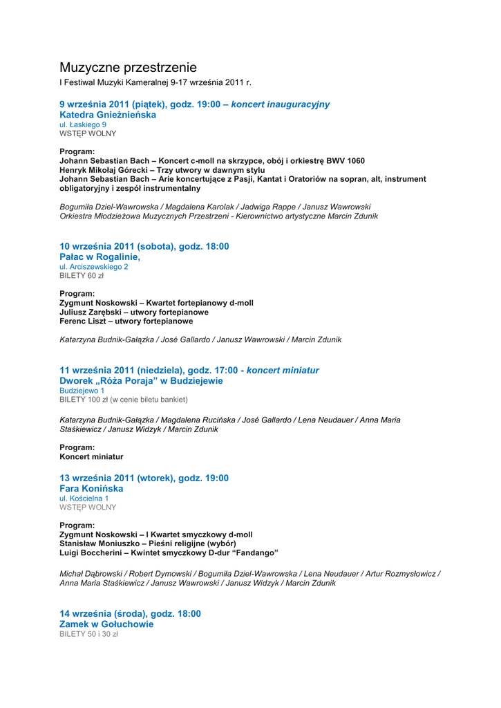 Muzyczne przestrzenie I Festiwal Muzyki Kameralnej 9-17 września 2011 r. 9 września 2011 (piątek), godz. 19:00 – koncert inauguracyjny Katedra Gnieźnieńska ul. Łaskiego 9 WSTĘP WOLNY Program: Johann Sebastian Bach – Koncert c-moll na skrzypce, obój i orkiestrę BWV 1060 Henryk Mikołaj Górecki – Trzy utwory w dawnym stylu Johann Sebastian Bach – Arie koncertujące z Pasji, Kantat i Oratoriów na sopran, alt, instrument obligatoryjny i zespół instrumentalny Bogumiła Dziel-Wawrowska / Magdalena Karolak / Jadwiga Rappe / Janusz Wawrowski Orkiestra Młodzieżowa Muzycznych Przestrzeni - Kierownictwo artystyczne Marcin Zdunik 10 września 2011 (sobota), godz. 18:00 Pałac w Rogalinie, ul. Arciszewskiego 2 BILETY 60 zł Program: Zygmunt Noskowski – Kwartet fortepianowy d-moll Juliusz Zarębski – utwory fortepianowe Ferenc Liszt – utwory fortepianowe Katarzyna Budnik-Gałązka / José Gallardo / Janusz Wawrowski / Marcin Zdunik 11 września 2011 (niedziela), godz. 17:00 - koncert miniatur Dworek „Róża Poraja” w Budziejewie Budziejewo 1 BILETY 100 zł (w cenie biletu bankiet) Katarzyna Budnik-Gałązka / Magdalena Rucińska / José Gallardo / Lena Neudauer / Anna Maria Staśkiewicz / Janusz Widzyk / Marcin Zdunik Program: Koncert miniatur 13 września 2011 (wtorek), godz. 19:00 Fara Konińska ul. Kościelna 1 WSTĘP WOLNY Program: Zygmunt Noskowski – I Kwartet smyczkowy d-moll Stanisław Moniuszko – Pieśni religijne (wybór) Luigi Boccherini – Kwintet smyczkowy D-dur “Fandango” Michał Dąbrowski / Robert Dymowski / Bogumiła Dziel-Wawrowska / Lena Neudauer / Artur Rozmysłowicz / Anna Maria Staśkiewicz / Janusz Wawrowski / Janusz Widzyk / Marcin Zdunik 14 września (środa), godz. 18:00 Zamek w Gołuchowie BILETY 50 i 30 zł Program: Zygmunt Noskowski – III Kwartet smyczkowy e-moll Igor Strawiński – Suita baletowa “Pulcinella” (opracowanie na kwartet smyczkowy - Marcin Zdunik) Luigi Boccherini – Kwintet smyczkowy D-dur “Fandango” Katarzyna Budnik-Gałązka / Lena Neudauer / Artur Rozmysłowicz / Anna Maria Staśkiewicz / Janusz Wawrowski / Marcin Zdunik / Janusz Widzyk 15 września 2011 (czwartek), godz. 18:00 Pałac w Dobrzycy ul. Pleszewska 5a BILETY 50 i 30 zł Program: Zygmunt Noskowski – II Kwartet smyczkowy E-dur Gustav Mahler – Kwartet fortepianowy a-moll Claude Debussy – Trio fortepianowe G-dur Katarzyna Budnik-Gałązka / Jose Gallardo / Rafał Kwiatkowski / Lena Neudauer / Artur Rozmysłowicz / Anna Maria Staśkiewicz / Janusz Wawrowski / Marcin Zdunik 16 września 2011 (piątek), godz. 19:00 Kościół Garnizonowy w Gnieźnie ul. Chrobrego 13 WSTĘP WOLNY Program: Johannes Brahms – Kwintet fortepianowy f-moll op. 34 Witold Maliszewski – Kwintet smyczkowy d-moll Katarzyna Budnik-Gałązka / Jose Gallardo / Rafał Kwiatkowski / Lena Neudauer / Janusz Wawrowski / Marcin Zdunik 17 września 2011 (sobota), godz. 20:30 – koncert finałowy Fara Poznańska ul. Klasztorna 11 WSTĘP WOLNY The King’s Singers Program: Henryk Mikołaj Górecki - Totus tuus Mikołaj Zieleński - Adoramus te, Christe Thomas Tallis - Lamentations Paweł Łukaszewski - Responsoria Tenebrae (ŚWIATOWA PRAPREMIERA !!!) Francis Poulenc - Quatre petites prières de Saint François d' Assise Szczegóły na www.muzyczneprzestrzenie.pl Bilety dostępne na www.ebilet.pl