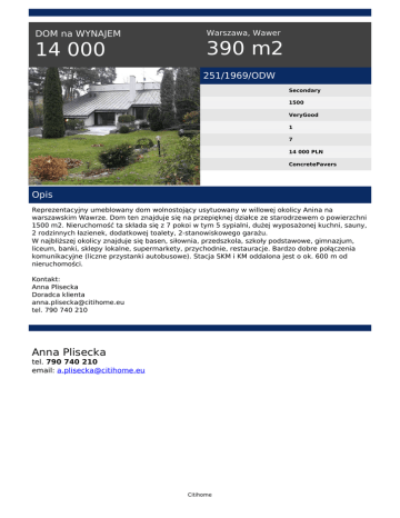 DOM na WYNAJEM 14 000 Warszawa, Wawer 390 m2 251/1969/ODW Secondary 1500 VeryGood 1 7 14 000 PLN ConcretePavers Opis Reprezentacyjny umeblowany dom wolnostojący usytuowany w willowej okolicy Anina na warszawskim Wawrze. Dom ten znajduje się na przepięknej działce ze starodrzewem o powierzchni 1500 m2. Nieruchomość ta składa się z 7 pokoi w tym 5 sypialni, dużej wyposażonej kuchni, sauny, 2 rodzinnych łazienek, dodatkowej toalety, 2-stanowiskowego garażu. W najbliższej okolicy znajduje się basen, siłownia, przedszkola, szkoły podstawowe, gimnazjum, liceum, banki, sklepy lokalne, supermarkety, przychodnie, restauracje. Bardzo dobre połączenia komunikacyjne (liczne przystanki autobusowe). Stacja SKM i KM oddalona jest o ok. 600 m od nieruchomości. Kontakt: Anna Plisecka Doradca klienta [email protected] tel. 790 740 210 Anna Plisecka tel. 790 740 210 email: [email protected] Citihome Powered by TCPDF (www.tcpdf.org)