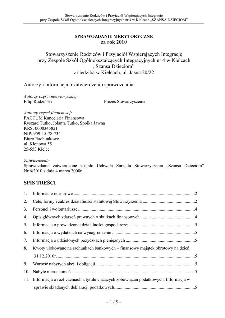 Stowarzyszenie Rodziców i Przyjaciół Wspierających Integrację przy Zespole Szkół Ogólnokształcących Integracyjnych nr 4 w Kielcach „SZANSA DZIECIOM” SPRAWOZDANIE MERYTORYCZNE za rok 2010 Stowarzyszenie Rodziców i Przyjaciół Wspierających Integrację przy Zespole Szkół Ogólnokształcących Integracyjnych nr 4 w Kielcach „Szansa Dzieciom” z siedzibą w Kielcach, ul. Jasna 20/22 Autorzy i informacja o zatwierdzeniu sprawozdania: Autorzy części merytorycznej: Filip Rudziński Prezes Stowarzyszenia Autorzy części finansowej: PACTUM Kancelaria Finansowa Ryszard Tutko, Jolanta Tutko, Spółka Jawna KRS: 0000345821 NIP: 959-15-78-734 Biuro Rachunkowe ul. Klonowa 55 25-553 Kielce Zatwierdzenie Sprawozdanie zatwierdzone zostało Uchwałą Zarządu Stowarzyszenia „Szansa Dzieciom” Nr 6/2010 z dnia 4 marca 2008r. SPIS TREŚCI 1. Informacje rejestrowe ...........................................................................................................2 2. Cele, formy i zakres działalności statutowej Stowarzyszenia ..............................................2 3. Personel i wolontariusze .......................................................................................................4 4. Opis głównych zdarzeń prawnych o skutkach finansowych ................................................4 5. Informacja o prowadzonej działalności gospodarczej ..........................................................5 6. Informacja o wydatkach na wynagrodzenie .........................................................................5 7. Informacja o udzielonych pożyczkach pieniężnych .............................................................5 8. Kwoty ulokowane na rachunkach bankowych – finansowy majątek obrotowy na dzień 31.12.2010r. .........................................................................................................................5 9. Wartość nabytych akcji i obligacji ........................................................................................5 10. Nabyte nieruchomości ..........................................................................................................5 11. Informacja o rozliczeniach z tytułu ciążących zobowiązań podatkowych. Informacja w sprawie składanych deklaracji podatkowych. ......................................................................5 –1/5– Stowarzyszenie Rodziców i Przyjaciół Wspierających Integrację przy Zespole Szkół Ogólnokształcących Integracyjnych nr 4 w Kielcach „SZANSA DZIECIOM” 12. Kontrola działalności Stowarzyszenia ..................................................................................5 SPRAWOZDANIE MERYTORYCZNE 1. Informacje rejestrowe Nazwa organizacji: Stowarzyszenie Rodziców i Przyjaciół Wspierających Integrację przy Zespole Szkół Ogólnokształcących Integracyjnych Nr 4 w Kielcach „Szansa Dzieciom” Adres siedziby: Telefon: 25-523 Kielce, ul. Jasna 20/22 41/366 39 95 Numer w KRS: Data rejestracji: Numer REGON: Rodzaj przeważającej działalności wg PKD: 0000153400 10.03.2003r. 292805912 9133Z – Działalność pozostałych organizacji, gdzie indziej nie sklasyfikowana Zarząd Stowarzyszenia: Imię i nazwisko Funkcja Miejsce zamieszkania Filip Rudziński Elżbieta Kuta Jadwiga Paluch Monika Kozubek Aleksandra Bąk Edyta Kosior Prezes Zarządu Wiceprezes Zarządu Sekretarz Skarbnik Członek Zarządu Członek Zarządu Kielce Kielce Kielce Kielce Kielce Kielce 2. Cele, formy i zakres działalności statutowej Stowarzyszenia Stowarzyszenie „Szansa Dzieciom” powstało z inicjatywy rodziców dzieci niepełnosprawnych, pragnących pomóc swoim dzieciom w ich rozwoju oraz aktywizacji społecznej. Stowarzyszenie funkcjonuje przy Zespole Szkół Ogólnokształcących Integracyjnych nr 4 w Kielcach, do którego uczęszczają dzieci zdrowe i niepełnosprawne. Misją naszą jest udział w budowaniu społeczeństwa obywatelskiego otwartego na integrację z osobami niepełnosprawnymi i cierpiącymi. Celem Stowarzyszenia jest zrzeszanie i wspieranie ludzi dobrej woli, działających na rzecz zdrowia i szczęścia dzieci z różnymi dysfunkcjami rozwojowymi, poprzez działalność w zakresie dobroczynności, ochrony zdrowia, opieki społecznej, edukacji, rehabilitacji zawodowej i społecznej dzieci niepełnosprawnych oraz propagowania idei tolerancji wśród społeczeństwa. Cel ten Stowarzyszenie urzeczywistnia poprzez: 1. organizowanie poradnictwa dla dzieci i ich rodziców, ze szczególnym uwzględnieniem dzieci niepełnosprawnych, –2/5– Stowarzyszenie Rodziców i Przyjaciół Wspierających Integrację przy Zespole Szkół Ogólnokształcących Integracyjnych nr 4 w Kielcach „SZANSA DZIECIOM” 2. 3. 4. 5. 6. 7. 8. 9. 10. 11. 12. 13. 14. 15. gromadzenie, opracowywanie i udostępnianie wszelkich wydawnictw dotyczących problematyki dzieci niepełnosprawnych, popularyzowanie w społeczeństwie wiedzy o potrzebach i możliwościach dzieci z różnymi dysfunkcjami rozwojowymi, podejmowanie działalności rehabilitacyjnej na rzecz tych dzieci, organizowanie krajowych i międzynarodowych konferencji i sympozjów z udziałem profesjonalistów różnych dziedzin medycyny, edukacji i terapii, organizowanie turnusów rehabilitacyjnych, dofinansowywanie inwestycji realizowanych przez Zespół Szkół Ogólnokształcących Integracyjnych nr 4 w Kielcach, związanych bezpośrednio z działalnością na rzecz dzieci niepełnosprawnych, współpracę ze wszystkimi organizacjami i towarzystwami o podobnych zainteresowaniach, działających na rzecz dzieci, a szczególnie dzieci specjalnej troski, organizowanie i prowadzenie ośrodków leczniczo-rehabilitacyjnych dla dzieci niepełnosprawnych, prowadzenie banku informacji o dzieciach specjalnej troski, organizowanie akcji charytatywnych, z których dochód przeznaczony jest na realizację celów statutowych Stowarzyszenia, organizowanie i prowadzenie niepublicznych placówek reali