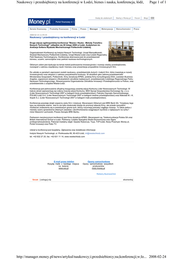 Naukowcy i przedsiębiorcy na konferencji w Łodzi, biznes i nauka, konferencja, łódź, Dodaj do ulubionych Serwis finansowy Produkty finansowe Firma Prawo Manager Motoryzacja Startuj z Money.pl Nieruchomości Forum Page 1 of 1 Blogi Praca 2008-02-15 11:44:35 Naukowcy i przedsiębiorcy na konferencji w Łodzi Druga edycja ogólnopolskiej konferencji "Biznes i Nauka - Metody Transferu Nowych Technologii" odbędzie się 26 lutego 2008 w Łodzi, Audytorium im. Andrzeja Sołtana Wydziału Mechanicznego Politechniki Łódzkiej. Organizatorami Konferencji są Instytut Nowych Technologii, Urząd Marszałkowski, Wydział Mechaniczny Politechniki Łódzkiej, Urząd Miasta Łodzi oraz Łódzki Regionalny Park Naukowo-Technologiczny. Konferencja skierowana jest do przedstawicieli biznesu, uczelni, samorządów oraz parków naukowo-technologicznych. Głównym celem jest dyskusja na temat metod podnoszenia innowacyjności i rozwoju wiedzy przedsiębiorstw, rozwiązań z zakresu współpracy nauki i biznesu oraz prezentacja przypadków innowacyjnych firm. Do udziału w panelach zaproszeni zostali naukowcy, przedstawiciele dużych i małych firm, które inwestują w rozwój innowacyjności oraz eksperci z zakresu pozyskiwania funduszy. W obradach głos zabiorą przedstawiciele: Ministerstwa Gospodarki, Politechniki, firmy doradczej KPMG, polskiej firmy konsultingowej DGA, Lewiatan Business Angeles, zagraniczni eksperci z Brukselskich ośrodków badawczych, przedstawiciele Łódzkiego Regionalnego Parku Naukowo-Technologicznego, Stowarzyszenia Organizatorów Ośrodków Innowacji i Przedsiębiorczości w Polsce, oraz przedstawiciele z urzędów Miasta Łodzi. Konferencja jest jednocześnie oficjalną inauguracją czwartej edycji Konkursu Lider Nowoczesnych Technologii. W trakcie obrad zaprezentują się Liderzy trzeciej edycji Konkursu: BSH Sprzęt Gospodarstwa Domowego Sp. z o.o. (Lider Nowoczesnych Technologii 2007 w kategorii duże przedsiębiorstwo), Fabryka Osprzętu Samochodowego POLMO Łódź S.A. (Lider Nowoczesnych Technologii 2007 w kategorii średnie przedsiębiorstwo) oraz Makolab M. i K. Sopek S.J. (Lider Nowoczesnych Technologii 2007 w kategorii małe przedsiębiorstwo). Konferencja powstaje dzięki wsparciu wielu firm i instytucji. Mecenasem Głównym jest BRE Bank SA. "Inicjatywy tego typu są niezwykle ważne. Jest to nie tylko doskonała okazja do promocji własnej firmy, ale przede wszystkim możliwość znalezienia się w prestiżowym gronie tych, którzy rozumieją potrzeby ciągłego rozwoju. To także jedna z niewielu szans sprawdzenia własnych zasobów i skonfrontowania osiągniętych wyników z najlepszymi na rynku"mówi Sławomir Lachowski, Prezes Zarządu BRE Banku. Partnerem merytorycznym konferencji jest firma doradcza KPMG. Mecenasami są: Telekomunikacja Polska SA oraz British International School w Łodzi. Partnerzy: Łódzka Specjalna Strefa Ekonomiczna oraz Signa profesjonalneszkolenia. Patronat medialny objęli: Gazeta Wyborcza, Toya, TVP-Łódź, Nowy Przemysł, Money pl, Portal Innowacji oraz Patio TV. Udział w konferencji jest bezpłatny. Zgłoszenia oraz dodatkowe informacje: Instytut Nowych Technologii, ul. Piotrkowska 89, 90-423 Łódź, [email protected] tel. +42 632 27 20, fax. +42 631 11 14, www.newtechlodz.com E-mail przez telefon Wysyłaj maile z każdego miejsca na świecie www.era.pl Opony samochodowe Opony samochodowe wszystkich producentów moto.money.pl Reklamy BusinessClick forum | zaloguj się skomentuj http://manager.money.pl/news/artykul/naukowcy;i;przedsiebiorcy;na;konferencji;w;lo... 2008-02-24