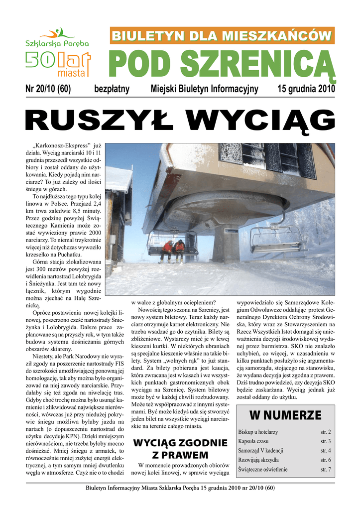BIULETYN DLA MIESZKAŃCÓW Nr 20/10 (60) POD SZRENICą bezpłatny Miejski Biuletyn Informacyjny 15 grudnia 2010 RUSZYł WYCIąG „Karkonosz-Ekspress” już działa. Wyciąg narciarski 10 i 11 grudnia przeszedł wszystkie odbiory i został oddany do użytkowania. Kiedy pojadą nim narciarze? To już zależy od ilości śniegu w górach. To najdłuższa tego typu kolej linowa w Polsce. Przejazd 2,4 km trwa zaledwie 8,5 minuty. Przez godzinę powyżej Świątecznego Kamienia może zostać wywieziony prawie 2000 narciarzy. To niemal trzykrotnie więcej niż dotychczas wywoziło krzesełko na Puchatku. Górna stacja zlokalizowana jest 300 metrów powyżej rozwidlenia nartostrad Lolobrygida i Śnieżynka. Jest tam też nowy łącznik, którym wygodnie można zjechać na Halę Szrenicką. Oprócz postawienia nowej kolejki linowej, poszerzono cześć nartostrady Śnieżynka i Lolobrygida. Dalsze prace zaplanowane są na przyszły rok, w tym także budowa systemu dośnieżania górnych obszarów skiareny. Niestety, ale Park Narodowy nie wyraził zgody na poszerzenie nartostrady FIS do szerokości umożliwiającej ponowną jej homologację, tak aby można było organizować na niej zawody narciarskie. Przydałaby się też zgoda na niwelację tras. Gdyby choć trochę można było usunąć kamienie i zlikwidować największe nierówności, wówczas już przy niedużej pokrywie śniegu możliwa byłaby jazda na nartach (o dopuszczeniu nartostrad do użytku decyduje KPN). Dzięki mniejszym nierównościom, nie trzeba byłoby mocno dośnieżać. Mniej śniegu z armatek, to równocześnie mniej zużytej energii elektrycznej, a tym samym mniej dwutlenku węgla w atmosferze. Czyż nie o to chodzi w walce z globalnym ociepleniem? Nowością tego sezonu na Szrenicy, jest nowy system biletowy. Teraz każdy narciarz otrzymuje karnet elektroniczny. Nie trzeba wsadzać go do czytnika. Bilety są zbliżeniowe. Wystarczy mieć je w lewej kieszeni kurtki. W niektórych ubraniach są specjalne kieszenie właśnie na takie bilety. System „wolnych rąk” to już standard. Za bilety pobierana jest kaucja, która zwracana jest w kasach i we wszystkich punktach gastronomicznych obok wyciągu na Szrenicę. System biletowy może być w każdej chwili rozbudowany. Może też współpracować z innymi systemami. Być może kiedyś uda się stworzyć jeden bilet na wszystkie wyciągi narciarskie na terenie całego miasta. wyciąg zgodnie z prawem W momencie prowadzonych obiorów nowej kolei linowej, w sprawie wyciągu wypowiedziało się Samorządowe Kolegium Odwoławcze oddalając protest Generalnego Dyrektora Ochrony Środowiska, który wraz ze Stowarzyszeniem na Rzecz Wszystkich Istot domagał się unieważnienia decyzji środowiskowej wydanej przez burmistrza. SKO nie znalazło uchybień, co więcej, w uzasadnieniu w kilku punktach posłużyło się argumentacją samorządu, stojącego na stanowisku, że wydana decyzja jest zgodna z prawem. Dziś trudno powiedzieć, czy decyzja SKO będzie zaskarżana. Wyciąg jednak już został oddany do użytku. w numerze Biskup u hotelarzy str. 2 Kapsuła czasu str. 3 Samorząd V kadencji str. 4 Rozwijają skrzydła str. 6 Świąteczne oświetlenie str. 7 Biuletyn Informacyjny Miasta Szklarska Poręba 15 grudnia 2010 nr 20/10 (60) BISKUP U HOTELARZY 99 procentowego obłożenia, nowych atrakcji turystycznych i sukcesów zawodowych, a w życiu prywatnym bożego błogosławieństwa i zdrowia - takie życzenia składano sobie podczas LOT-owskiej Wigilii w Szklarskiej Porębie. Gościem honorowym był jego ekscelencja ks. biskup Stefan Cichy. „Wszyscy uważają, że zdrowie jest najważniejsze, a ja uważam, że najważniejsze jest boże błogosławieństwo i tego wam właśnie życzę” - mówił do zebranych biskup Stefan Cichy. - „I oczywiście życzę wam wielu zadowolonych turystów. Szklarska Poręba została obdarzona i Karkonoszami i Górami Izerskimi, w których jest tyle wspaniałych tras narciarskich i szlaków do wędrówek. Przyznaję, że Szklarska Poręba jest najczęściej odwiedzanym przeze mnie miastem, choć w tym roku nie miałem wiele okazji. Ostatni raz byłem tu w październiku. I na pewno przy- OBJAZDOWE KINO Pierwsze spotkanie z Objazdowym Kinem Orange już za nami. Projekt stworzony został z myślą o miejscowościach w których nie ma kin stacjonarnych. To właśnie do tych miejscowości dociera Objazdowe Kino dając możliwość mieszkańcom obejrzenia najnowszych premier i hitów filmowych . Klub Jazgot zamienił się w salę kinową z prawdziwą oprawą festiwalową. Każdy gość mógł stanąć na czerwonym dywanie, jak podczas premiery filmowej. Na profesjonalnym sprzęcie projekcyjnym obejrzeliśmy trzy seanse premierowe: „Mysi Agenci”, „Śluby Panieńskie” i Śniadanie do Łóżka”. O poranku do kina licznie przybyły przedszkolaki i dzieci pierwNasze miasto zaprezentowało swoją ofertę na targach turystycznych „Touristik & Caravaning Messe Leipzig”. To jedna z największych w tym regionie imprez promocyjnych, zaadresowana dla mieszkańców Lipska i okolic. W tej znaczącej europejskiej imprezie branżowej wzięło udział 1023 wystawców z około 50 krajów oraz 63000 zwiedzających. Szklarska Poręba prezentowała swoją ofertę razem z pozostałymi gminami Karkonoszy w ramach dużego polskiego stoiska obok Dolnośląskiej Orga2 szych klas szkół podstawowych, następnie młodzież licealna, a wieczór należał do dorosłych kinomanów. Frekwencja przeszła najśmielsze oczekiwania już tydzień przed przyjazdem Objazdowego Kina Orange wszystkie bilety zostały wyprzedane na każdy z pięciu seansów. Niestety doba ma tylko 24 godziny. MOKSiAL pociesza spóźnialskich, bowiem niewykluczone że już w styczniu Objazdowe Kino ponownie zawita jadę w marcu na Bieg Piastów. Już mam ten termin wpisany do kalendarza.” Ksiądz biskup Stefan Cichy w prezencie od burmistrza Grzegorza Sokolińskiego otrzymał kalendarz na rok 2