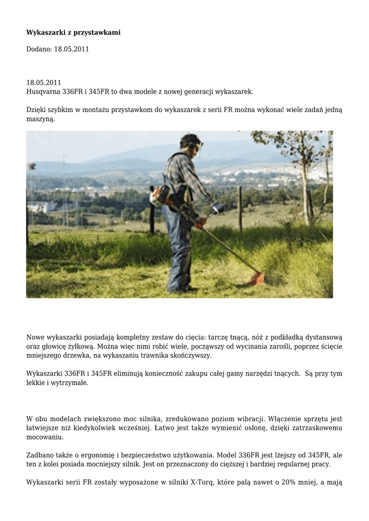 Wykaszarki z przystawkami Dodano: 18.05.2011 18.05.2011 Husqvarna 336FR i 345FR to dwa modele z nowej generacji wykaszarek. Dzięki szybkim w montażu przystawkom do wykaszarek z serii FR można wykonać wiele zadań jedną maszyną. Nowe wykaszarki posiadają kompletny zestaw do cięcia: tarczę tnącą, nóż z podkładką dystansową oraz głowicę żyłkową. Można więc nimi robić wiele, począwszy od wycinania zarośli, poprzez ścięcie mniejszego drzewka, na wykaszaniu trawnika skończywszy. Wykaszarki 336FR i 345FR eliminują konieczność zakupu całej gamy narzędzi tnących. Są przy tym lekkie i wytrzymałe. W obu modelach zwiększono moc silnika, zredukowano poziom wibracji. Włączenie sprzętu jest łatwiejsze niż kiedykolwiek wcześniej. Łatwo jest także wymienić osłonę, dzięki zatrzaskowemu mocowaniu. Zadbano także o ergonomię i bezpieczeństwo użytkowania. Model 336FR jest lżejszy od 345FR, ale ten z kolei posiada mocniejszy silnik. Jest on przeznaczony do cięższej i bardziej regularnej pracy. Wykaszarki serii FR zostały wyposażone w silniki X-Torq, które palą nawet o 20% mniej, a mają większą moc. Jednocześnie ograniczają emisję szkodliwych substancji do 75%, w porównaniu do podobnych maszyn nieposiadających technologii X-Torq. Wykaszarki 336FR i 345FR bardzo łatwo wyposażyć w różne urządzenia tnące. Magnetyczna zawleczka sprawia, że wymiana przystawki tnącej jest bardzo prosta. Co więcej wykaszarkę można wygodnie odłączyć od szelek operatora przez naciśnięcie mechanizmu zwalniającego. Dzięki temu do wymiany narzędzi tnących nie trzeba zdejmować szelek. Mechanizm jest łatwo dostępny, nawet gdy operator nosi kurtkę lub płaszcz przeciwdeszczowy na wierzchu uprzęży. Do modelu 336FR dedykowane są szelki Balance 55, zaś do 345FR odpowiednia jest uprzęż Balance X. Model ten posiada szeroką, wentylowaną powierzchnię tylną, a także szerokie pasy na ramiona. Redukuje to napięcie, jednocześnie równomiernie rozmieszczając obciążenie pomiędzy ramionami, klatką piersiową i biodrami. firmylesne.pl Źródło: Husqvarna Komentarze (0) Nie dodano jeszcze żadnego komentarza.