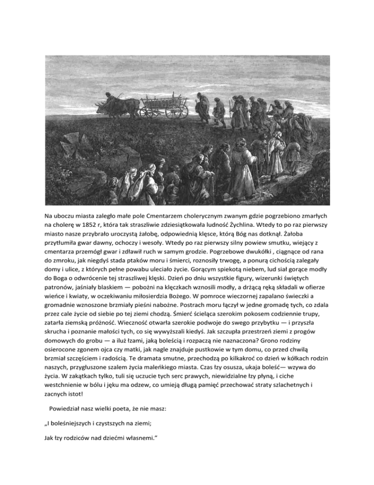 Na uboczu miasta zaległo małe pole Cmentarzem cholerycznym zwanym gdzie pogrzebiono zmarłych na cholerę w 1852 r, która tak straszliwie zdziesiątkowała ludność Żychlina. Wtedy to po raz pierwszy miasto nasze przybrało uroczystą żałobę, odpowiednią klęsce, którą Bóg nas dotknął. Żałoba przytłumiła gwar dawny, ochoczy i wesoły. Wtedy po raz pierwszy silny powiew smutku, wiejący z cmentarza przemógł gwar i zdławił ruch w samym grodzie. Pogrzebowe dwukółki , ciągnące od rana do zmroku, jak niegdyś stada ptaków moru i śmierci, roznosiły trwogę, a ponurą cichością zalegały domy i ulice, z których pełne powabu uleciało życie. Gorącym spiekotą niebem, lud siał gorące modły do Boga o odwrócenie tej straszliwej klęski. Dzień po dniu wszystkie figury, wizerunki świętych patronów, jaśniały blaskiem — pobożni na klęczkach wznosili modły, a drżącą ręką składali w ofierze wieńce i kwiaty, w oczekiwaniu miłosierdzia Bożego. W pomroce wieczornej zapalano świeczki a gromadnie wznoszone brzmiały pieśni nabożne. Postrach moru łączył w jedne gromadę tych, co zdala przez cale życie od siebie po tej ziemi chodzą. Śmierć ścieląca szerokim pokosem codziennie trupy, zatarła ziemską próżność. Wieczność otwarła szerokie podwoje do swego przybytku — i przyszła skrucha i poznanie małości tych, co się wywyższali kiedyś. Jak szczupła przestrzeń ziemi z progów domowych do grobu — a iluż łzami, jaką boleścią i rozpaczą nie naznaczona? Grono rodziny osierocone zgonem ojca czy matki, jak nagle znajduje pustkowie w tym domu, co przed chwilą brzmiał szczęściem i radością. Te dramata smutne, przechodzą po kilkakroć co dzień w kółkach rodzin naszych, przygłuszone szalem życia maleńkiego miasta. Czas łzy osusza, ukaja boleść— wzywa do życia. W zakątkach tylko, tuli się uczucie tych serc prawych, niewidzialne łzy płyną, i ciche westchnienie w bólu i jęku ma odzew, co umieją długą pamięć przechować straty szlachetnych i zacnych istot! Powiedział nasz wielki poeta, że nie masz: „I boleśniejszych i czystszych na ziemi; Jak łzy rodziców nad dziećmi własnemi.”