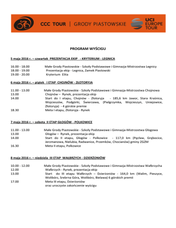 PROGRAM WYŚCIGU 5 maja 2016 r. – czwartek PREZENTACJA EKIP - KRYTERIUM - LEGNICA 16.00 - 18.00 18.00 - 19.00 19.00 - 20.00 Małe Grody Piastowskie - Szkoły Podstawowe i Gimnazja-Mistrzostwa Legnicy Prezentacja ekip - Legnica, Zamek Piastowski Kryterium Elita 6 maja 2016 r. – piątek I ETAP CHOJNÓW - ZŁOTORYJA 11.00 - 13.00 13.00 14.00 18.30 Małe Grody Piastowskie - Szkoły Podstawowe i Gimnazja-Mistrzostwa Chojnowa Chojnów – Rynek, prezentacja ekip Start do I etapu, Chojnów - Złotoryja - 185,6 km Jawor, Stara Kraśnica, Wojcieszów, Podgórki, Świerzawa, (Pielgrzymka, Wojcieszyn, Uniejowice, Złotoryja) - 4 górskie premie Meta I etapu, Złotoryja - Rynek 7 maja 2016 r. – sobota II ETAP GŁOGÓW - POLKOWICE 11.00 - 13.00 13.00 14.00 16.30 Małe Grody Piastowskie - Szkoły Podstawowe i Gimnazja-Mistrzostwa Głogowa Głogów – Rynek, prezentacja ekip Start do II etapu, Głogów - Polkowice - 117,0 km (Pęcław, Grębocice, Jerzmanowa, Nielubia, Radwanice, Przemków, Chocianów) gminy ZGZM Meta II etapu, Polkowice 8 maja 2016 r. – niedziela III ETAP WAŁBRZYCH - DZIERŻONIÓW 10.00 - 12.00 12.00 13.00 17.00 Małe Grody Piastowskie - Szkoły Podstawowe i Gimnazja-Mistrzostwa Wałbrzycha Wałbrzych - Rynek, prezentacja ekip Start do III etapu Wałbrzych – Dzierżoniów - 164,0 km (Walim, Pieszyce, Wolibórz, Srebrna Góra, Wolibórz, Bielawa) 6 górskich premii Meta III etapu, Dzierżoniów oraz uroczyste zakończenie wyścigu Trasa wyścigu: CCC TOUR - GRODY PIASTOWSKIE 2016 Prezentacja ekip oraz kryterium: czwartek 5 maja 2016, Legnica 32 km Etap 1: piątek, 6 maja 2016, Chojnów - Złotoryja 185,6 km 3 lotne premie 5 górskich premii Przewyższenie: 1340 m Etap 2: sobota, 7 maja 2016, Głogów - Polkowice 117,0 km 3 lotne premie 1 górska premia Przewyższenie: 390 m Etap 3: niedziela, 8 maja 2016, Wałbrzych - Dzierżoniów 162,0 km 2 lotne premie 6 górskich premii Przewyższenie: 1950 m Wyścigowi będą towarzyszyły imprezy dla dzieci ze szkół podstawowych i gimnazjalnych w Legnicy, Chojnowie , Głogowie i Wałbrzychu w ramach Małych Grodów Piastowskich.
