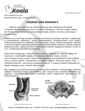 Swww.koala.krakow.pl Anna Adamczyk-Lech fizjoterapeutka spec. uroginekologia MIĘŚNIE DNA MIEDNICY Mięśnie dna miednicy są najważniejszą grupą mięśniową dla kobiet w okresie okołoporodowym oraz w okresie menopauzy. Od tych mięśni zależy, jak funkcjonują położone w ich obrębie narządy układu moczowo-płciowego i wydalniczego. Mięśnie te utrzymują narządy wewnętrzne (macicę, pochwę, pęcherz i odbytnicę) w prawidłowym położeniu. Dzięki prawidłowemu funkcjonowaniu tych mięśni możliwe jest zarówno wydalanie, jak i trzymanie moczu, stolca oraz gazów. Zdrowe i sprawne mięśnie ułatwiają fizjologiczne ułożenie główki dziecka w kanale rodnym podczas porodu. Lepiej ukrwione i unerwione szybciej reagują na bodziec, przez co m.in. zwiększają satysfakcję seksualną. Zaburzenia związane z mięśniami dna miednicy dotyczą 2x częściej kobiet niż mężczyzn. Kobiety, ze względu na budowę ciała oraz ciążę i porody, są w wyższej grupie ryzyka. Zaburzenia objawiają się incydentami nietrzymania moczu, stolca, gazów i obniżeniem narządów rodnych. Pierwsze objawy choć charakterystyczne zazwyczaj są bagatelizowane. Z czasem jednak wpływają na jakość naszego życia, również seksualnego. Bez względu na przeciwwskazania do aktywności kobieta w okresie ciąży powinna zadbać o kondycję mięśni dna miednicy, aby nauczyć się w sposób prawidłowy je napinać i rozluźniać oraz unikać czynności, które negatywnie wpływają na ich funkcjonowanie. Źródło: http://physioworks.com.au Źródło: http://mojebrisko.cz Centrum Rehabilitacji Koala, tel.: (+48) 691 838 168, e-mail: [email protected] Swww.koala.krakow.pl Czy jestem w grupie ryzyka? 1. Oddaję mocz bardzo często (więcej niż 7x na dobę). 2. Kiedy czuję parcie na pęcherz muszę od razu skorzystać z toalety. 3. W toalecie nie jestem w stanie powstrzymać strumienia moczu (to nie jest ćwiczenie, test można wykonywać raz na kilka tygodni). 4. Korzystam z toalety w nocy. 5. Podczas kichania, kaszlu, śmiania się, wymiotów zdarza mi się popuszczać mocz. Jeśli choć na jedno pytanie udzieliłaś odpowiedzi pozytywnej, oznacza to, że powinnaś zadbać o swoje mięśnie dna miednicy. Jak w sposób prawidłowy uruchomić dno miednicy? Jakie objawy powinny mnie niepokoić i są wskazaniem do diagnozy i terapii? 1. Uczucie ciążenia, ciągnięcia w dole brzucha. 2. Wybudzanie się w nocy w celu oddania moczu. 3. Uczucie gazów w pochwie. 4. Uczucie ciała obcego w pochwie. 5. Popuszczanie moczu w trakcie wysiłku, podczas śmiechu, podskoków, kaszlu, kichania, wymiotów. 6. Nietrzymanie moczu, gazów, stolca. 7. Ból w trakcie współżycia. 8. Częste zaparcia, hemoroidy. Centrum Rehabilitacji Koala, tel.: (+48) 691 838 168, e-mail: [email protected] Swww.koala.krakow.pl Jak zadbać o dno miednicy? 1. Korzystaj z toalety, kiedy odczuwasz taką potrzebę. Nie przetrzymuj moczu, stolca bez potrzeby, nie korzystaj z toalety na zapas. 2. Nie przyj na mocz i stolec. 3. Pij około 1,5-2 l wody dziennie, unikaj napojów gazowanych, kawy, alkoholu. 4. Dbaj o regularne, lekkostrawne posiłki. 5. Nie dźwigaj. 6. Ćwicz mięśnie dna miednicy raz dziennie. Podczas porodu: 1. Zadbaj o dogodną wertykalną pozycję do porodu. 2. Zadbaj o ochronę krocza w trakcie porodu (przygotuj krocze do porodu). 3. Unikaj chwytu Kristellera (pomoc ręczna w trakcie parcia). W okresie połogu: 1. Zacznij wykonywać ćwiczenia dna miednicy jak najszybciej po porodzie. 1/3 kobiet nie jest w stanie napiąć mięśni dna miednicy w sposób zależny od woli, także co trzecia kobieta po porodzie cierpi z powodu inkontynencji. 2. Przez pierwsze dwa tygodnie unikaj długotrwałego stania, siedzenia, chodzenia (zaufaj sobie, obserwuj ciało). 3. Nie noś, nie dźwigaj ciężkich rzeczy do 6 tygodnia (noś tyle, ile waży dziecko). 4. Nie noś pasów poporodowych. Centrum Rehabilitacji Koala, tel.: (+48) 691 838 168, e-mail: [email protected] Swww.koala.krakow.pl 5. Dbaj o odpowiednie nawodnienie i regularne posiłki. 6. Nie siadaj na kroczu po porodzie (do czasu zagojenia). 7. Nie siadaj na poduszkach z „dziurą”, czy kołach ratunkowych. 8. Jak najszybciej po porodzie poddaj się kwalifikowanej rehabilitacji poporodowej. Po 5-6 tygodniach można umówić się na wizytę kontrolną. Nie wykonuj forsownych ćwiczeń (mięśni brzucha, podskoków) przez pierwsze 6 tygodni po porodzie. Do roku po porodzie unikaj bardzo forsownych ćwiczeń. Przez pierwsze pół roku nie jest wskazany jogging, tenis, squash itp. 9. Unikaj zaparć, hemoroidów. 10. Ćwicz dno miednicy za każdym razem, kiedy karmisz dziecko. Jak ćwiczyć? 1. Ułóż się w wygodnej pozycji tak, aby rozluźnić brzuch, uda i pośladki. 2. Oddychaj swobodnie. Na wydechu wciągnij dno miednicy, na wdechu rozluźnij. 3. Powtarzaj każde ćwiczenie do 10 razy. 4. Jeśli będziesz czuła, że mięśnie się męczą, przerwij ćwiczenie i wróć do niego po kilku godzinach. 5. Jeśli poczujesz napięcia w brzuchu, udach lub pośladkach, zmniejsz intensywność ćwiczeń. 6. Ważniejsza jest jakość ćwiczeń niż ilość powtórzeń. Centrum Rehabilitacji Koala, tel.: (+48) 691 838 168, e-mail: [email protected] Swww.koala.krakow.pl Ćwiczenie 1 Podciągnij mięśnie wokół cewki moczowej, pochwy i odbytu, utrzymaj 5-10 s i rozluźnij. Ćwiczenie 2 Wciągnij-rozluźnij jak najszybciej od pełnego napięcia do pełnego rozluźnienia. Ćwiczenie 3 Wciągnij-odkaszlnij-rozluźnij. Bez konsultacji ze specjalistą nie używaj stożków, ciężarków dopochwowych, elektrostymulacji czy kulek gejszy. Literatura: 1. Chiarelli P., 2007, Babski problem? Nietrzymanie moczu profilaktyka i terapia, Dobry Początek, Poznań. 2. Köwing A., 2013, Fizjoterapia w zaburzeniach funkcjonalnych miednicy i nietrzymaniu moczu, Kurs bazowy I, II skrypt kursu, RehaPlus, Kraków. 3. Rakowski A., 2011, Terapia manualna holistyczna, Centrum Terapii Manualnej, Poznań.