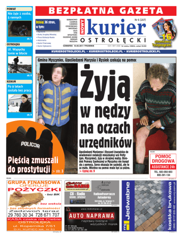 Nie żyje 1 osoba, 5 rannych B E Z P Ł AT N A G A Z E TA Dzisiaj 36 stron, w tym: str. 4 OSTROŁĘKA Ul. Wypychy tonie w błocie • Agrolonik • Buduj Urządzaj Mieszkaj • Praca Edukacja Nauka • Automania • Kurier Finansowy • Kurier Ogłoszenia BARANOWO CZARNIA CZERWIN GOWOROWO KADZIDŁO LELIS ŁYSE MYSZYNIEC OLSZEWO-BORKI RZEKUŃ TROSZYN NOWY POWIAT kurier Nr55 6 (207) Nr (155) 16 O S T R O Ł Ę C K I CZWARTEK 10.02.2011 TYGODNIK ISSN 1897-3582 Nr indeksu 228826, nakład 20.000 KURIEROSTROLECKI.PL • KURIEROSTROLECKI.PL • KURIEROSTROLECKI.PL Gmina Myszyniec. Upośledzeni Marysia i Rysiek czekają na pomoc Żyją str. 6 RZEKUŃ Po 9 latach została bez pracy w nędzy str. 8 na oczach urzędników Pięścią zmuszali do prostytucji > str. 3 Upośledzeni Marianna i Ryszard (nazwiska do wiadomości redakcji) mieszkańcy wsi Pełty (gm. Myszyniec), żyją w skrajnej nędzy. Ośrodek Pomocy Społecznej w Myszyńcu nie kwapi się z pomocą. Serce okazują im sąsiedzi, ale to za mało. Wkrótce na pomoc może być za późno. > Czytaj str. 9 REKLAMA REKLAMA POMOC DROGOWA ASSISTANCE 24h TEL. 603-050-603 665-301-134 8511osm5-a -C Aelektryka UTO elektronika CB - Radio SERWIS - SPRZEDAŻ Radioodtwarzacze Autoalarmy Ostrołęka, ul. Targowa 11 tel. 29 766-43-43 15611osm5-a -F 12411osm5-a -W 13211osm5-b -K 1011osm5-A -S 2 NA DZIEŃ Kurier Ostrołęcki CZWARTEK 10.02.2011 DOBRY Jak łatwo i szybko znaleźć pracę? Wystarczy zgłosić się do Stanisława Godziny, wójta gminy Rzekuń. Nowy włodarz znalazł dość oryginalny sposób pozyskiwania nowych pracowników (str. 8). Ogłoszenia o wolnych stanowiskach zamiast na tablicy ogłoszeń urzędu gminy czy internetowym Biuletynie Informacji Publicznej przekazywane są pocztą Patryk Siepsiak redaktor naczelny Czytelnicy alarmują > Od pięciu dni w części naszej wsi panuje całkowita ciemność. Lampy na drodze w kierunku Baranowa nie świecą, co utrudnia poruszanie się, a także zmniejsza bezpieczeństwo naszych dzieci, które wracają ze szkoły, gdy jest już ciemno. Dlaczego latarnie nie działają tak długo i co jest tego powodem? Mieszkanka Brodowych Łąk Odpowiada: Krzysztof Szczepanek, spec. ds. drogownictwa Urzędu Gminy Baranowo Jeśli jest jakaś awaria w danej miejscowości, zgłasza to nam sołtys bądź mieszkańcy i natychmiast wysyłamy tam konserwatora. O awarii w Brodowych Łąkach dostaliśmy zgłoszenie od ich mieszkańca dopiero dzisiaj (8 lutego) i wysłaliśmy tam odpowiednią osobę. Trwało to tak długo, bo po prostu o niej nie wiedzieliśmy. > Dlaczego Janusz Kotowski objął patronat na premierą filmu „Mgła” i swoim nazwiskiem firmował debatę antyrządową, która odbyła się w miejskim obiekcie? Mieszkaniec Ostrołęki Odpowiada: Wojciech Dorobiński, rzecznik prasowy Urzędu Miasta Ostrołęki Pan prezydent Janusz Kotowski był współorganizatorem pokazu filmu „Mgła” w części dotyczącej udostępnienia sali kina Jantar oraz spotkania z autorkami filmu. W pozostałej części debaty, jak można było zauważyć, nie brał udziału. Film „Mgła” jest głosem w dyskusji i kolejną próbą znalezienia odpowiedzi, dlaczego doszło do największej tragedii w historii niepodległej Polski. Wyjaśnienia przyczyn tej katastrofy domaga się zdecydowana większość Polaków. Każdy ma prawo wyrazić swoją opinię na ten temat i temu służyło spotkanie z mieszkańcami, podczas którego mogli zapoznać się zarówno ze zdaniem autorek i bohaterów filmu, jak i posła Antoniego Macierewicza, przewodniczącego Zespołu Parlamentarnego ds. Badania Przyczyn Katastrofy TU-154M . POTRZEBUJESZ POMOCY? CZEKAMY NA WASZE SYGNAŁY: 29-764-96-01 pantoflową. Tak właśnie było w przypadku poszukiwań świetlicowej. Konkurencji dużej nie było, a i decyzję wójt miał łatwiejszą. Stanisław Godzina nie widzi w tym nic złego, bo jak twierdzi o naborze wiedzieli „ci co chcieli wiedzieć”. Panie wójcie, a nie przypadkiem ci co mieli wiedzieć? Ostrołęka. Budynek przy ul. Piłsudskiego pod lupą prokuratury Piękny i pusty Patryk Siepsiak [email protected] Nowy budynek administracyjno-biurowy ostrołęckiej delegatury Urzędu Marszałkowskiego przy ul. Piłsudskiego świeci pustkami. Inwestycja miała zostać zakończona w ubiegłym roku. Zamiast uroczystego otwarcia jest postępowanie prokuratorskie. To miała być wielka duma urzędu marszałkowskiego, a okazała się wielkim wstydem. Od początku inwestycja szła jak po grudzie. Kilkakrotnie przekładano ostateczny termin zakończenia prac budowlanych. Co więcej, w lipcu ubiegłego roku wyszło na jaw, że na czyjeś zlecenie - czyje ma ustalić prokuratorskie postępowanie - wykorzystano materiały o innym standardzie niż przewidywał projekt. Od nowego roku na placu budowy panuje cisza. Jak się okazuje Powiatowy Inspektor Nadzoru Budowlanego w Ostrołęce wprawdzie wydał decyzję zezwalającą na użytkowanie budynku, ale postawił warunek. Muszą zostać wykonane poręcze zabezpieczające okna, parking w miejscu po dawnej siedzibie Wojewódzkiej Dyrekcji Inwestycji, a także obudowy wiaty śmietnikowej. – Niestety, wykonanie tych dwóch ostatnich elementów, z uwagi na trudne warunki atmosferyczne, nie było możliwe – wyjaśnia Marta Milewska, rzecznik prasowy Urzędu Marszałkowskiego w Warszawie. – Przewidywany czas oddania budynku do użytku, z uwagi na warunki zimowe, przesunął się na początek drugiego kwartału. Z zaznaczeniem, że i ten termin może ulec zmianie. ROZMOWA KONTROLOWANA Czy przekażesz 1 proc. podatku organizacjom pozarządowym? Krzysztof Bąk z Ostrołęki Przekażę swój 1 procent na Caritas, co roku tak robię i nie wyobrażam sobie, by teraz miało się to zmienić. Wszyscy powinni oddawać 1 procent swojego podatku, to przecież nic nie kosztuje, a może pomóc. Marzena Golba z Gdańska Jeszcze się nad tym nie zastanawiałam, od kilku lat przekazuję podatek na różne organizacje, w tym roku za