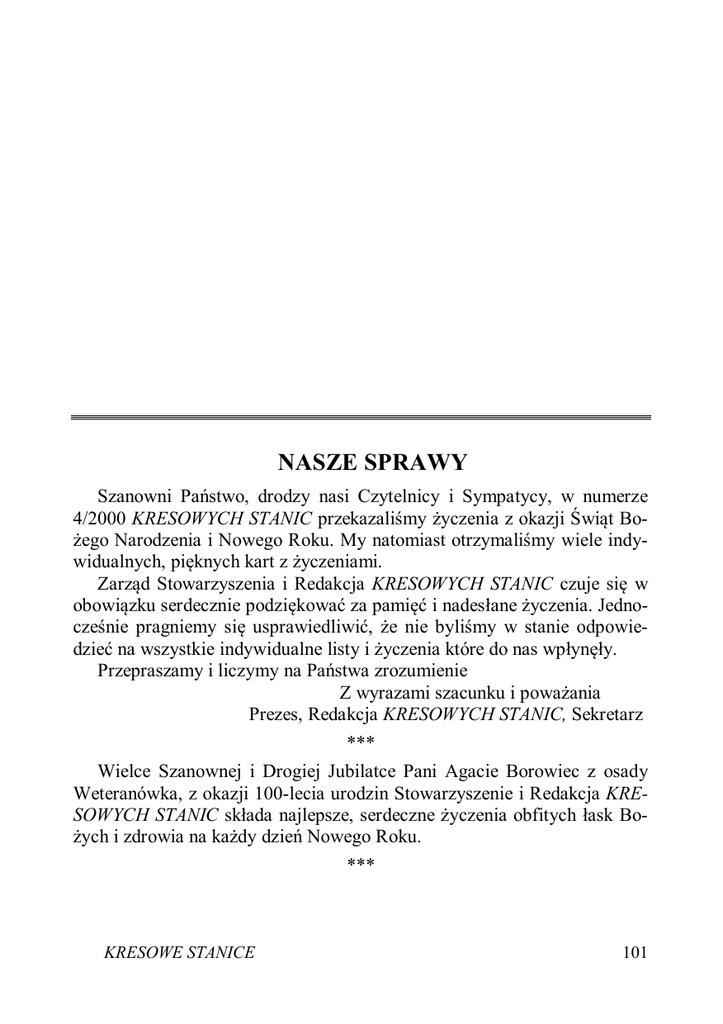 NASZE SPRAWY Szanowni Państwo, drodzy nasi Czytelnicy i Sympatycy, w numerze 4/2000 KRESOWYCH STANIC przekazaliśmy życzenia z okazji Świąt Bożego Narodzenia i Nowego Roku. My natomiast otrzymaliśmy wiele indywidualnych, pięknych kart z życzeniami. Zarząd Stowarzyszenia i Redakcja KRESOWYCH STANIC czuje się w obowiązku serdecznie podziękować za pamięć i nadesłane życzenia. Jednocześnie pragniemy się usprawiedliwić, że nie byliśmy w stanie odpowiedzieć na wszystkie indywidualne listy i życzenia które do nas wpłynęły. Przepraszamy i liczymy na Państwa zrozumienie Z wyrazami szacunku i poważania Prezes, Redakcja KRESOWYCH STANIC, Sekretarz *** Wielce Szanownej i Drogiej Jubilatce Pani Agacie Borowiec z osady Weteranówka, z okazji 100-lecia urodzin Stowarzyszenie i Redakcja KRESOWYCH STANIC składa najlepsze, serdeczne życzenia obfitych łask Bożych i zdrowia na każdy dzień Nowego Roku. *** KRESOWE STANICE 101 Dnia 21 listopada 2000 r. zmarła w Londynie córka generała „Zazy” – Zygmunta Podhorskiego Maria Janina z Podhorskich Bobińska ur. 24 VI 1928 r. w Grudziądzu, uczennica Sióstr Niepokalanek w Warszawie, żołnierz pomocniczej służby AK, ochotniczka PWSK, członek Zarządu Polskiego Ośrodka Katolickiego na Ealingu w Londynie, b. prezes koła Koleżeńskiego Zjednoczenia Jazłowieckiego w Londynie. Msza św. żałobna odbyła się 4 XII 2000 r. Prochy złożono do grobu Rodziców na cmentarzu w Brompton. Pani Maria Bobińska uczestniczyła w naszym poprzednim zjeździe jako gorliwa Krechowianka. W 4/2000 KRESOWYCH STANIC, na str. 94 jest Jej zdjęcie z ułanami Krechowieckimi. Cześć jej pamięci *** Witamy w naszym gronie nowych członków: Zofia Abramajtys – os. Nowosiółki gm. Roś pow. Wołkowysk córka osadnika, Polska Edward Gwiazdacz – os. Kaborowce gm. Zborów pow. Zborów Błażowa syn osadnika, Polska Witold Ursyn Niemcewicz – potomek osadników od wielu pokoleń, Polska *** 11 lutego 2001 roku o godzinie 1200 w kościele pod wezwaniem Matki Boskiej Loretańskiej na warszawskiej Pradze odprawiona została msza św. w intencji wszystkich pomordowanych i zmarłych osadników wojskowych i ich rodzin. Przypominamy, że przy głównym wejściu do kościoła znajduje się tablica upamiętniająca wszystkich pomordowanych i zmarłych na „Nieludzkiej ziemi”. Mszę zamówiła, jak co roku, pani Stanisława Terlikowska – członek naszego Stowarzyszenia. *** Dziękujemy serdecznie wnukowi osadnika z osady Sienkiewicze gm. Dederkały pow. Krzemieniec za hojny dar w kwocie 2500 zł – intencje tego daru są Jemu i nam znane. A oto pozostali darczyńcy: Elżbieta Ciszewska 12 zł, Halina Dobosz 6 zł, Zofia Dobrzyńska 2 zł, Bronisława Drozd 52 zł, Irena Glaas 12 zł, Alicja Hensel 2 zł, Józef Jankowski 12 zł, Wanda Jerzykiewicz 10 zł, Jerzy Junosza Kowalewski 52 zł, Zbigniew Krynicki 15 zł, Zygmunt Maguza 2 zł, Karolina Sarnowska 11 zł, 102 KRESOWE STANICE Bolesław Stramski 52 zł, Zbigniew Świrski 9 zł, Witold Ursyn Niemcewicz 50 zł, Janina Wojciechowska na kościół w Klecku 52 zł, Zygmunt Woś 52 zł, Kazimierz Zapałowicz 12 zł, Zygmunt Zarębski 2 zł. *** Zarząd Stowarzyszenia wraz z powołanym Komitetem Organizacyjnym III Światowego Zjazdu Osadników i Ich Rodzin informuje, że Przewodniczącym Komitetu został Włodzimierz Mikke. Do niniejszego numeru KRESOWYCH STANIC dołączamy KARTĘ ZGŁOSZENIA na Zjazd wraz ze szczegółową informacją o kosztach uczestnictwa. Szczegółowy program Zjazdu zamieścimy w nr 2/2001, który wydany będzie w połowie maja b.r. *** Polskie Towarzystwo Naukowe w Mińsku oraz Związek Polaków na Białorusi zorganizowały konferencję naukową nt. „Polacy na Białorusi: sytuacja społeczno-polityczna Polaków na terenach wschodnich II Rzeczypospolitej Polskiej w latach 1939-1941”. Konferencja odbyła się 21 października 2000 r w Grodnie. Do uczestnictwa zaproszono przedstawiciela naszego Stowarzyszenia A. Tomczyka, który na konferencji wygłosił referat o tematyce osadniczej. Podczas obrad wyrażono gotowość zorganizowania wespół z naszym Stowarzyszeniem analogicznej konferencji w Grodnie bądź w Mińsku w całości poświęconej problematyce osadniczej. Prosimy Czytelników o wypowiedzi w tej sprawie. *** Stowarzyszenie POLSKA-BIAŁORUŚ w Warszawie zorganizowało w dniu 24 stycznia 2001 r zebranie organizacyjne na które zostali imiennie zaproszeni J. Szuba i A. Tomczyk. Obydwaj przedstawiciele Stowarzyszenia są członkami założycielami Klubu Stołecznego Polska-Białoruś. Głównym zadaniem klubu będzie budowa zdrowego nurtu dobrosąsiedzkich stosunków polsko-białoruskich w oparciu o współczesne międzynarodowe normy współistnienia wolnych narodów. Do głównych zadań Klubu należeć będzie ujawnianie prawdy historycznej o stosunkach polskobiałoruskich. *** KRESOWE STANICE 103 Dnia 6 stycznia 2001 roku odbyło się spotkanie opłatkowe. W kawiarni klubu oficerskiego gościliśmy około 30 osób. Byli obecni goście spoza Warszawy. Nie zabrakło też młodego pokolenia wnuków i prawnuków osadników. Gospodynią spotkania była Pani Maria Rey. Po przełamaniu się opłatkiem i życzeniach pomyślności w Nowym Roku wszyscy wspólnie kolędowali. Fot. Zygmunt Zarębski *** Roczne Walne Zebranie Sprawozdawcze – odbędzie się dnia 24.03.2001 r w sobotę o godzinie 1000, w Klubie Oficerskim, w Warszawie przy ul Rakowieckiej 7 na II piętrze, w dużej sali konferencyjnej. Serdecznie i gorąco zapraszamy wszystkich członków naszego Stowarzyszenia. *** Przypominamy naszym członkom, że zebrania Zarządu są zebraniami otwartymi, na które wszystkich zapraszamy. Zebrania te odbywają się na II piętrze, w małej sali, w Klubie Oficerskim, w Warszawie przy ul Rakowieckiej 7, zawsze w ostatni poniedziałek miesiąca o godz. 1600. Wyjątkowo zebranie lutowe zostaje przesunięte na 1 marca 2001 r. Godzina pozostaje ta sama. 104 KRESOWE STANICE