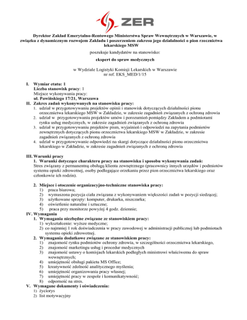 Dyrektor Zakład Emerytalno-Rentowego Ministerstwa Spraw Wewnętrznych w Warszawie, w związku z dynamicznym rozwojem Zakładu i poszerzeniem zakresu jego działalności o pion rzecznictwa lekarskiego MSW poszukuje kandydatów na stanowisko: ekspert do spraw medycznych w Wydziale Logistyki Komisji Lekarskich w Warszawie nr ref. EKS_MED/1/15 I. Wymiar etatu: 1 Liczba stanowisk pracy: 1 Miejsce wykonywania pracy: ul. Pawińskiego 17/21, Warszawa II. Zakres zadań wykonywanych na stanowisku pracy: 1. udział w przygotowywaniu projektów opinii i stanowisk dotyczących działalności pionu orzecznictwa lekarskiego MSW w Zakładzie, w zakresie zagadnień związanych z ochroną zdrowia 2. udział w przygotowywaniu projektów umów i porozumień pomiędzy Zakładem a podmiotami rynku usług medycznych, w zakresie zagadnień związanych z ochroną zdrowia 3. udział w przygotowywaniu projektów pism, wyjaśnień i odpowiedzi na zapytania podmiotów zewnętrznych dotyczących pionu orzecznictwa lekarskiego MSW w Zakładzie, w zakresie zagadnień związanych z ochroną zdrowia 4. udział w przygotowywanie odpowiedzi na skargi dotyczące działalności pionu orzecznictwa lekarskiego w Zakładzie, w zakresie zagadnień związanych z ochroną zdrowia III. Warunki pracy 1. Warunki dotyczące charakteru pracy na stanowisku i sposobu wykonywania zadań: Stres związany z permanentną obsługą klienta zewnętrznego (pracownicy innych urzędów i podmiotów systemu opieki zdrowotnej, osoby podlegające orzekaniu przez pion orzecznictwa lekarskiego oraz członkowie ich rodzin). 2. Miejsce i otoczenie organizacyjno-techniczne stanowiska pracy: 1) praca biurowa; 2) wymuszona pozycja ciała związana z wykonywaniem większości zadań w pozycji siedzącej; 3) użytkowane sprzęty: komputer, drukarka, niszczarka; 4) oświetlenie naturalne i sztuczne; 5) praca przy monitorze powyżej 4 godz. dziennie; IV. Wymagania 1. Wymagania niezbędne związane ze stanowiskiem pracy: 1) wykształcenie: wyższe medyczne; 2) co najmniej 1 rok doświadczenia w pracy zawodowej w administracji publicznej lub podmiotach systemu opieki zdrowotnej. 2. Wymagania dodatkowe związane ze stanowiskiem pracy: 1) znajomość rynku podmiotów ochrony zdrowia, w szczególności orzecznictwa lekarskiego, 2) znajomość marketingu usług i procedur medycznych 3) znajomość ustawy o komisjach lekarskich podległych ministrowi właściwemu do spraw wewnętrznych; 4) umiejętność obsługi pakietu MS Office; 5) kreatywność zdolność analitycznego myślenia; 6) umiejętność organizowania pracy własnej; 7) umiejętność pracy w zespole i komunikatywność; 8) odporność na stres. V. Wymagane dokumenty i oświadczenia: 1) życiorys 2) list motywacyjny 3) oświadczenie kandydata o wyrażeniu zgody na przetwarzanie danych osobowych do celów rekrutacji. VI. Termin składania dokumentów: 24.04.2015 r. VII. Miejsce składania dokumentów: Zakład Emerytalno-Rentowy Ministerstwa Spraw Wewnętrznych ul. Pawińskiego 17/21 02-106 Warszawa lub mailem na adres: [email protected], podając numer referencyjny VIII. Inne informacje: Zatrudnienie na podstawie ustawy z dnia 16 września 1982r. o pracownikach urzędów państwowych (Dz. U. z 2013r., poz. 269 z późn. zm.). Za dokumenty złożone w terminie, uważa się dokumenty nadane w urzędzie pocztowym lub przesłane drogą elektroniczną najpóźniej w ostatnim wskazanym w ogłoszeniu dniu. Odrzucone dokumenty aplikacyjne zostaną komisyjne zniszczone. Kandydaci zakwalifikowani do kolejnego etapu rekrutacji zostaną powiadomieni telefonicznie. Na kolejnym etapie rekrutacji konieczne będzie złożenie następujących dokumentów i oświadczeń: 1) oświadczenie kandydata o pełnej zdolności do czynności prawnych oraz o korzystaniu z pełni praw publicznych 2) kopie dokumentów potwierdzających wykształcenie 3) kopia dokumentu potwierdzającego posiadanie polskiego obywatelstwa lub oświadczenie o posiadaniu obywatelstwa polskiego 4) kopie świadectw pracy, zaświadczeń, np.: o odbytych stażach, wolontariatach, umowach zlecenia oraz innych dokumentów potwierdzających spełnianie wymagań niezbędnych i dodatkowych. Wymagane oświadczenia prosimy składać zgodnie ze wzorem zamieszczonym na stronie BIP ZER w zakładce Praca w ZER MSW > Dokumenty do pobrania http://www.zer.bip.msw.gov.pl/portal/zer/1043/5123/Oswiadczenie_kandydata.html. Zachęcamy osoby niepełnosprawne do przesyłania swoich dokumentów aplikacyjnych.