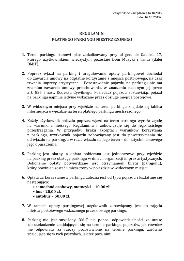 Załącznik do Zarządzenia Nr 8/2015 z dn. 16.10.2015r. REGULAMIN PŁATNEGO PARKINGU NIESTRZEŻONEGO 1. Teren parkingu stanowi plac zlokalizowany przy ul gen. de Gaulle’a 17, którego użytkownikiem wieczystym pozostaje Dom Muzyki i Tańca (dalej DMiT). 2. Poprzez wjazd na parking i uregulowanie opłaty parkingowej dochodzi do zawarcia umowy na odpłatne korzystanie z miejsca postojowego, na czas trwania imprezy artystycznej. Pozostawienie pojazdu na parkingu nie ma znamion zawarcia umowy przechowania, w znaczeniu nadanym jej przez art. 835 i nast. Kodeksu Cywilnego. Posiadacz pojazdu zostawiając pojazd na parkingu najmuje jedynie wskazane przez obsługę miejsce postojowe. 3. W widocznym miejscu przy wjeździe na teren parkingu znajduje się tablica informująca o wjeździe na teren płatnego parkingu niestrzeżonego. 4. Każdy użytkownik pojazdu poprzez wjazd na teren parkingu wyraża zgodę na warunki niniejszego Regulaminu i zobowiązuje się do jego ścisłego przestrzegania. W przypadku braku akceptacji warunków korzystania z parkingu, użytkownik pojazdu zobowiązany jest do powstrzymania się od wjazdu na parking, a w razie wjazdu na jego teren – do natychmiastowego jego opuszczenia. 5. Parking jest płatny, a opłata pobierana jest jednorazowo przy wjeździe na parking przez obsługę parkingu w dniach organizacji imprez artystycznych. Dokonanie opłaty potwierdzane jest otrzymaniem biletu (paragonu), który powinien zostać umieszczony w pojeździe w widocznym miejscu. 6. Opłata za korzystanie z parkingu zależna jest od typu pojazdu i kształtuje się następująco: • samochód osobowy, motocykl - 10,00 zł. • bus - 20,00 zł. • autobus - 50,00 zł. 7. W ramach opłaty parkingowej użytkownik zobowiązany jest do zajęcia miejsca postojowego wskazanego przez obsługę parkingu. 8. Parking nie jest strzeżony. DMiT nie ponosi odpowiedzialności za utratę lub uszkodzenie znajdujących się na terenie parkingu pojazdów, jak również nie odpowiada za rzeczy pozostawione na terenie parkingu, zarówno znajdujące się w tych pojazdach, jak też poza nimi. 9. Parking jest strefą ruchu i na jego terenie obowiązują przepisy ustawy prawo o ruchu drogowym (Dz. U. z 2012 r. poz. 1137 z późn. zm.) oraz maksymalna prędkość poruszania się pojazdów 10 km/h. 10. Osoba korzystająca z parkingu zobowiązana jest do przestrzegania znaków drogowych pionowych i poziomych oraz stosowania się do nakazów obsługi parkingu. 11. Obowiązuje bezwzględny zakaz wjazdu na parking pojazdów innych niż przeznaczone do przewozu osób, w szczególności przewożących materiały niebezpieczne, łatwopalne, żrące, wybuchowe oraz podobnego rodzaju. Użytkownik pojazdu odpowiada za wszelkie szkody na osobie i mieniu wynikłe w związku ze złamaniem powyższego zakazu. 12. Na terenie parkingu, drogach wewnętrznych oraz wjazdowych i wyjazdowych na parking zabronione jest: • naprawianie, mycie, odkurzanie samochodu, jak również wymiana lub uzupełnianie płynów eksploatacyjnych; • parkowanie na drodze dojazdowej w sposób utrudniający korzystanie z parkingu innym użytkownikom, • poruszanie się pojazdem po terenie parkingu w celu innym niż dojazd do miejsca postoju lub wyjazd z parkingu, • prowadzenie handlu oraz innych czynności usługowych lub komercyjnych bez zgody DMiT. 13. Użytkownicy parkingu zobowiązani są do: • zachowania czystości na terenie parkingu, • przestrzegania przepisów ppoż. i sanitarnych, • podporządkowania się poleceniom obsługi parkingu. 14. W przypadku niezgodnego z Regulaminem zaparkowania pojazdu, jeżeli ma to bezpośredni wpływ na bezpieczeństwo osób lub mienia, użytkownik wyraża zgodę na odholowanie pojazdu przez odpowiednie służby na koszt i ryzyko użytkownika. 15. Użytkownik pojazdu odpowiada za wszelkie szkody wyrządzone DMiT lub osobom trzecim na terenie parkingu lub wokół parkingu na zasadach ogólnych Kodeksu Cywilnego. 16. Wszelkie uwagi i zastrzeżenia dotyczące funkcjonowania parkingu należy zgłaszać do administracji DMiT tel. 32/271-56-41 wew. 42, e-mail [email protected] 17. Niniejszy Regulamin obowiązuje od 16 października 2015 r.