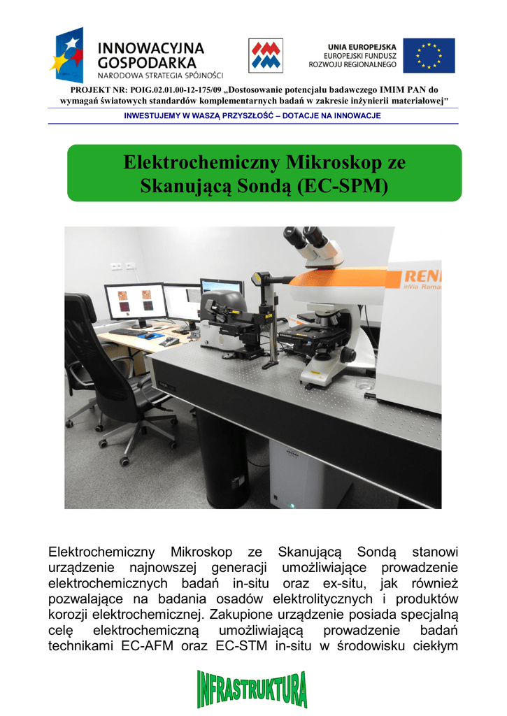 PROJEKT NR: POIG.02.01.00-12-175/09 „Dostosowanie potencjału badawczego IMIM PAN do wymagań światowych standardów komplementarnych badań w zakresie inżynierii materiałowej" INWESTUJEMY W WASZĄ PRZYSZŁOŚĆ – DOTACJE NA INNOWACJE Elektrochemiczny Mikroskop ze Skanującą Sondą (EC-SPM) Elektrochemiczny Mikroskop ze Skanującą Sondą stanowi urządzenie najnowszej generacji umożliwiające prowadzenie elektrochemicznych badań in-situ oraz ex-situ, jak również pozwalające na badania osadów elektrolitycznych i produktów korozji elektrochemicznej. Zakupione urządzenie posiada specjalną celę elektrochemiczną umożliwiającą prowadzenie badań technikami EC-AFM oraz EC-STM in-situ w środowisku ciekłym Elektrochemiczny Mikroskop ze Skanującą Sondą (EC-SPM) przy zastosowaniu zsynchronizowanego mikroskopu SPM (Innova firmy Bruker) z potencjostatem (VersaStat 3 firmy PAR). Aparatura umożliwia również badania składu chemicznego powierzchni osadów przez zastosowanie synchronizacji mikroskopu SPM ze spektrometrem ramanowskim (InVia f-my Renishaw). Dostępne są również tryby obrazowania fazowego, spektroskopii sił atomowych (w funkcji odległości ostrza od powierzchni), mikroskopii sił tarcia (lateralnych), nanoindentacji przy zastosowaniu diamentowej sondy AFM f-my MicroStar, nanolitografii przy wykorzystaniu programu NanoPlot, mikroskopii własności magnetycznych (MFM), mikroskopii sił elektrostatycznych (EFM), mikroskopii potencjału powierzchniowego (KPFM). Dostępny jest także zaawansowany tryb mikroskopii TERS, która wykorzystuje wzmocnienie sygnału ramanowskiego na specjalnej sondzie AFM/STM dla uzyskania podwyższonej rozdzielczości. Wyposażenie pozwala również na kontrolę kalibracji przy zastosowaniu certyfikowanej próbki firmy NanoSensors. Aparatura umożliwia badania próbek o średnicy do 40 mm i grubości do 18 mm w zakresie do 100 m dla XY oraz do 7.5 m w Z w trybach kontaktowym i bezkontaktowym AFM oraz w trybie STM. Aparatura umożliwia również na uzyskanie rozdzielczości atomowej oraz pozwala na analizę progów atomowych w trybie wysokorozdzielczym. Oprogramowanie do analizy obrazu NanoScope Analysis wspomaga korektę i analizę uzyskanych wyników takich jak chropowatość powierzchni, analiza cząsteczkowa itd. Baza danych widm ramanowskich substancji nieorganicznych kompatybilna z formatem rejestrowanych danych pozwala na identyfikację osadów produktów korozji oraz innych materiałów nieorganicznych. Potencjalne możliwości badawcze zakupionego urządzenia są bardzo duże i zostaną wykorzystane w badaniach prowadzonych w Pracowni Teorii Metalurgicznych IMIM PAN. Kontakt: Dr hab. Piotr Ozga, prof. PAN Instytut Metalurgii i Inżynierii Materiałowej Polska Akademia Nauk ul. Reymonta 25, 30-059 Kraków tel: +48 12 29 52 818; fax: +48 12 29 52 804; [email protected]