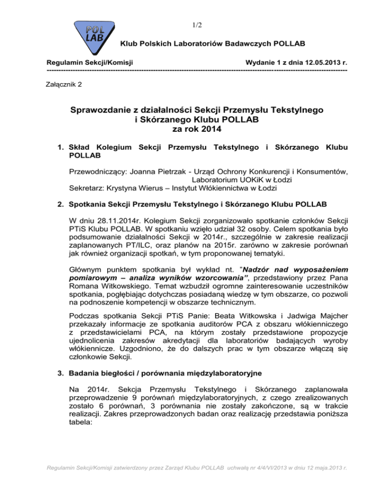 1/2 Klub Polskich Laboratoriów Badawczych POLLAB Regulamin Sekcji/Komisji Wydanie 1 z dnia 12.05.2013 r. ------------------------------------------------------------------------------------------------------------------------------Załącznik 2 Sprawozdanie z działalności Sekcji Przemysłu Tekstylnego i Skórzanego Klubu POLLAB za rok 2014 1. Skład Kolegium Sekcji Przemysłu Tekstylnego i Skórzanego Klubu POLLAB Przewodniczący: Joanna Pietrzak - Urząd Ochrony Konkurencji i Konsumentów, Laboratorium UOKiK w Łodzi Sekretarz: Krystyna Wierus – Instytut Włókiennictwa w Łodzi 2. Spotkania Sekcji Przemysłu Tekstylnego i Skórzanego Klubu POLLAB W dniu 28.11.2014r. Kolegium Sekcji zorganizowało spotkanie członków Sekcji PTiS Klubu POLLAB. W spotkaniu wzięło udział 32 osoby. Celem spotkania było podsumowanie działalności Sekcji w 2014r., szczególnie w zakresie realizacji zaplanowanych PT/ILC, oraz planów na 2015r. zarówno w zakresie porównań jak również organizacji spotkań, w tym proponowanej tematyki. Głównym punktem spotkania był wykład nt. ”Nadzór nad wyposażeniem pomiarowym – analiza wyników wzorcowania”, przedstawiony przez Pana Romana Witkowskiego. Temat wzbudził ogromne zainteresowanie uczestników spotkania, pogłębiając dotychczas posiadaną wiedzę w tym obszarze, co pozwoli na podnoszenie kompetencji w obszarze technicznym. Podczas spotkania Sekcji PTiS Panie: Beata Witkowska i Jadwiga Majcher przekazały informacje ze spotkania auditorów PCA z obszaru włókienniczego z przedstawicielami PCA, na którym zostały przedstawione propozycje ujednolicenia zakresów akredytacji dla laboratoriów badających wyroby włókiennicze. Uzgodniono, że do dalszych prac w tym obszarze włączą się członkowie Sekcji. 3. Badania biegłości / porównania międzylaboratoryjne Na 2014r. Sekcja Przemysłu Tekstylnego i Skórzanego zaplanowała przeprowadzenie 9 porównań międzylaboratoryjnych, z czego zrealizowanych zostało 6 porównań, 3 porównania nie zostały zakończone, są w trakcie realizacji. Zakres przeprowadzonych badan oraz realizację przedstawia poniższa tabela: Regulamin Sekcji/Komisji zatwierdzony przez Zarząd Klubu POLLAB uchwałą nr 4/4/VI/2013 w dniu 12 maja.2013 r. 2/2 Klub Polskich Laboratoriów Badawczych POLLAB Regulamin Sekcji/Komisji Wydanie 1 z dnia 12.05.2013 r. ------------------------------------------------------------------------------------------------------------------------------TEMAT BADANIA BIEGŁOŚCI/ PORÓWNANIA MIĘDZYLABORATORYJNEGO Potwierdzenie realizacji Wyznaczanie siły rozdzierania metodą wahadła balistycznego wg PN-EN ISO 13937-1:2002 Wyznaczanie wynikowej całkowitej izolacyjności cieplnej wg PN-EN ISO 15831:2006 Wyznaczanie maksymalnej siły i wydłużenia maksymalnego metodą paska wg PN – EN ISO 13934-1:2013 Płaskie wyroby tekstylne powleczone gumą lub tworzywami sztucznymi - Wyznaczanie odporności na uszkodzenie przy zginaniu” metoda A de Mattia wg PN-EN ISO 7854:2002 Wyznaczanie zmiany wymiarów po praniu i suszeniu” wg PN-EN ISO 5077:2011 Wyznaczenie zawartości włókien lnianych w mieszance z włóknami poliamidowymi wg PN-93/P-04851 lub metoda nr 3 zgodnie z Zał. VII Rozporządzenia Parlamentu Europejskiego i Rady (UE) nr 1007/2011 z dnia 27 września 2011r. Oznaczanie pH ekstraktów wodnych wyrobów włókienniczych wg PN-EN ISO 3071:2007 Oznaczenia splotów tkackich wg PN-P-01701:1952P Metody badań wskaźników fizycznych. Dziane artykuły medyczne. Bandaże elastyczne - Codoban wg PN-P04993:1989P w trakcie realizacji w trakcie realizacji w trakcie realizacji zrealizowane zrealizowane zrealizowane zrealizowane zrealizowane zrealizowane 4. Wyjazdy zagraniczne Nie realizowano. 5. Planowane działania Sekcji Przemysłu Tekstylnego i Skórzanego Klubu POLLAB na kolejny rok Sekcja Przemysłu Tekstylnego i Skórzanego Klubu POLLAB w 2015r. planuje kontynuację działalności w zakresie przeprowadzania PT/ILC w obszarze wyrobów włókienniczych w odniesieniu do metod badawczych, które interesują Członków Sekcji. Kolegium Sekcji planuje również organizację spotkań szkoleniowych Członków Sekcji obejmujących tematykę zarówno merytoryczną z zakresu badań wyrobów włókienniczych jak również z zakresu systemu zarządzania. Szczegółowe informacje dotyczące organizacji spotkań oraz tematy PT/ILC zostały ujęte w Planie działalności Sekcji PTiS na 2015r., stanowiącym załącznik do Sprawozdania. Przewodnicząca Sekcji 31.12.2014r. Joanna Pietrzak Załącznik nr 1 do Procedury KPLB nr 2 – Plan działalności na 2015r. Regulamin Sekcji/Komisji zatwierdzony przez Zarząd Klubu POLLAB uchwałą nr 4/4/VI/2013 w dniu 12 maja.2013 r.