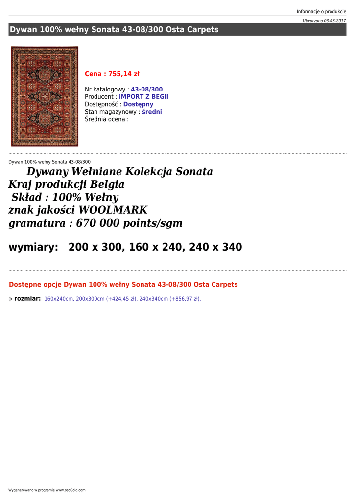 Informacje o produkcie Utworzono 03-03-2017 Dywan 100% wełny Sonata 43-08/300 Osta Carpets Cena : 755,14 zł Nr katalogowy : 43-08/300 Producent : iMPORT Z BEGII Dostępność : Dostępny Stan magazynowy : średni Średnia ocena : Dywan 100% wełny Sonata 43-08/300 Dywany Wełniane Kolekcja Sonata Kraj produkcji Belgia Skład : 100% Wełny znak jakości WOOLMARK gramatura : 670 000 points/sgm wymiary: 200 x 300, 160 x 240, 240 x 340 Dostępne opcje Dywan 100% wełny Sonata 43-08/300 Osta Carpets » rozmiar: 160x240cm, 200x300cm (+424,45 zł), 240x340cm (+856,97 zł). Wygenerowano w programie www.oscGold.com