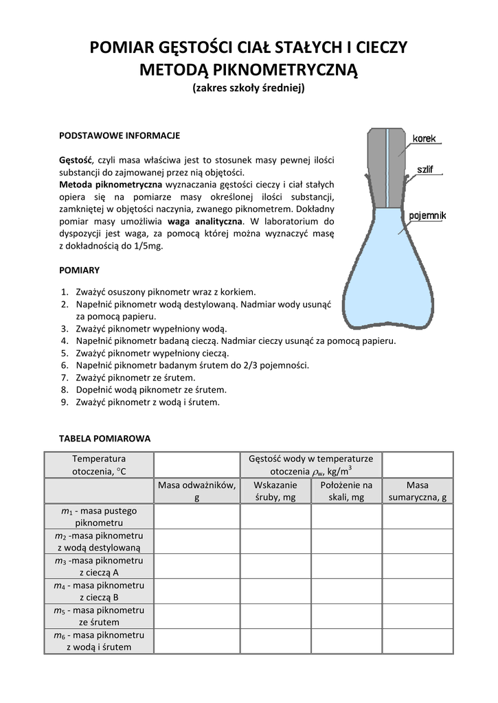 pomiar gęstości ciał stałych i cieczy metodą piknometryczną