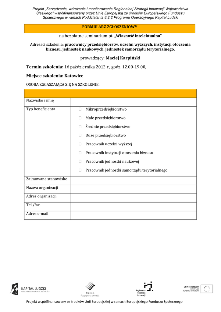Projekt „Zarządzanie, wdrażanie i monitorowanie Regionalnej Strategii Innowacji Województwa Śląskiego” współfinansowany przez Unię Europejską ze środków Europejskiego Funduszu Społecznego w ramach Poddziałania 8.2.2 Programu Operacyjnego Kapitał Ludzki FORMULARZ ZGŁOSZENIOWY na bezpłatne seminarium pt. „Własność intelektualna” Adresaci szkolenia: pracownicy przedsiębiorstw, uczelni wyższych, instytucji otoczenia biznesu, jednostek naukowych, jednostek samorządu terytorialnego. prowadzący: Maciej Karpiński Termin szkolenia: 16 października 2012 r., godz. 12.00-19.00, Miejsce szkolenia: Katowice OSOBA ZGŁASZAJĄCA SIĘ NA SZKOLENIE: Nazwisko i imię Typ beneficjenta Mikroprzedsiębiorstwo Małe przedsiębiorstwo Średnie przedsiębiorstwo Duże przedsiębiorstwo Pracownik uczelni wyższej Pracownik instytucji otoczenia biznesu Pracownik jednostki naukowej Pracownik jednostki samorządu terytorialnego Zajmowane stanowisko Nazwa organizacji Adres organizacji Tel./fax. Adres e-mail Projekt współfinansowany ze środków Unii Europejskiej w ramach Europejskiego Funduszu Społecznego Projekt „Zarządzanie, wdrażanie i monitorowanie Regionalnej Strategii Innowacji Województwa Śląskiego” współfinansowany przez Unię Europejską ze środków Europejskiego Funduszu Społecznego w ramach Poddziałania 8.2.2 Programu Operacyjnego Kapitał Ludzki Proszę zaznaczyć 4 interesujące tematy, które należy przedstawić na seminarium Patenty i wzory użytkowe Znaki towarowe Wzory przemysłowe Prawa autorskie Poszukiwanie w bazach UP RP i EPO Umowy know-how, umowy wspólności prawa do patentu i umowy licencyjne Tworzenie opisu patentowego Komercjalizacja rozwiązań Wypełniony formularz prosimy przesłać na adres: [email protected] najpóźniej do dnia 11.10.2012 r. do godz.15.00 Projekt współfinansowany ze środków Unii Europejskiej w ramach Europejskiego Funduszu Społecznego Projekt „Zarządzanie, wdrażanie i monitorowanie Regionalnej Strategii Innowacji Województwa Śląskiego” współfinansowany przez Unię Europejską ze środków Europejskiego Funduszu Społecznego w ramach Poddziałania 8.2.2 Programu Operacyjnego Kapitał Ludzki Informacje organizacyjne Przesłanie wypełnionego formularza jest zobowiązaniem do udziału w szkoleniu. Przesłanie formularza jest równoznaczne z wyrażeniem zgody na przetwarzanie danych osobowych dla potrzeb niezbędnych dla realizacji procesu rekrutacji na szkolenie. Szkolenie jest skierowane do pracowników przedsiębiorstw mających siedzibę na terenie województwa śląskiego oraz pracowników: uczelni wyższych, instytucji otoczenia biznesu, jednostek samorządu terytorialnego, jednostek naukowych z województwa śląskiego. Pracownicy zatrudnieni w jednym miejscu pracy (u jednego pracodawcy) stanowią nie więcej niż 20% uczestników szkolenia realizowanego w ramach danego projektu. Organizatorzy zapewniają uczestniczkom/ uczestnikom wyżywienie. Termin nadsyłania zgłoszeń do 11.10.2012 do godz.15.00 informacja o zakwalifikowaniu do 12.10.2012. Uprzejmie informujemy, że skontaktujemy się wyłącznie z osobami zakwalifikowanymi. Uczestniczki/uczestnicy szkolenia otrzymają materiały szkoleniowe oraz zaświadczenia potwierdzające udział w szkoleniu. Wszelkich informacji na temat szkolenia udziela Katarzyna Kowol tel. 032 335 85 40, e-mail: [email protected] Projekt współfinansowany ze środków Unii Europejskiej w ramach Europejskiego Funduszu Społecznego