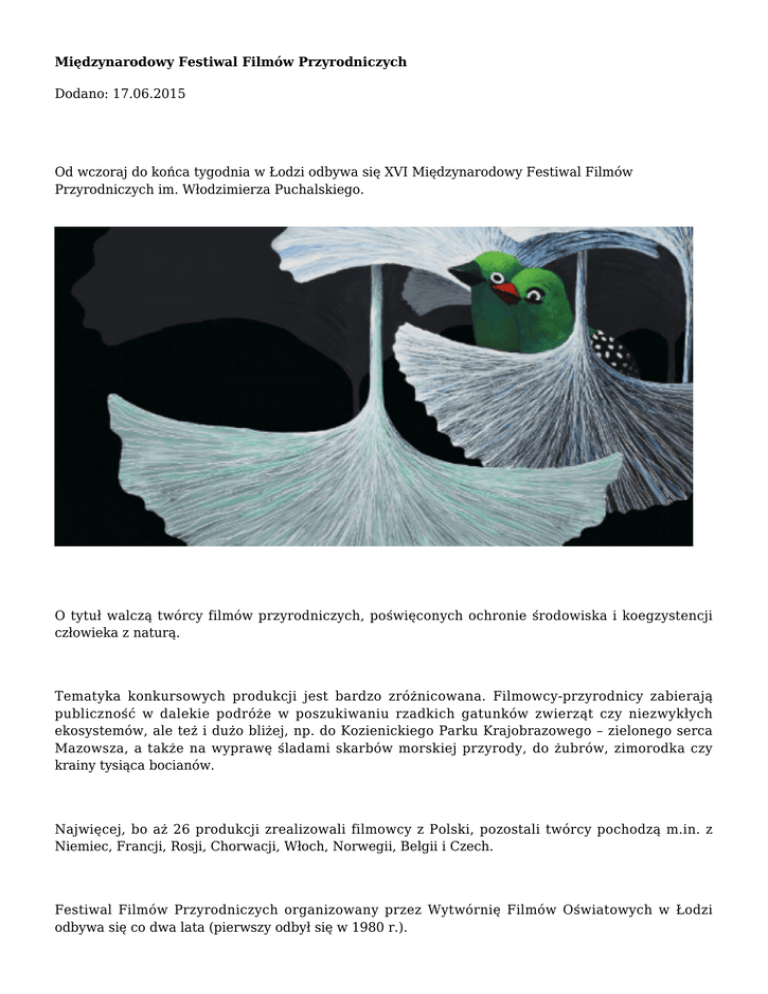 Międzynarodowy Festiwal Filmów Przyrodniczych Dodano: 17.06.2015 Od wczoraj do końca tygodnia w Łodzi odbywa się XVI Międzynarodowy Festiwal Filmów Przyrodniczych im. Włodzimierza Puchalskiego. O tytuł walczą twórcy filmów przyrodniczych, poświęconych ochronie środowiska i koegzystencji człowieka z naturą. Tematyka konkursowych produkcji jest bardzo zróżnicowana. Filmowcy-przyrodnicy zabierają publiczność w dalekie podróże w poszukiwaniu rzadkich gatunków zwierząt czy niezwykłych ekosystemów, ale też i dużo bliżej, np. do Kozienickiego Parku Krajobrazowego – zielonego serca Mazowsza, a także na wyprawę śladami skarbów morskiej przyrody, do żubrów, zimorodka czy krainy tysiąca bocianów. Najwięcej, bo aż 26 produkcji zrealizowali filmowcy z Polski, pozostali twórcy pochodzą m.in. z Niemiec, Francji, Rosji, Chorwacji, Włoch, Norwegii, Belgii i Czech. Festiwal Filmów Przyrodniczych organizowany przez Wytwórnię Filmów Oświatowych w Łodzi odbywa się co dwa lata (pierwszy odbył się w 1980 r.). Program imprezy w pliku pdf. Komentarze (0) Nie dodano jeszcze żadnego komentarza.