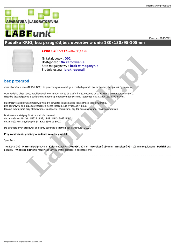 Informacje o produkcie Utworzono 19-08-2013 Pudełko KRIO, bez przegród,bez otworów w dnie 130x130x95-105mm Nr katalogowy : D02 Dostępność : Na zamówienie Stan magazynowy : brak w magazynie Średnia ocena : brak recenzji bez przegród pl Cena : 40,59 zł (netto: 33,00 zł) k. - bez otworów w dnie (Nr.Kat. D02): do przechowywania ciekłych i małych próbek, jak mrówki czy też piasek (granulaty) GLW Pudełko plastikowe, autoklawowalne w temperaturze do 121°C i przeznaczone do zamrażania do temperatury -90°C. Nasadka jest połączona z pudełkiem za pomocą innowacyjnego systemu łączącego na zatrzask (bez użycia kleju). un Przezroczysta pokrywka umożliwia wgląd w zawartość pudełka bez konieczności jego otwierania. Bez otworów w dnie przepuszczających ciecze (szczelne do wysokości 40 mm) Idealne rozwiązanie przy składowaniu, transporcie, zamrażaniu czy też autoklawowaniu Państwa probówek. Dostosowane statywy GLW ze stali nierdzewnej do zamrażarek (Nr.Kat.: U932 i U933, U942 i U943, E932 i E942) do zamrażarek skrzyniowych (Nr.Kat.: E904 do E907) Do światłoczułych probówek polecamy całkowicie czarne pudełka (Nr.Kat.: DS02). Spec Tech: bf Przy zamówieniu prosimy o podanie kolorów pudełek La Nr.Kat.: D02 Materiał polipropylen Kolor naturalny Długość 130 mm Szerokość 130 mm Wysokość 95 - 105 mm regulowana Podział bez podziału Wielkość komórki możliwość użytku kratki dzielącej z polipropylenu Wygenerowano w programie www.oscGold.com