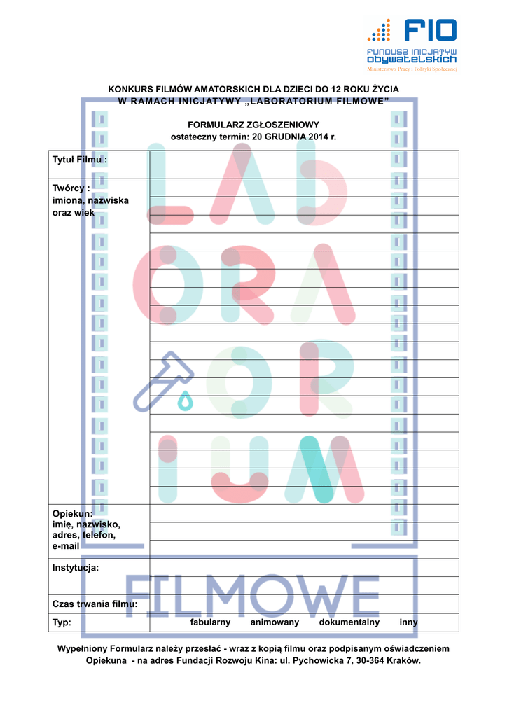 KONKURS FILMÓW AMATORSKICH DLA DZIECI DO 12 ROKU ŻYCIA W R AM AC H INICJ ATY WY „L ABOR ATORIUM FILMOWE” FORMULARZ ZGŁOSZENIOWY ostateczny termin: 20 GRUDNIA 2014 r. Tytuł Filmu : Twórcy : imiona, nazwiska oraz wiek Opiekun: imię, nazwisko, adres, telefon, e-mail Instytucja: Czas trwania filmu: Typ: fabularny animowany dokumentalny inny Wypełniony Formularz należy przesłać - wraz z kopią filmu oraz podpisanym oświadczeniem Opiekuna - na adres Fundacji Rozwoju Kina: ul. Pychowicka 7, 30-364 Kraków.