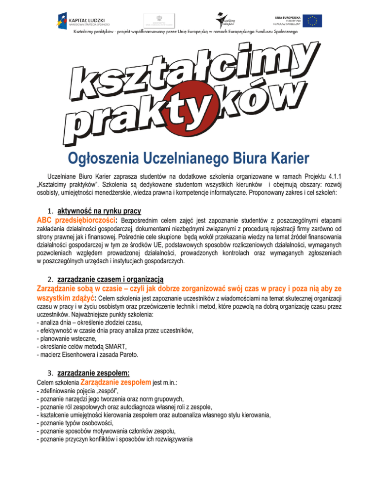 Ogłoszenia Uczelnianego Biura Karier Uczelniane Biuro Karier zaprasza studentów na dodatkowe szkolenia organizowane w ramach Projektu 4.1.1 „Kształcimy praktyków”. Szkolenia są dedykowane studentom wszystkich kierunków i obejmują obszary: rozwój osobisty, umiejętności menedŜerskie, wiedza prawna i kompetencje informatyczne. Proponowany zakres i cel szkoleń: 1. aktywność na rynku pracy ABC przedsiębiorczości: Bezpośrednim celem zajęć jest zapoznanie studentów z poszczególnymi etapami zakładania działalności gospodarczej, dokumentami niezbędnymi związanymi z procedurą rejestracji firmy zarówno od strony prawnej jak i finansowej. Pośrednie cele skupione będą wokół przekazania wiedzy na temat źródeł finansowania działalności gospodarczej w tym ze środków UE, podstawowych sposobów rozliczeniowych działalności, wymaganych pozwoleniach względem prowadzonej działalności, prowadzonych kontrolach oraz wymaganych zgłoszeniach w poszczególnych urzędach i instytucjach gospodarczych. 2. zarządzanie czasem i organizacją Zarządzanie sobą w czasie – czyli jak dobrze zorganizować swój czas w pracy i poza nią aby ze wszystkim zdąŜyć: Celem szkolenia jest zapoznanie uczestników z wiadomościami na temat skutecznej organizacji czasu w pracy i w Ŝyciu osobistym oraz przećwiczenie technik i metod, które pozwolą na dobrą organizację czasu przez uczestników. NajwaŜniejsze punkty szkolenia: - analiza dnia – określenie złodziei czasu, - efektywność w czasie dnia pracy analiza przez uczestników, - planowanie wsteczne, - określanie celów metodą SMART, - macierz Eisenhowera i zasada Pareto. 3. zarządzanie zespołem: Celem szkolenia Zarządzanie zespołem jest m.in.: - zdefiniowanie pojęcia „zespół”, - poznanie narzędzi jego tworzenia oraz norm grupowych, - poznanie ról zespołowych oraz autodiagnoza własnej roli z zespole, - kształcenie umiejętności kierowania zespołem oraz autoanaliza własnego stylu kierowania, - poznanie typów osobowości, - poznanie sposobów motywowania członków zespołu, - poznanie przyczyn konfliktów i sposobów ich rozwiązywania 4. zarządzanie zasobami ludzkimi Zarządzanie Zasobami Ludzkimi w przedsiębiorstwie: Poznanie i przećwiczenie kluczowych narzędzi wykorzystywanych w procesie zarządzania zasobami ludzkimi w przedsiębiorstwie: - rozwój wiedzy na temat roli i zadań menedŜera, - poznanie kluczowych narzędzi w pracy menedŜera, - przećwiczenie róŜnych typów rozmów z pracownikami, - rozwój umiejętności dopasowania stylu zarządzania do pracowników. 5. warsztaty menedŜerskie Motywacja – klucz do sukcesu: Celem szkolenia jest poszerzenie wiedzy uczestników z zakresu motywacji oraz automotywacji przydatnej w Ŝyciu zawodowym i osobistym. Uczestnicy szkolenia przećwiczą wybrane techniki i metody motywowania oraz określą własny styl komunikacji i metody automotywacyjne. NajwaŜniejsze punkty szkolenia: - techniki motywacji, - motywacja pozytywna i negatywna, - motywatory i de motywatory, - wyznaczenie celów wg zasady SMART - style komunikacji społecznej w kontekście motywacji 6. zarządzanie projektem Profesjonalne Zarządzanie Projektami w Organizacji: Celem szkolenia jest przedstawienie uczestnikom rozwiązań zmierzających do organizowania projektu i jego właściwego wsparcia oraz dostarczenie uczestnikom niezbędnych umiejętności kompleksowego i skutecznego zarządzania projektem. Korzyści dla Uczestników szkolenia: - poznanie zasad tworzenia i realizacji projektów, - zdobycie wiedzy jak pozycjonować własny projekt względem potrzeb firmy i oczekiwań klientów, - wzrost kluczowych dla sukcesu projektu umiejętności i kompetencji komunikacyjnych: a) wewnętrznych (zarządzania zespołem), b) oraz zewnętrznych (komunikacja z Klientami oraz z Partnerami), - poznanie praktyczne sposoby radzenia sobie z trudnymi klientami, - zdobycie wiedzy jak reagować w niespodziewanych sytuacjach kryzysowych. 7. komunikacja interpersonalna i asertywność Asertywność – czyli jak być prymusem w szkole Ŝycia: Celem szkolenia jest przekazanie uczestnikom wiedzy na temat asertywności w pełnym wymiarze. Poszerzenie wiedzy o mniej znane obszary z tej dziedziny. Przećwiczenie technik i metod związanych z asertywnością wykorzystywaną w Ŝyciu zawodowym i prywatnym. NajwaŜniejsze punkty szkolenia: - „Mapa asertywność” – określenie swojej asertywności przez uczestników, - asertywna odmowa, - udzielanie konstruktywnej krytyki i przyjmowanie krytyki, - udzielanie konstruktywnej pochwały, - wyraŜanie emocji pozytywnych i negatywnych, - wyraŜanie własnych oczekiwań, próśb, interesów. Komunikacja - czyli jak dobrze kontaktować się z innymi w firmie i poza nią: Celem szkolenia jest zapoznanie uczestników z zasadami poprawnej i efektywnej komunikacji oraz przećwiczenie z nimi wybranych technik i metod z tego zakresu. NajwaŜniejsze punkty szkolenia: - autodiagnoza stylu komunikacji uczestników + omówienie pozostałych, - rola grupowa jej określenie oraz znacznie, - komunikacja werbalna i niewerbalna, - aktywne słuchanie, - styl i strój. 8. PR w praktyce Celem szkolenia Kształtowanie wizerunku oraz działania Public Relations w małej i średniej firmie jest praktyczne poznanie: narzędzi kształtowania pozytywnego wizerunku, praktycznych aspektów promocji i PR, wykorzystywanych strategii promocji, jak promować i dbać o wizerunek nowopowstałej firmy. Szkolenie jest oparte o wiedzę praktyczną, model warsztatowy, analizy przykładów, ćwiczenia praktyczne. Promocja i PR w Hotelu (nie tylko) Celem szkolenia jest zapoznanie uczestników z wiedzą na temat efektownego wykorzystania dostępnych środków promocyjnych, reklamowych i PR w celu promowania i budowania pozytywnego wizerunku obiektu hotelowego oraz przećwiczenie wybranych technik i zastosowania wybranych narzędzi. NajwaŜniejsze punkty szkolenia: - analiza dostępnych pól r
