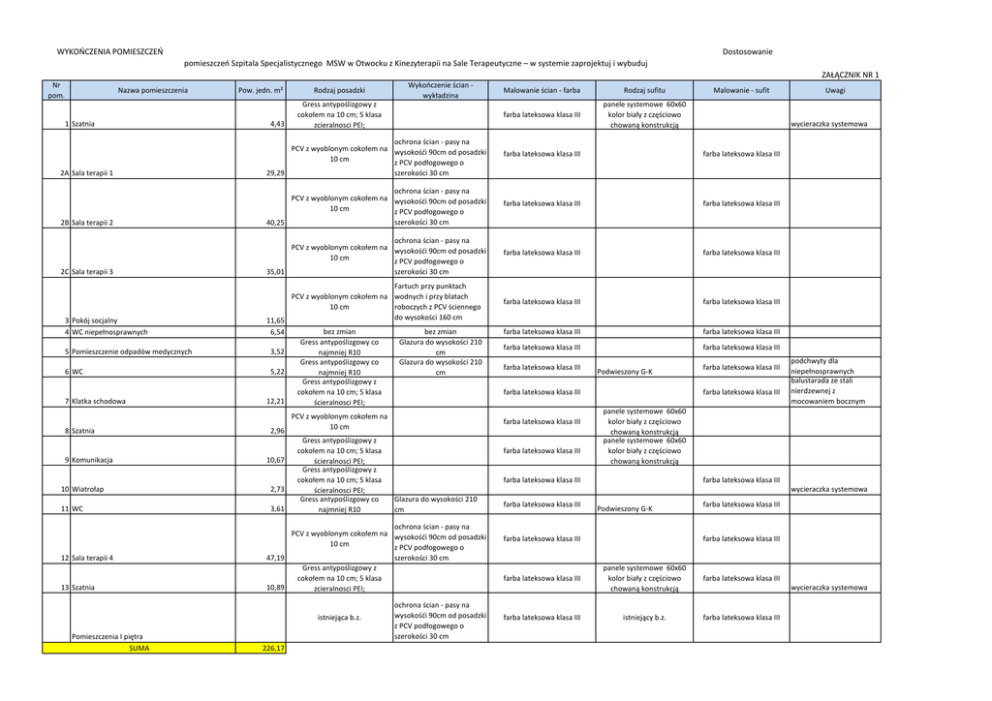 ZAŁĄCZNIK NR 1 WYKOŃCZENIA POMIESZCZEŃ Dostosowanie